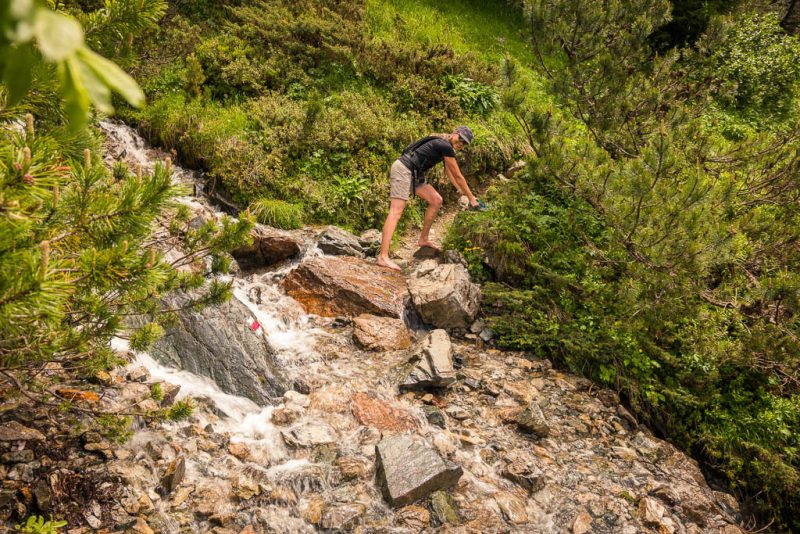Auf halben Weg nach oben muss ein Bach überquert werden. Normalerweise sicherlich kein Problem, aber durch die Regenfälle der letzten Zeit ist ein sehr großer Schritt notwendig, um auf die andere Seite zu kommen. Oder aber ein vorsichtiges Herantasten: