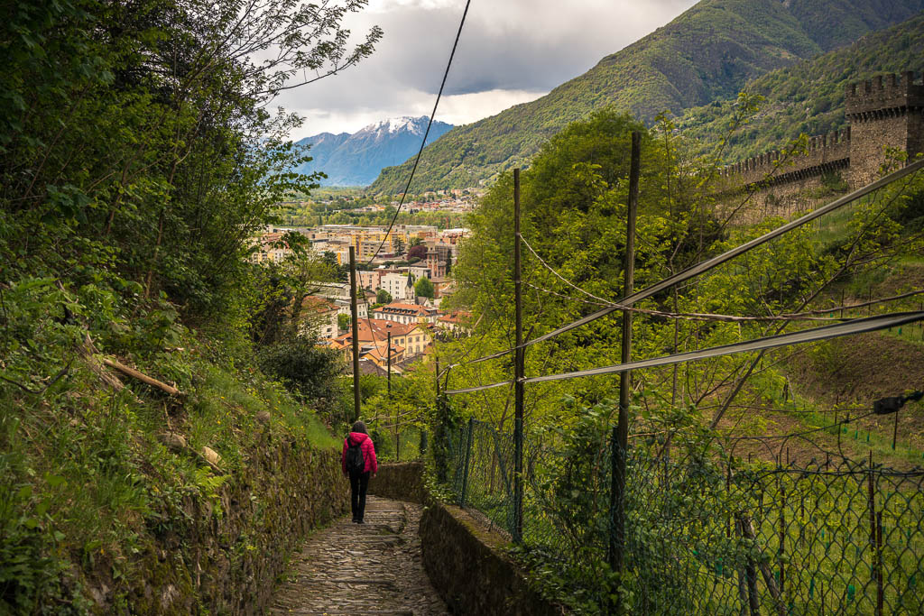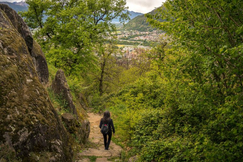 Die Plattform wird rege besucht, deshalb halten wir uns hier nicht lange auf und machen uns schon bald wieder auf den Weg nach unten. Nicht nur zum Fuße der Plattform, sondern ganz nach unten zum Rhein! Zu Beginn ist der Weg breit und mäßig steil, erst auf den letzten fünfhundert Metern wird er schmaler und steiler. Schließlich liegt die Eisenbahnbrücke vor uns, über die auch der Wanderweg führt: