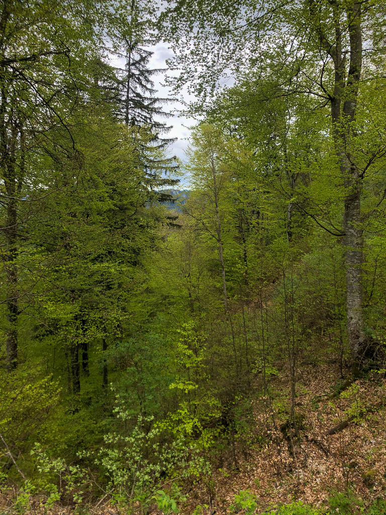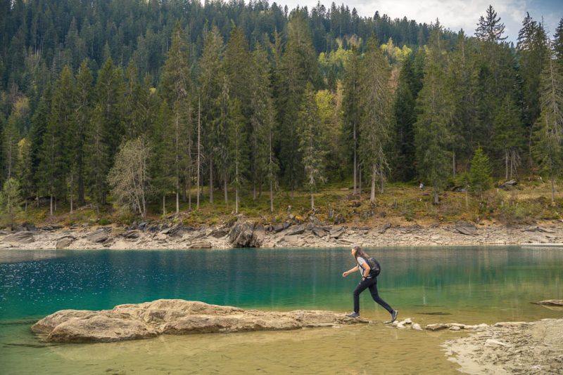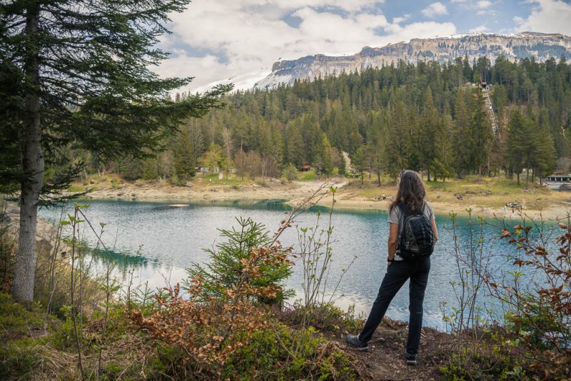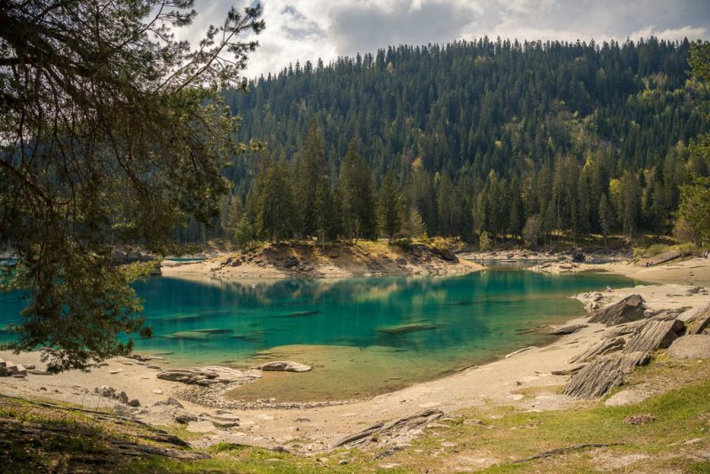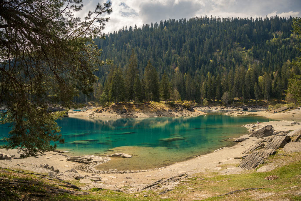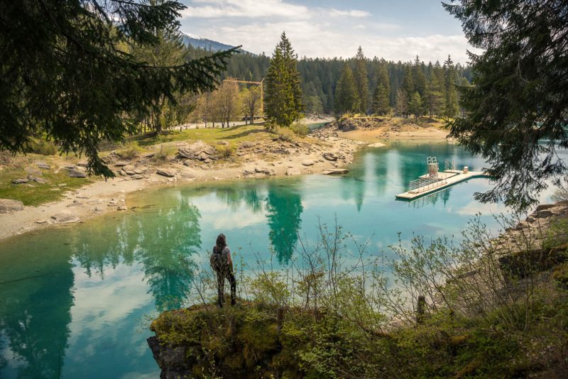 Rund um Flims liegen vier Seen, der „Lag Prau Pulté“, der „Lag Prau Tuleritg“, der Caumasee und der Crestasee. Die letzten beiden sind Badeseen, die ersten beiden liegen im Winter und Frühjahr trocken. Tatsächlich ist kann man heute nur erahnen, wo der „Lag Prau Tuleritg“ liegt. Anders sieht das beim Caumasee aus, er leuchtet trotz niedrigem Wasserstand schon vom Wanderweg aus eindrucksvoll zwischen den Bäumen hervor: