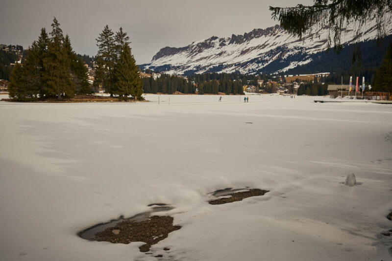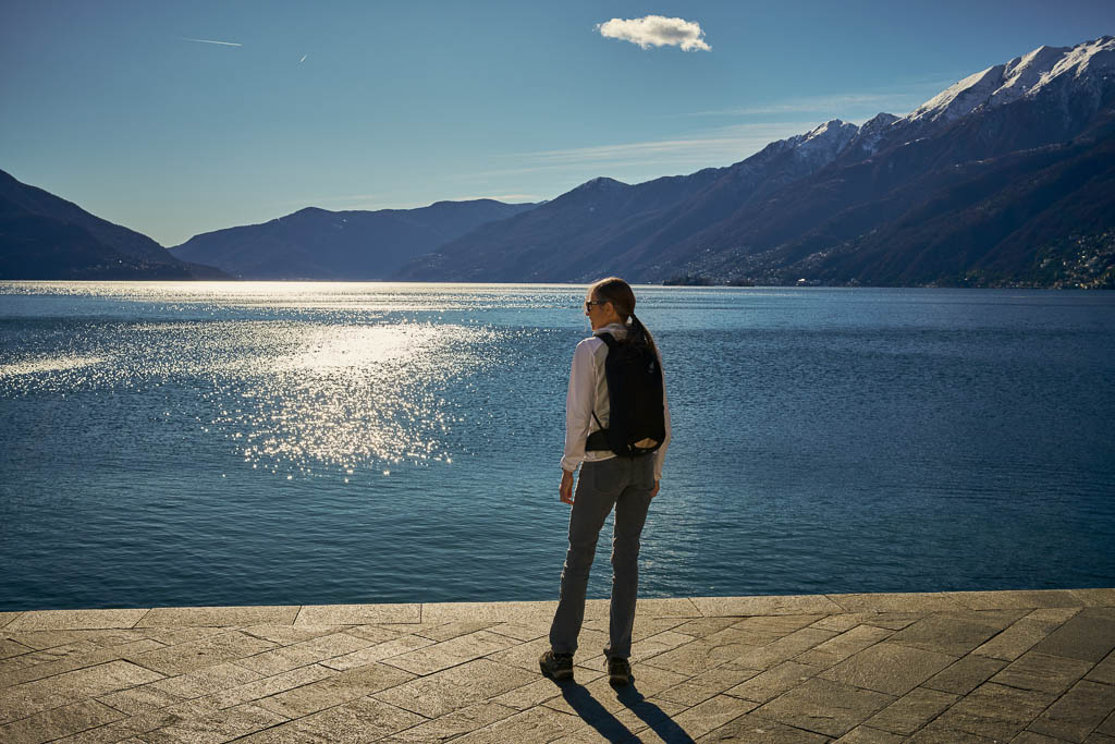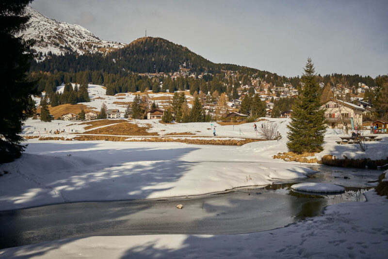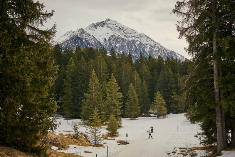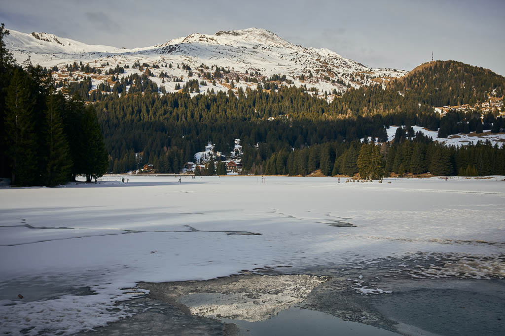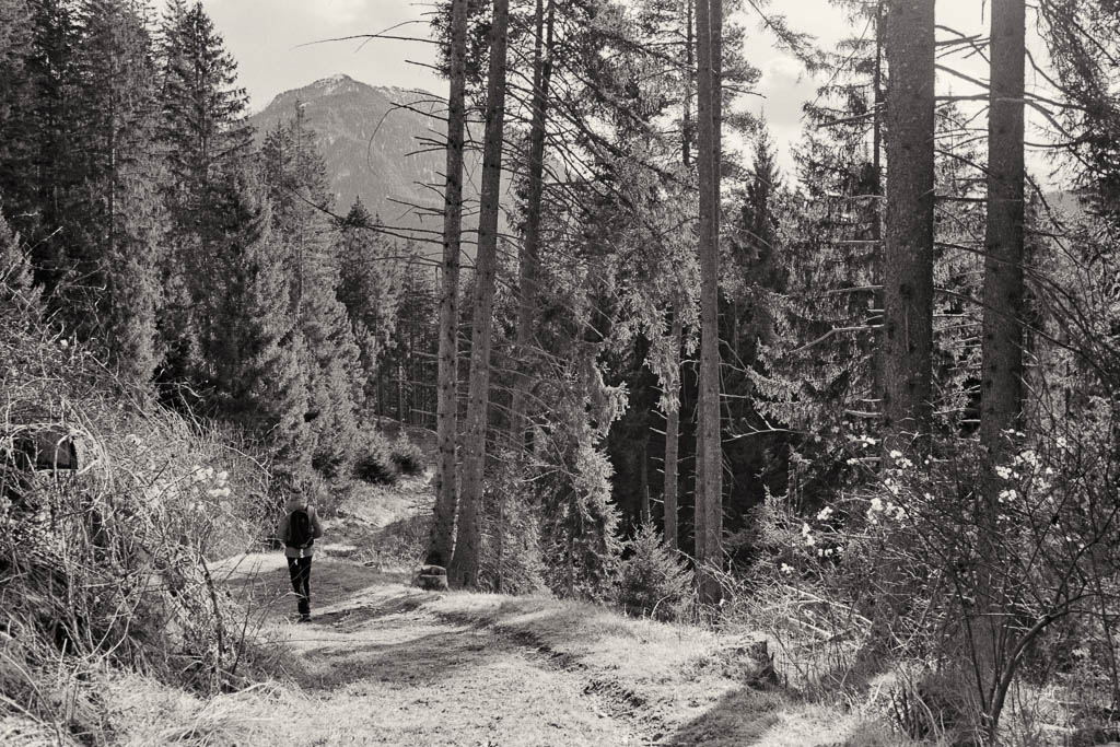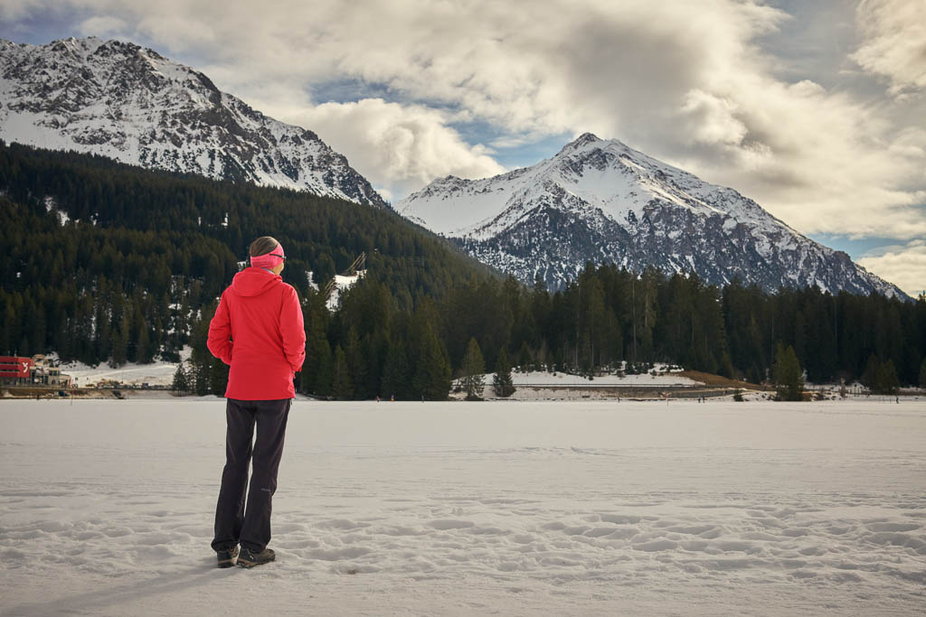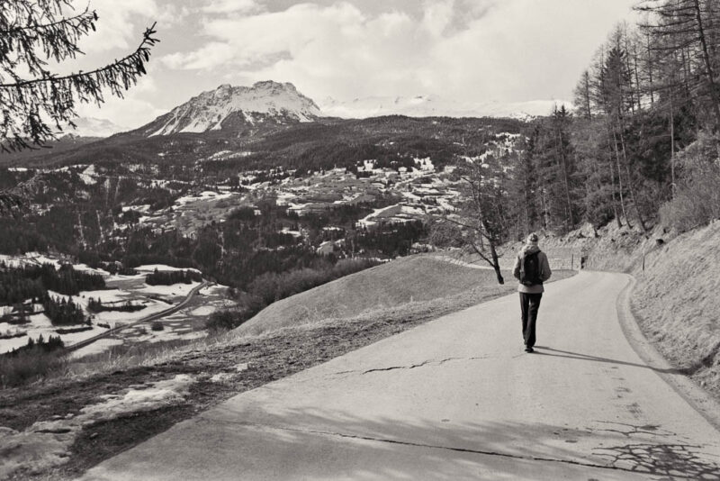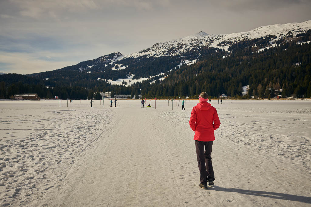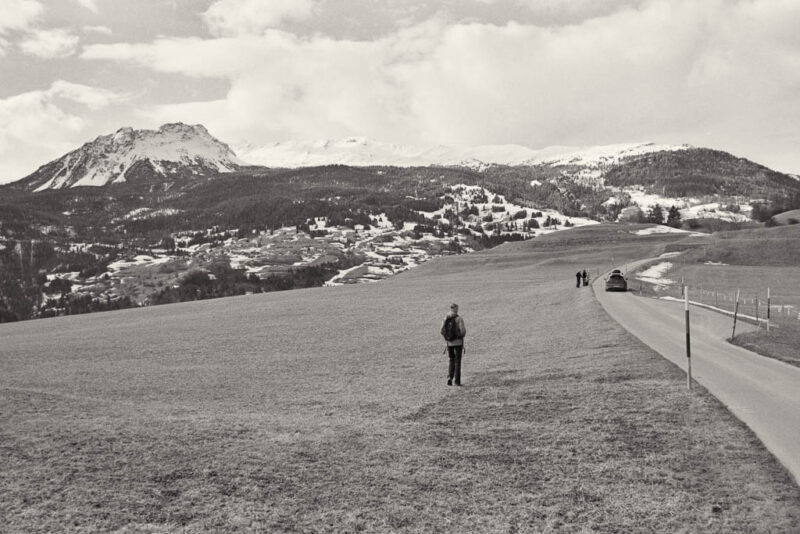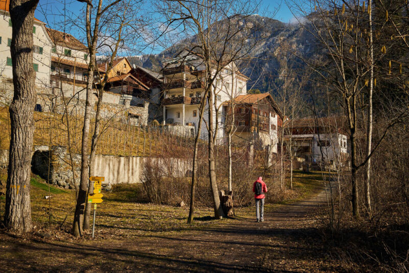 Von Sils aus folgen wir den Wegweisern nach St. Cassian. Ein Blick zurück auf Sils: