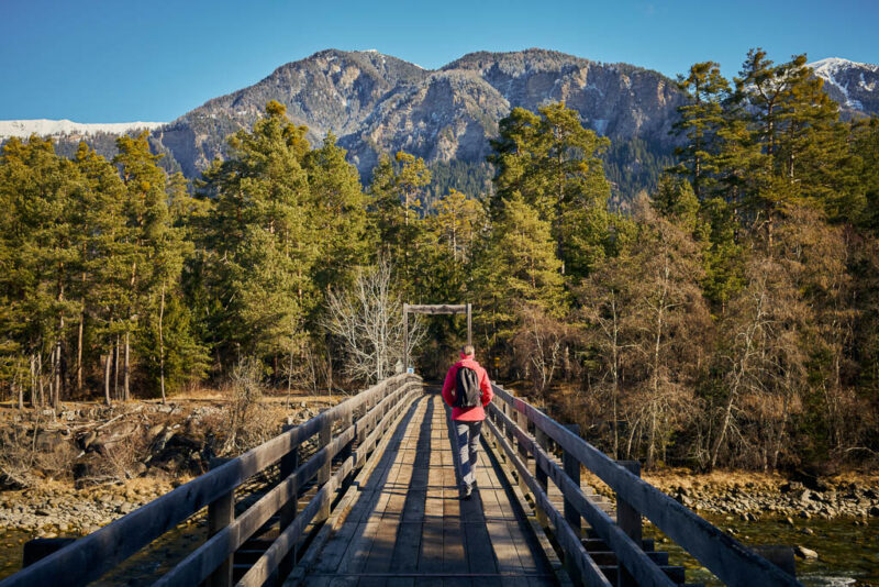 Gleich hinter dem Schwimmbad führt der Wanderweg nach Sils über eine hölzerne Hängebrücke, das Silserbrüggli:
