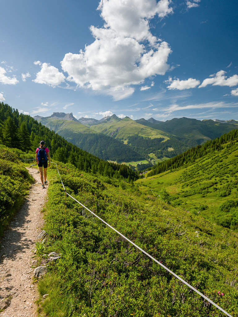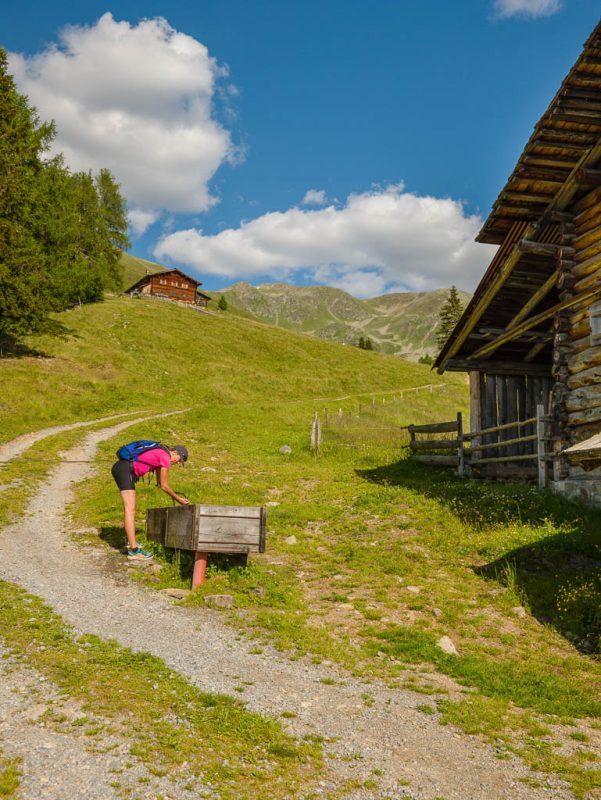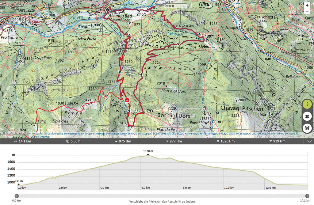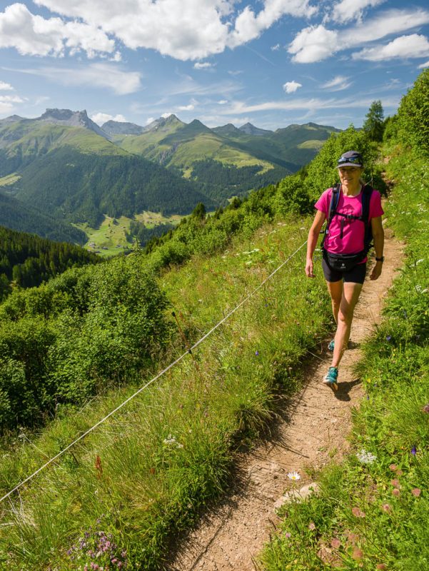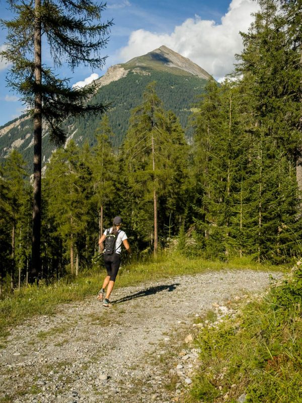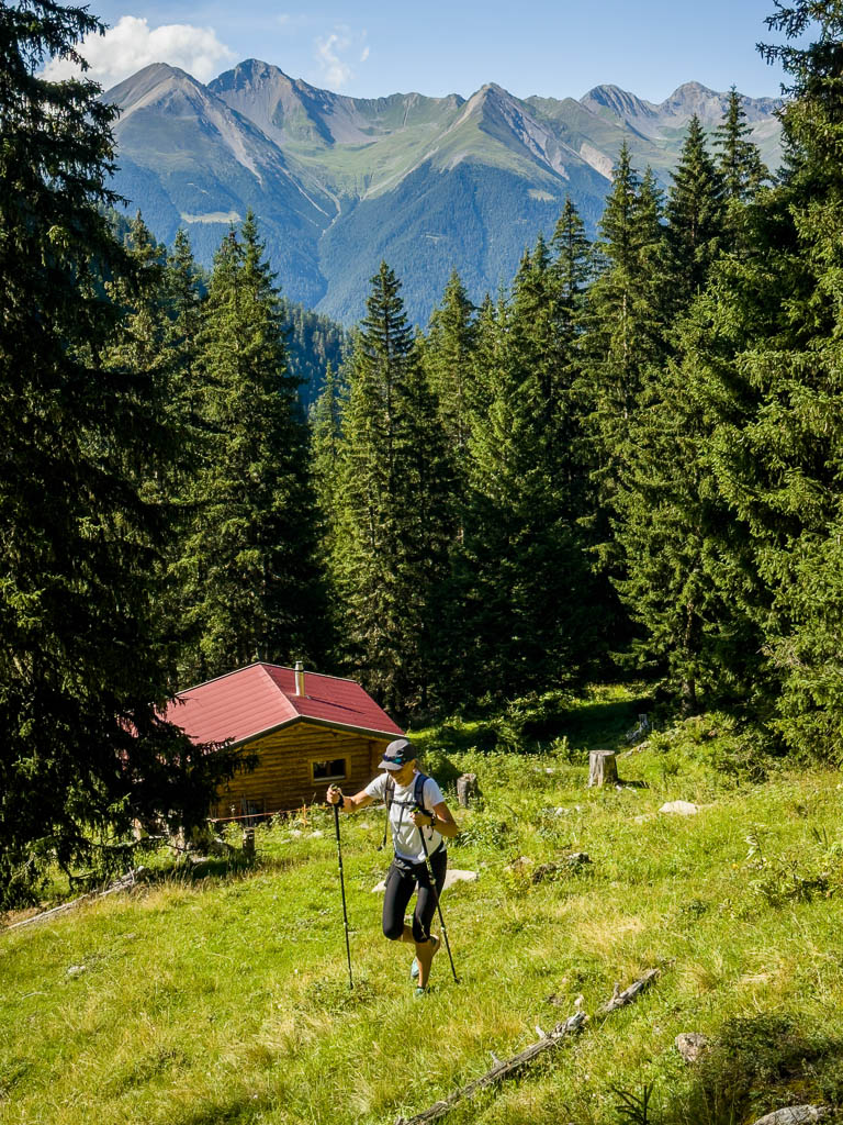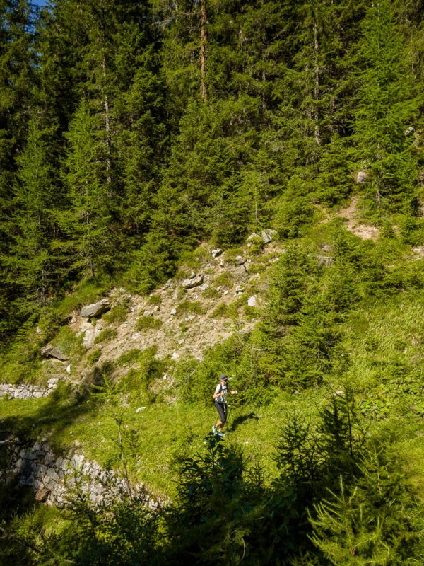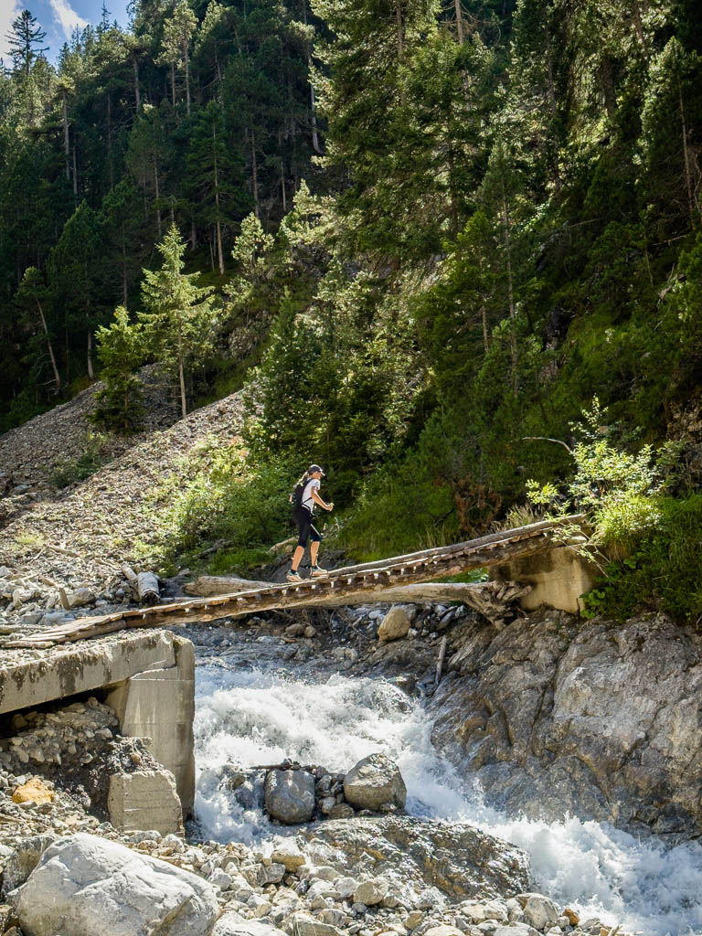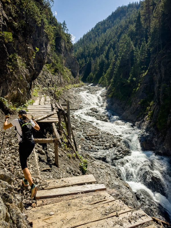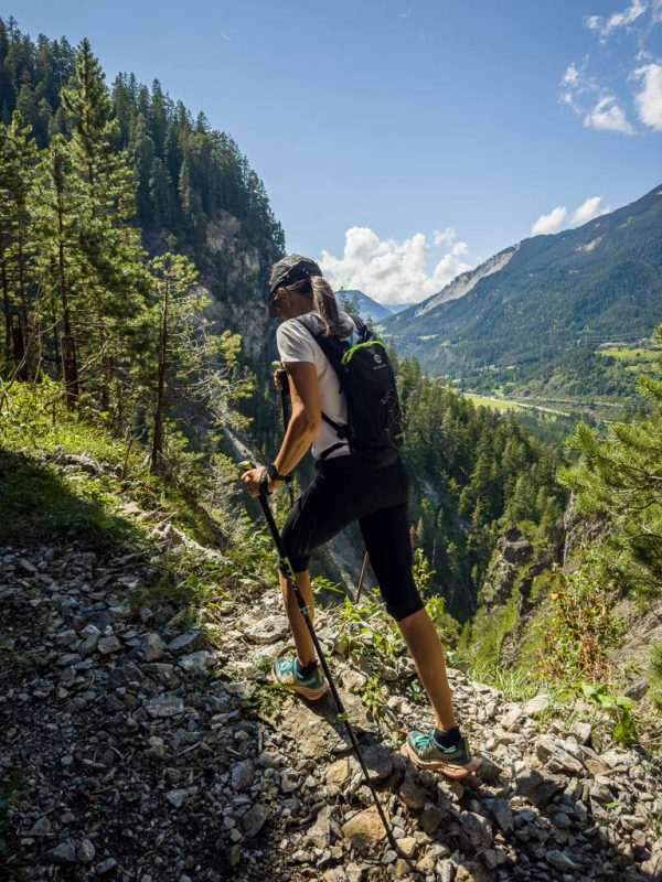 Guido und mich hat das Trail-Running-Fieber gepackt und wir überlegen ernsthaft, ob wir uns Trail-Running-Stöcke zulegen sollen. So verkehrt wäre das gar nicht, denn Trail-Running-Stöcke sind wesentlich leichter als normale Wanderstöcke und wären sicherlich auch auf „normalen“ Bergtouren hilfreich. Wir testen heute daher mit Hilfe unserer Wanderstöcke, wie sich das Laufen bzw. Gehen mit Stöcken im Aufstieg anfühlt und vor allem, welche Länge wir bräuchten. Als Teststrecke dient der Aufstieg durch den Schaftobel bei Alvaneu. Da uns der gestrige Lauf noch in den Beinen steckt, starten wir allerdings erst am Nachmittag und nicht von zu Hause, sondern von Alvaneu Bad aus. Schon bald steht fest, dass es mit den Stöcken trotz müder Beine tatsächlich ziemlich flott nach oben geht.