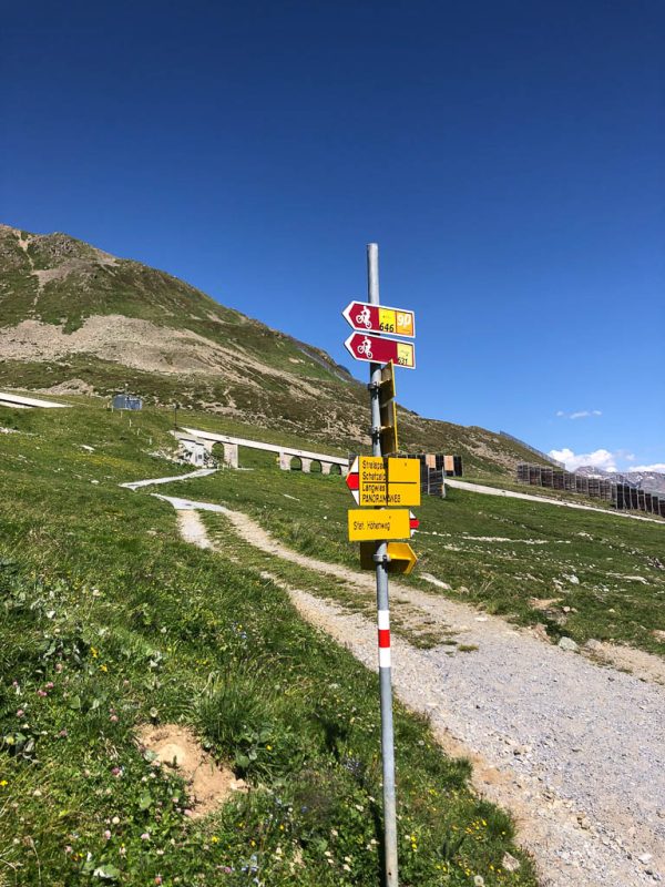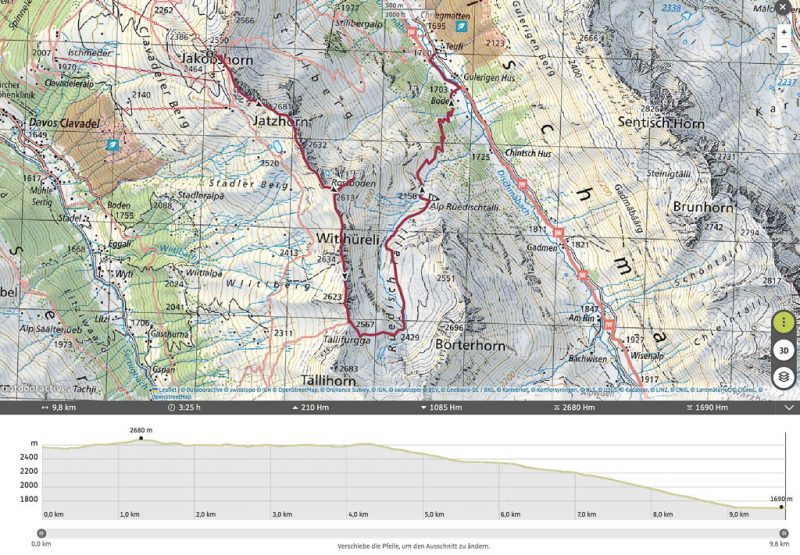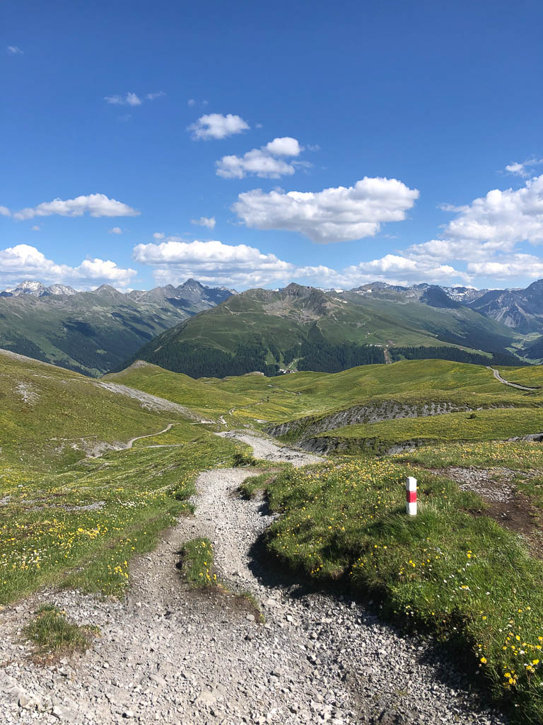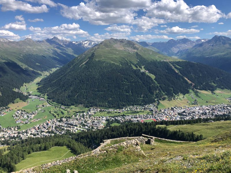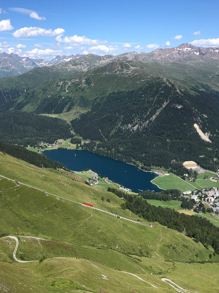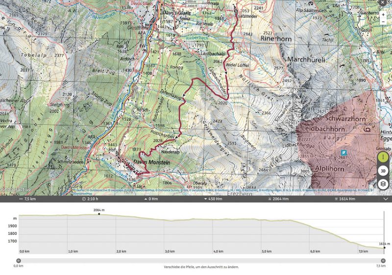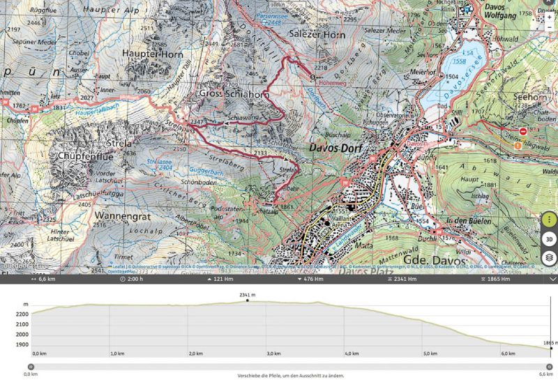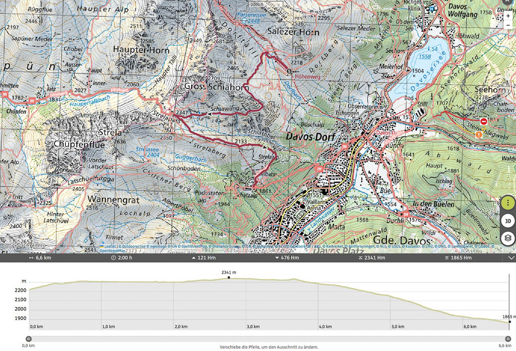 Ich verbringe die Zeit bis um 14.20 Uhr mit Essen und Lesen. Zwanzig Minuten später sitze ich im Bus nach Davos. Ich will mit der Parsennbahn zur Mittelstation „Höhenweg“ fahren und von dort aus gemütlich über den Panoramaweg zur Schatzalp laufen. Die letzten Höhenmeter hinunter nach Davos will ich mit der Schatzalpbahn zurücklegen. So sieht der Plan aus: