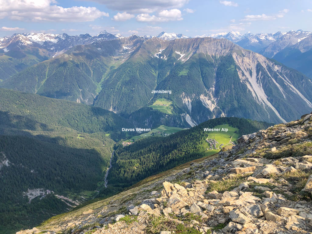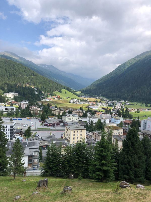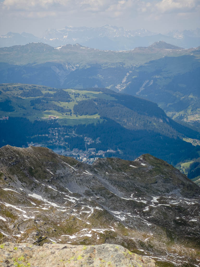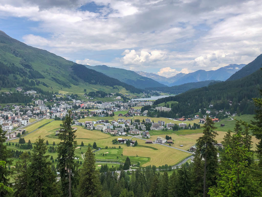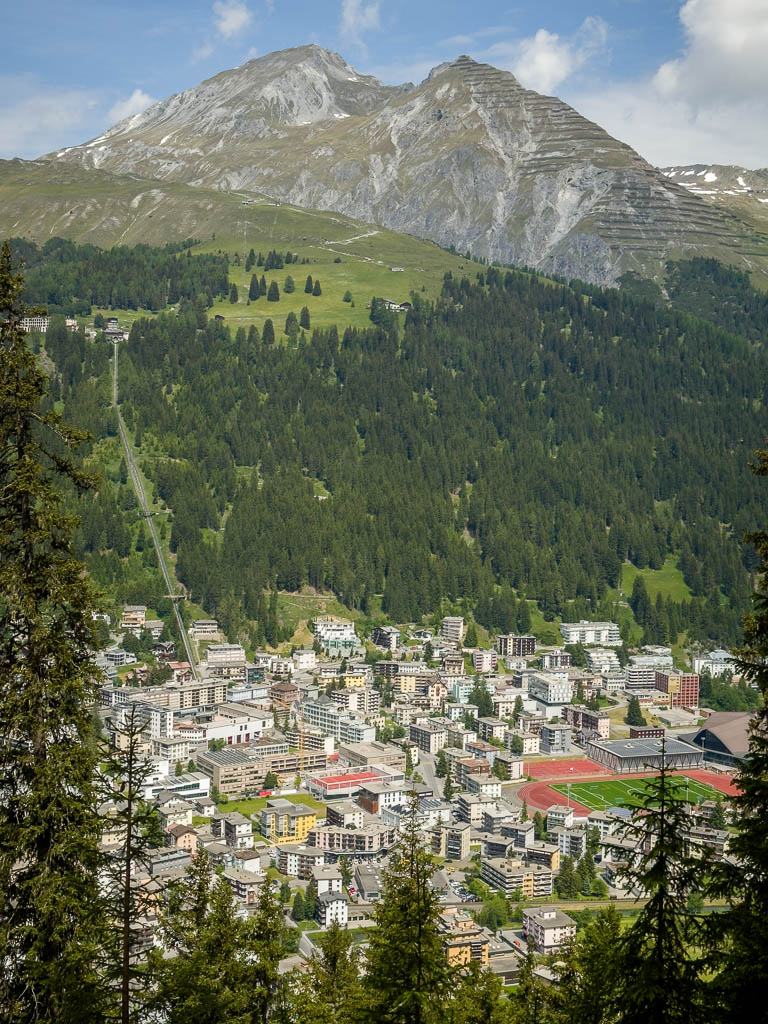 rund um die Schatzalp. Der Blick vom Weg über die Dächer von Davos Dorf hinein ins Dischmatal, das wir gestern erkundeten: