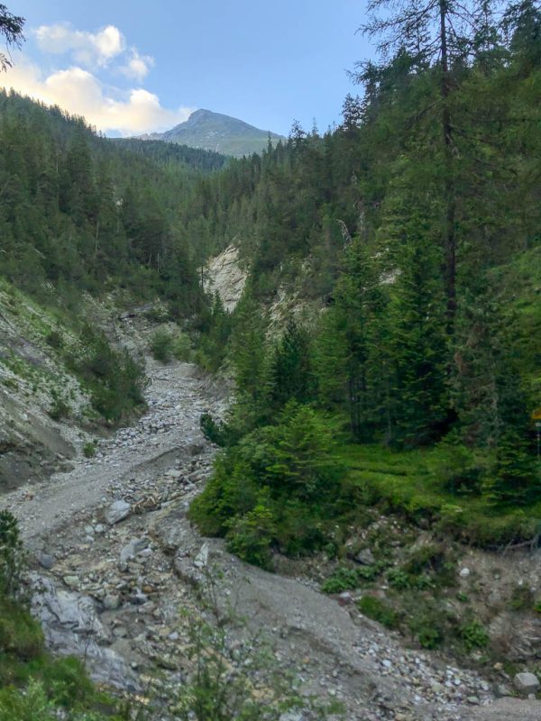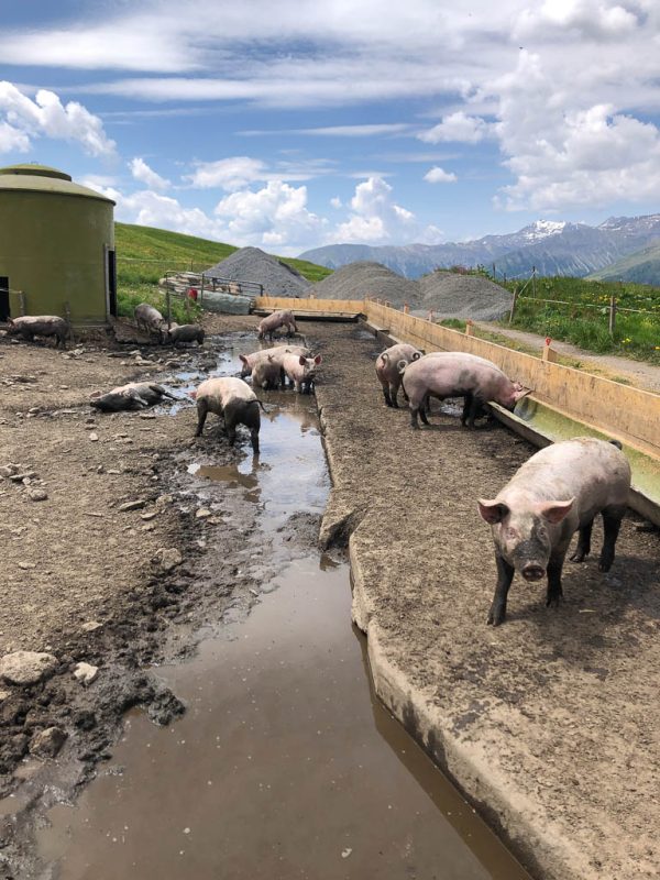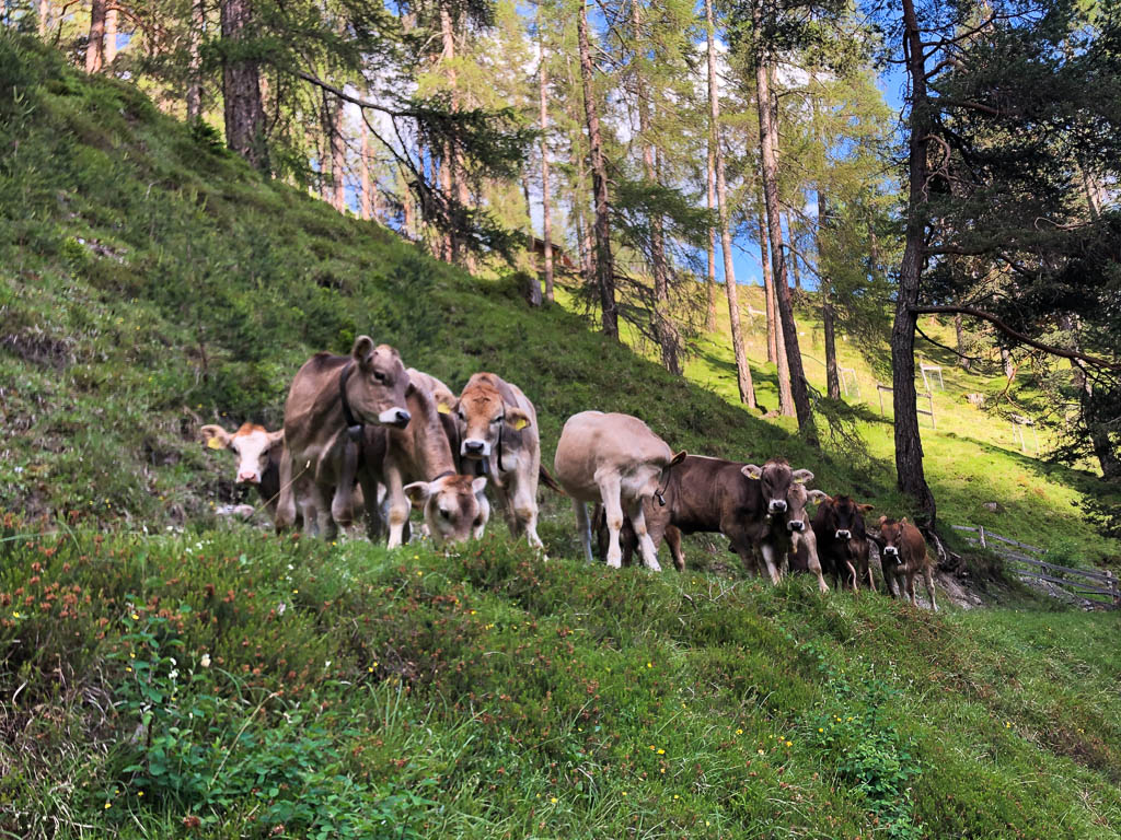 Was mir ebenfalls gefällt: Samstag ist schon um 17 Uhr Feierabend und nicht erst um 19 Uhr. So bleibt am Abend noch genug Zeit für eine Wanderung. Da Guido schon mit dem Rad unterwegs gewesen ist, gehe ich allein los und laufe über Aclas und Raglauna nach Aclas Dafora. Dort steht am Wegesrand ein Kühlschrank mit Käse von der Alp Ozur. Ich esse zwar keinen Käse, selbst dann nicht, wenn er wie hier aus Rohmilch hergestellt wurde, aber Guido. Ich nehme daher etwas Käse für ihn mit und mache mich anschließend auf den Nachhauseweg. Mein Aufstieg nach Aclas wird neugierig beobachtet: