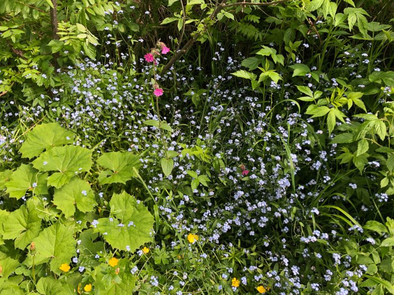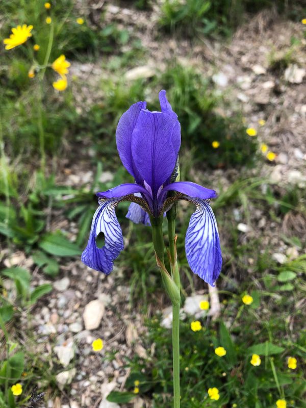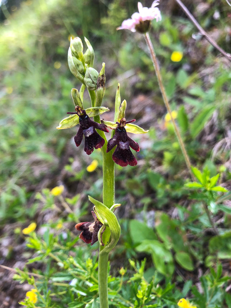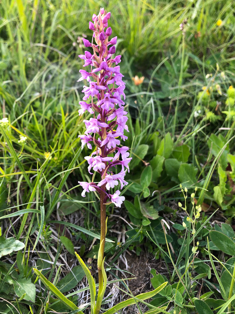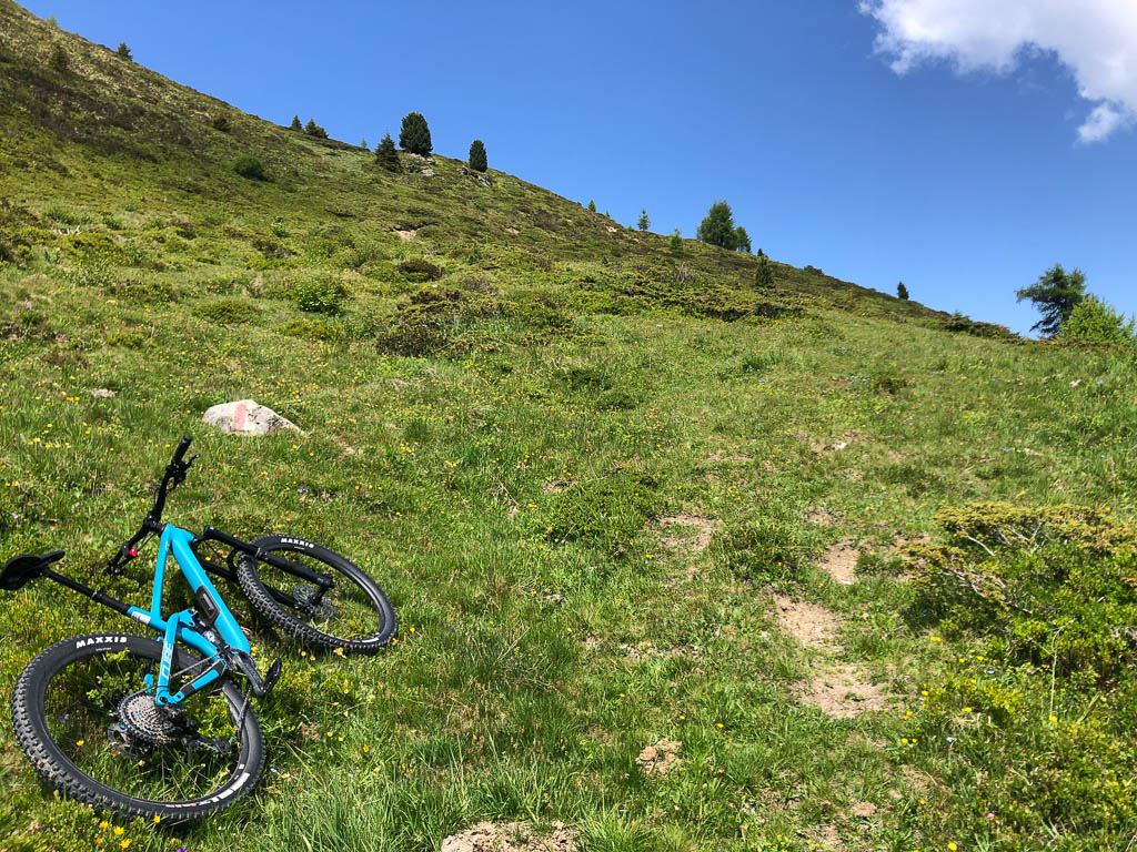 Guido strampelt in der Zwischenzeit den Fahrweg zur Alp Ozur hinauf und gibt über Funk immer wieder Rückmeldung, wo er gerade ist. Ich beschließe, die Wartezeit zu verkürzen, in dem ich zum nächst höher gelegenen Hügel aufsteige. Der Blick zurück auf Punkt 2177 und mein Rad: