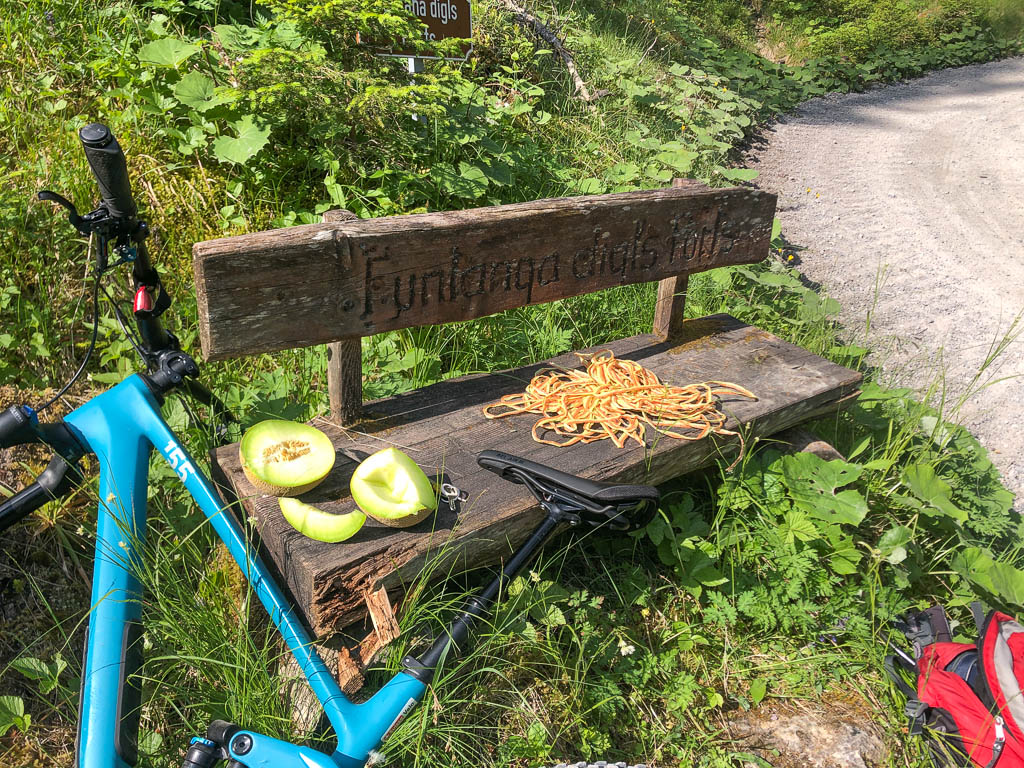 Ich habe mein Funkgerät dabei und gegen 9.30 Uhr komme ich auf die Idee, Guido anzufunken. Laut Herstellerangaben soll die Funkverbindung ja bis zu einer Entfernung von 10 Kilometern möglich sein. Und vom Fahrweg der Alp Ozur bis nach Schmitten sind es bestimmt keine zehn Kilometer. Und tatsächlich, es klappt, Guido antwortet. Er ist gerade aufgestanden und wird gleich in aller Ruhe frühstücken. Frühstücken, ja das ist eine gute Idee, das könnte ich auch machen! Und so suche ich mir eine Bank und lasse mir eine Melone „Galia“ schmecken: