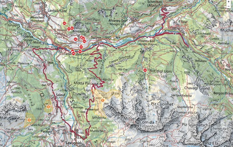 Von Tiefencastel aus fahren wir über einen wegen des möglichen Bergsturzes bei Brienz gesperrten Wanderwegs nach Surava. Gefahr, hier von Gesteinsmassen überrollt zu werden, besteht keine, da der Berg auf der anderen Talseite liegt. Aber die Behörden sind halt lieber eine Spur zu vorsichtig. Bei Surava endet unsere Tour. Hier steht Guidos Auto und wir schaffen es Gott sei Dank, beide Räder in den Kofferraum zu bekommen. Hätte nur ein Rad ins Auto gepasst, hätte ich weitere 300 Höhenmeter nach oben strampeln müssen und das wäre nach der bisher schon zurückgelegten Strecke doch sehr mühsam geworden. Meine Hike- & Bike-Tour über Motta Palousa mit allen Abstechern in der Übersicht: