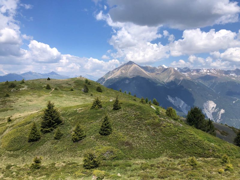 Schließlich kann aber auch ich wieder in den Sattel steigen und den Blick vom Weg auf Piz Toissa und Piz Curvér genießen: