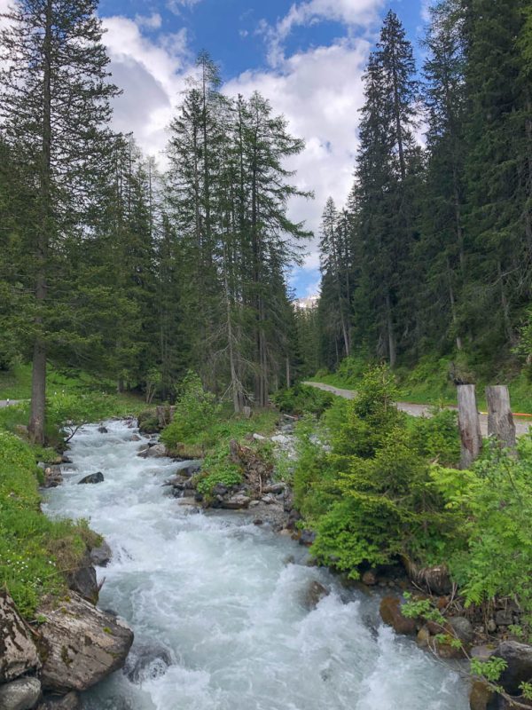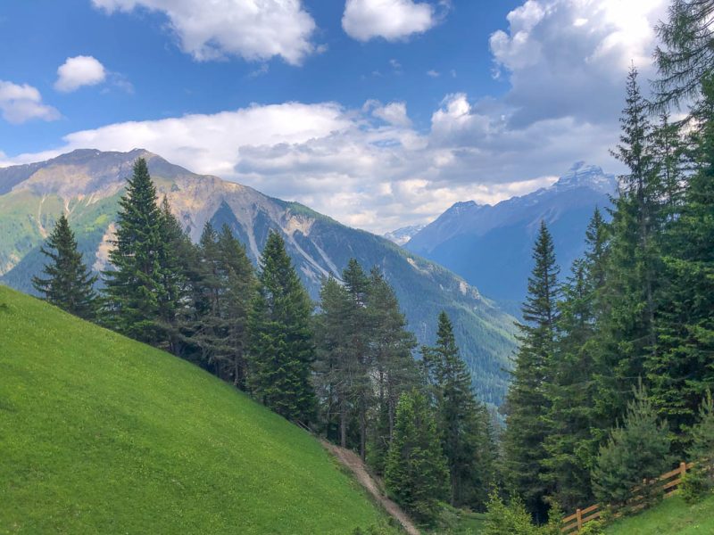 Während ich und mein Rad langsam noch oben bewege, höre ich es in der Ferne immer wieder Rumpeln und Poltern. Auf der gegenüberliegenden Talseite liegt nämlich das von einem Bergsturz gefährdete Dorf Brienz. Wenn die Bäume die Sicht freigeben, sieht man außerdem Staubwolken über Brienz schweben. Allerdings scheinen es immer nur kleinere Mengen an Gestein zu sein, die abgehen. Auf den ersten Blick sehen Dorf und Umgebung nämlich noch recht „normal“ aus.