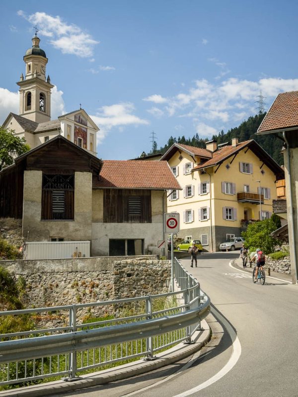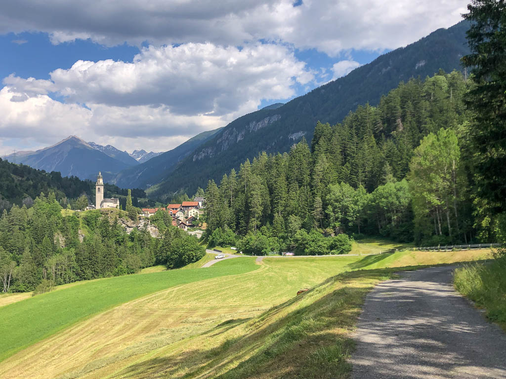 Von Cunter aus geht es über eine Straße hinauf nach Salouf. Die Steigung ist hier so mäßig, dass ich sie im Sattel sitzend bewältigen kann.