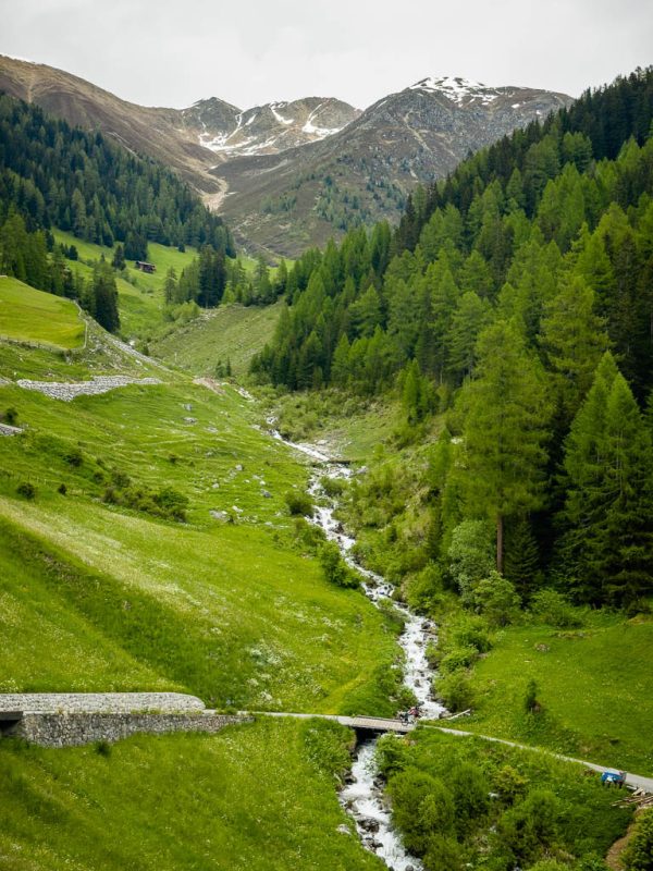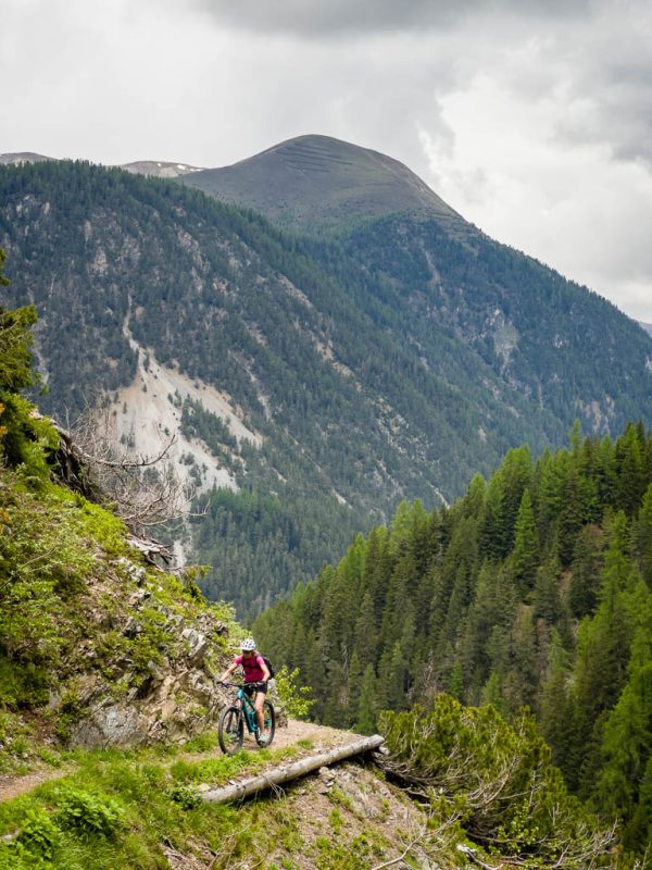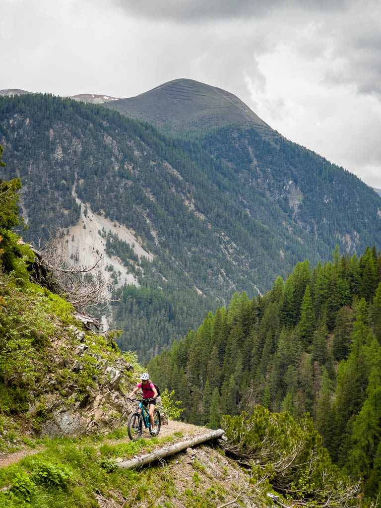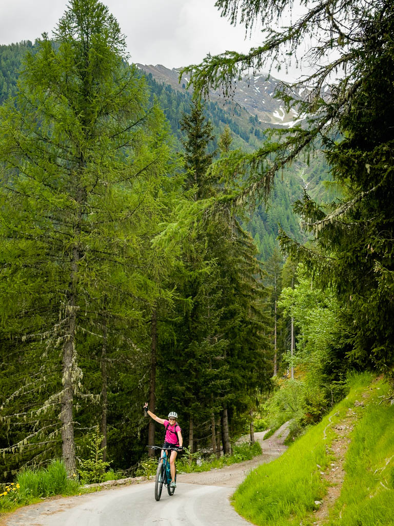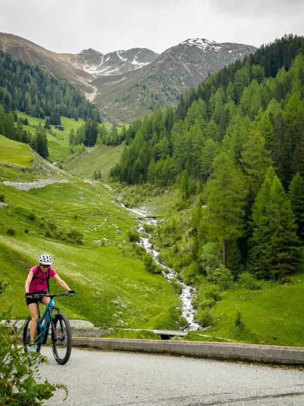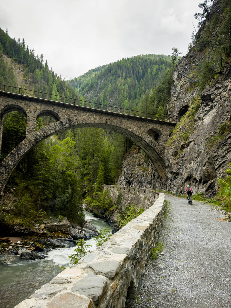 Zuerst fahren wir über den Wanderweg, der von Schmitten über das Landwasser-Viadukt nach Filisur führt, steil hinunter ins Tal. Anschließend geht es relativ flach entlang der Albula. Nach etwa sieben Kilometern treffen wir auf den hinauf ins Val Spadlatsch und damit Richtung Ela-Hütte führenden Fahrweg. Er ist offen, das große Abenteuer, mit dem Rad der Ela-Hütte näherzukommen, kann also beginnen.