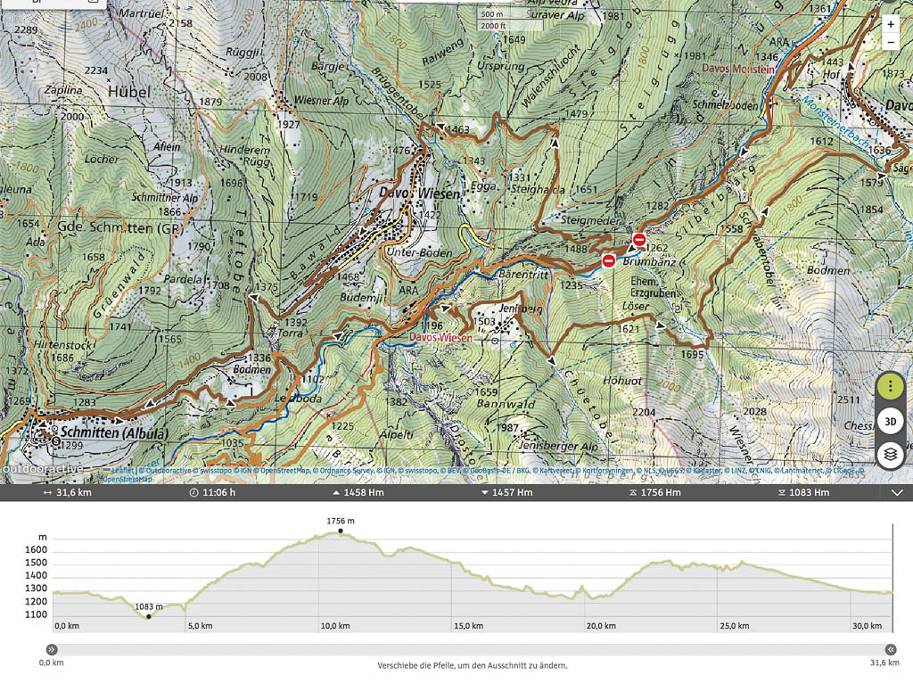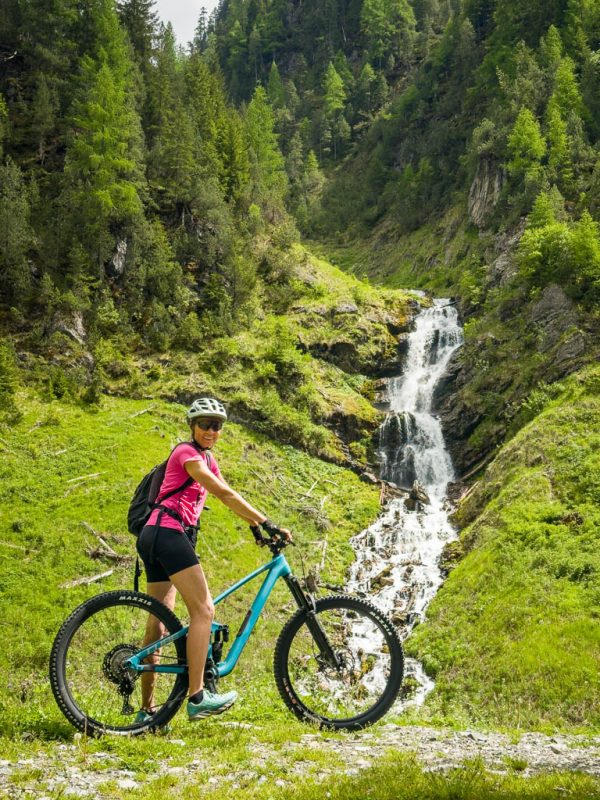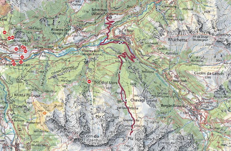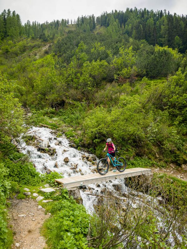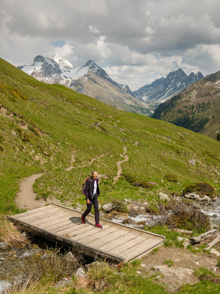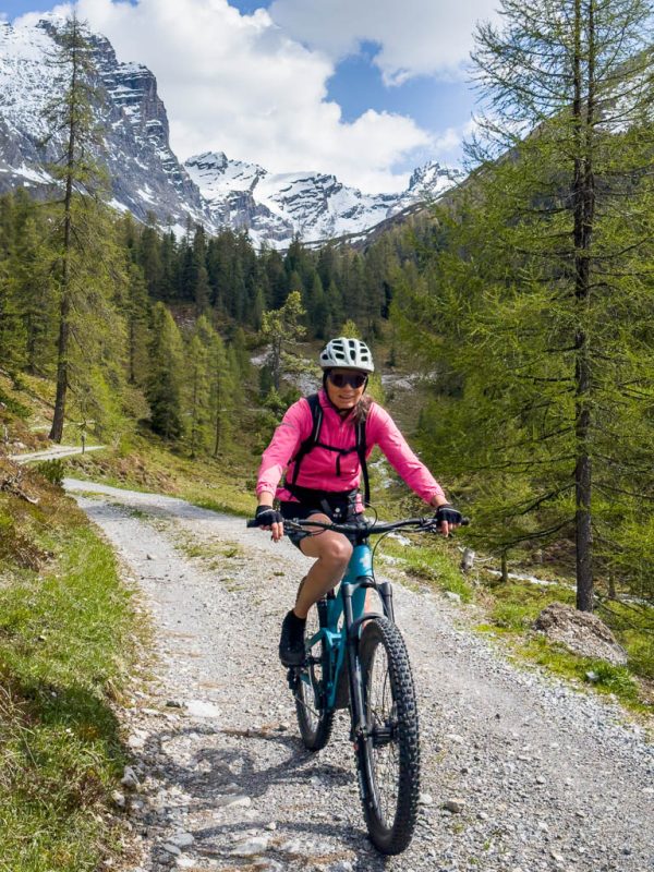 Zuerst fahren wir über den Wanderweg, der von Schmitten über das Landwasser-Viadukt nach Filisur führt, steil hinunter ins Tal. Anschließend geht es relativ flach entlang der Albula. Nach etwa sieben Kilometern treffen wir auf den hinauf ins Val Spadlatsch und damit Richtung Ela-Hütte führenden Fahrweg. Er ist offen, das große Abenteuer, mit dem Rad der Ela-Hütte näherzukommen, kann also beginnen.