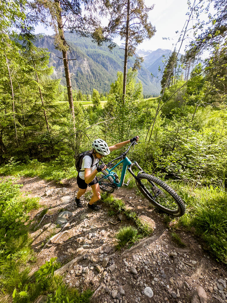 Ich fahre zudem deutlich schneller als mit meinem alten und Guido muss daher weitaus weniger lang auf mich warten als früher. So mühsam der Aufstieg war, so mühelos ist der Abstieg! Aber unten im Tal ist die Tour noch nicht zu Ende: Schmitten liegt dreihundert Höhenmeter oberhalb des Tals. Die ersten Meter hinauf sind Schieben bzw. Tragen der Räder angesagt: