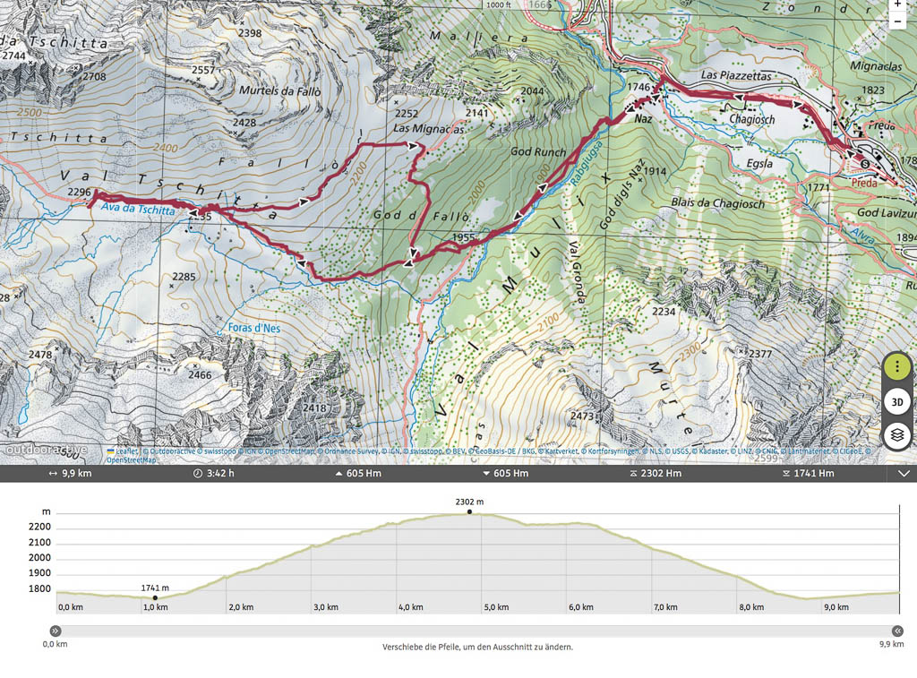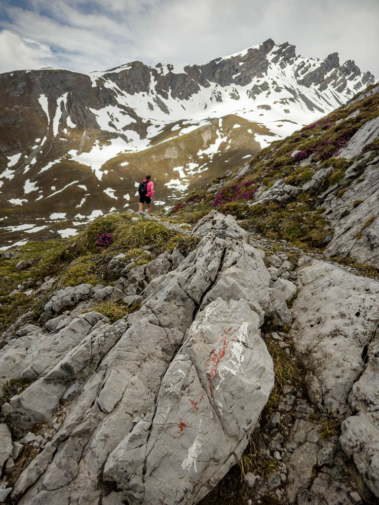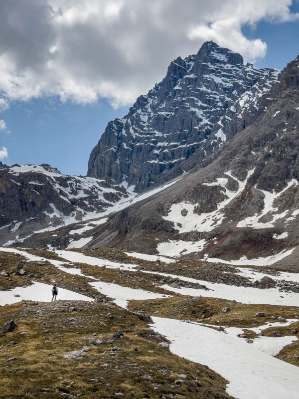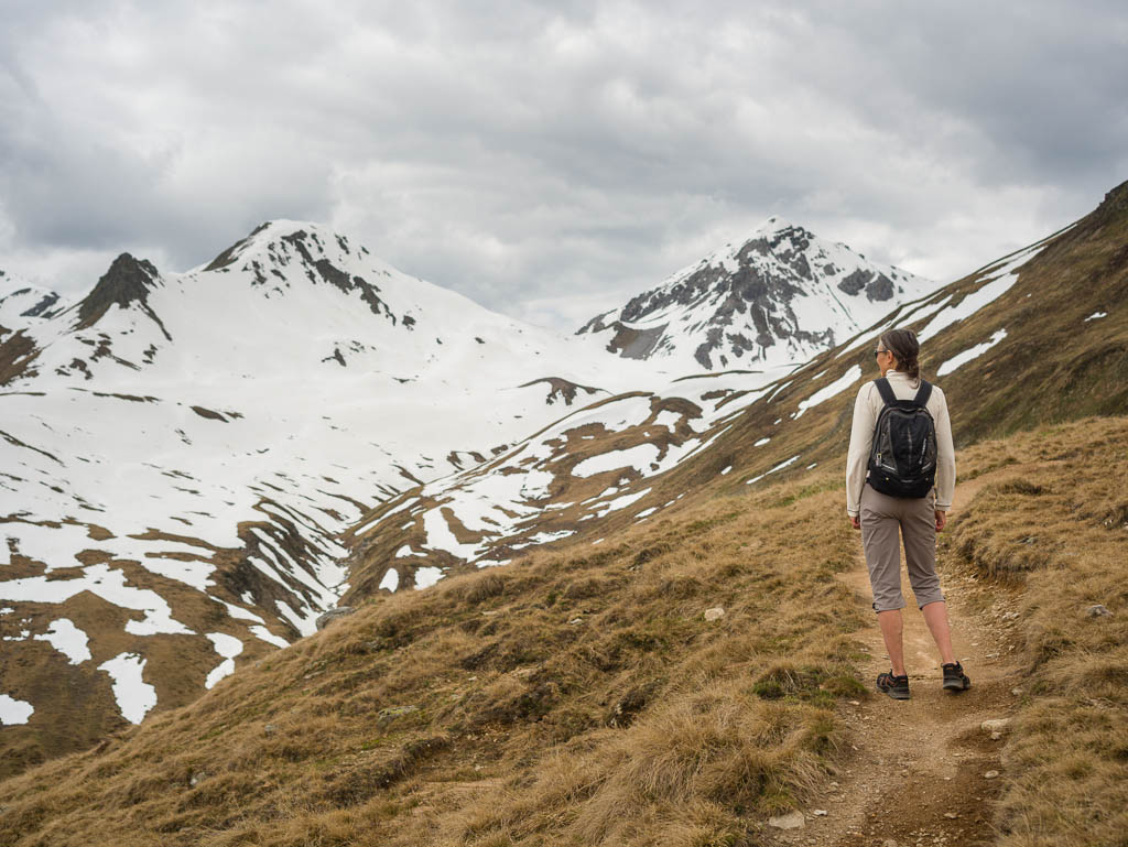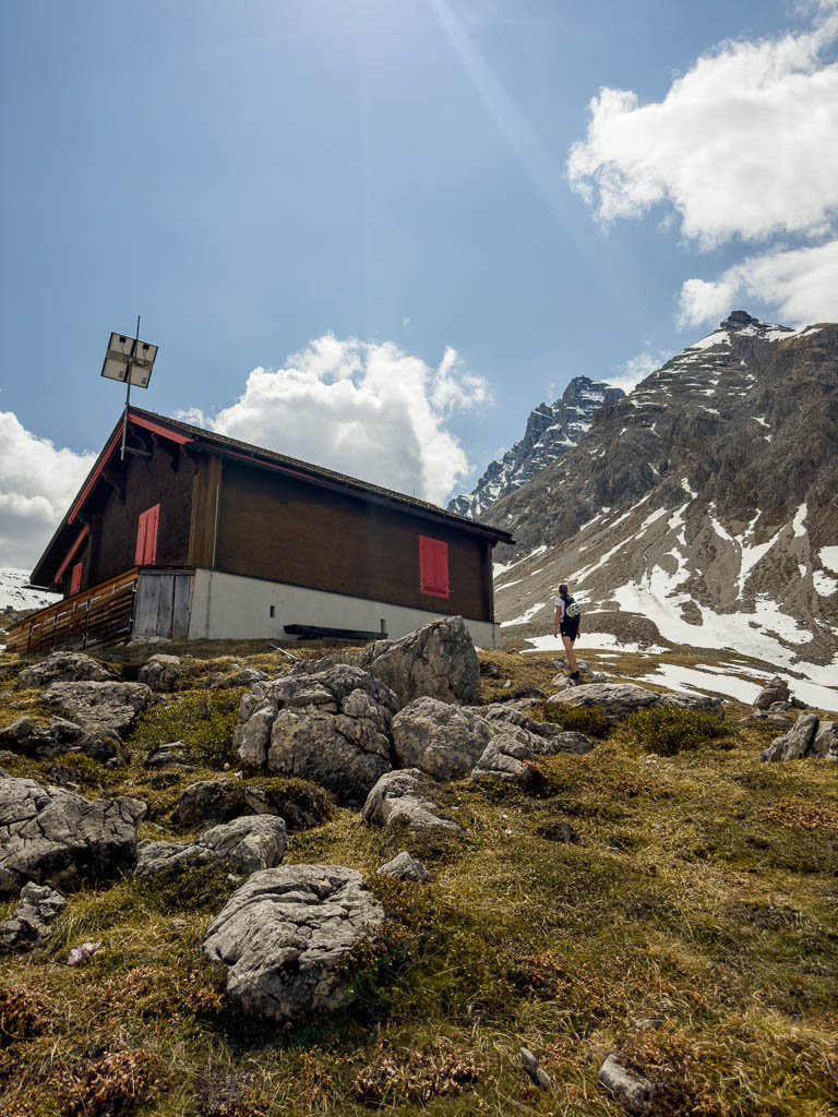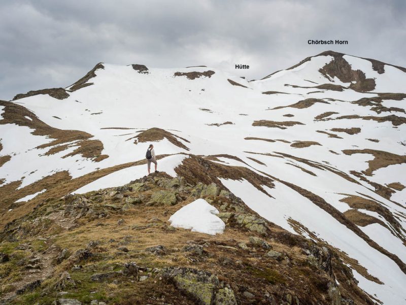 Im Sommer führen von der Hütte aus Wanderwege über Orgel- und Ela-Pass. Beide Pässe kennen wir von dieser Wanderung: Zum Pass digls Orgels am Fuße des Tinzenhorns. Aktuell sind die Wanderwege noch schneebedeckt und so können wir nur noch ein kleines Stückchen weglos weitergehen: