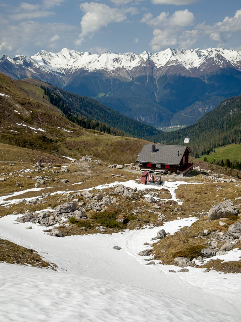 Unterhalb der Hütte ist der Weg größtenteils noch schneebedeckt, so dass ich weglos aufsteige und schließlich ziemlich k.o., aber glücklich und zufrieden die Hütte erreiche: