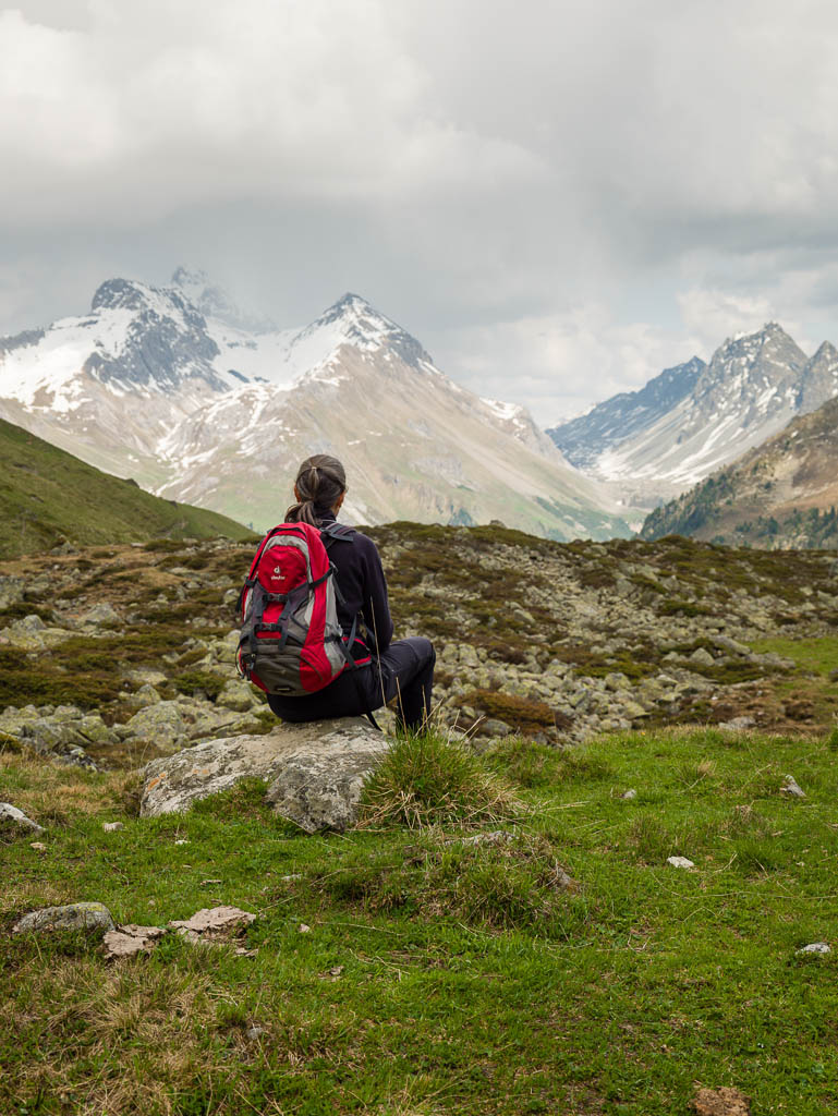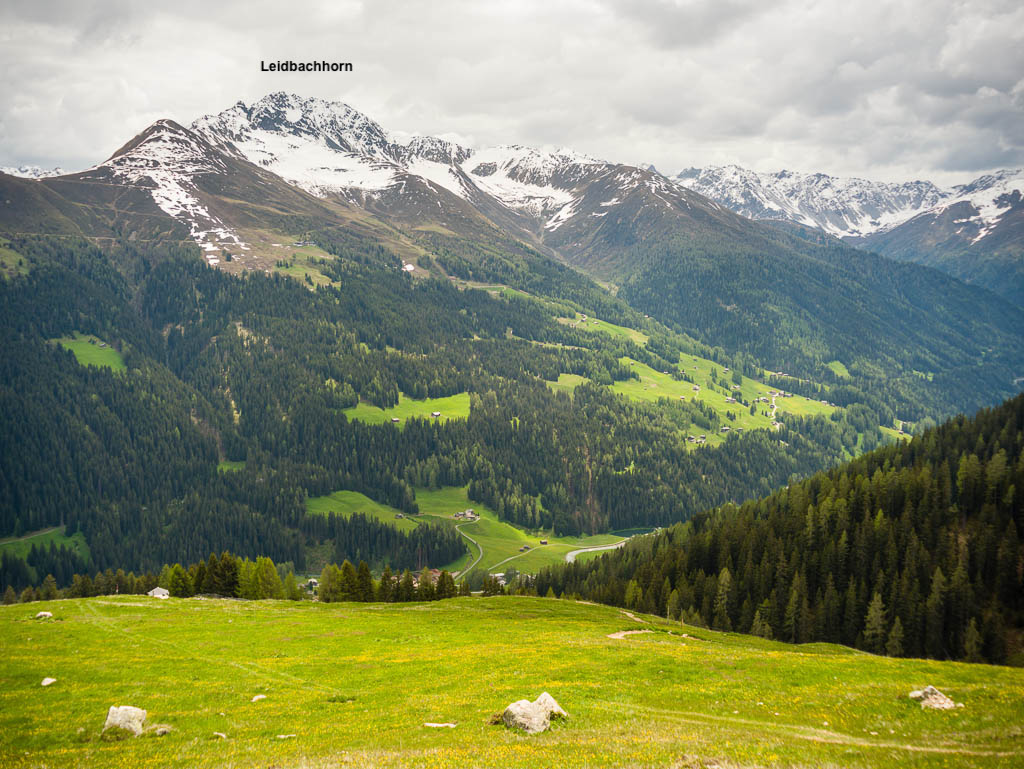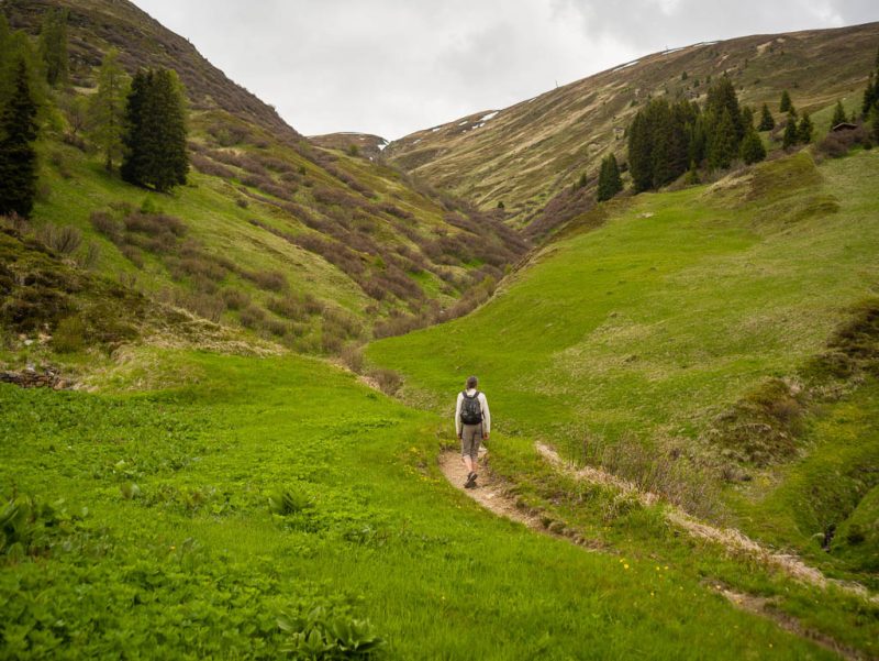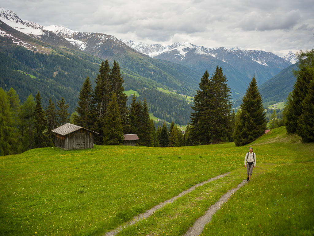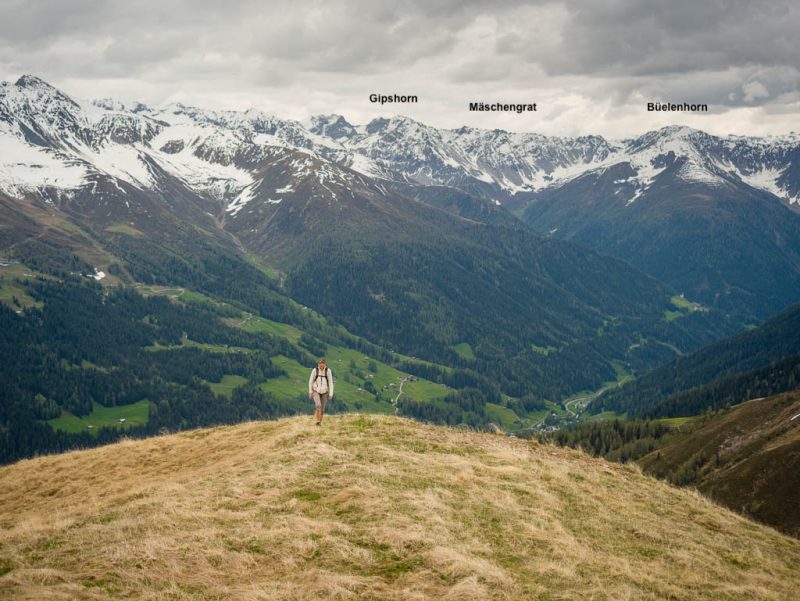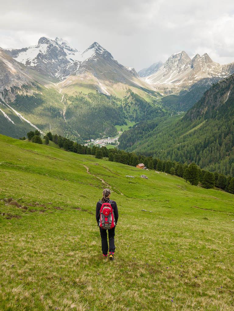 Das Dorf, das weit in der Ferne über der Hütte zu sehen ist, ist Schmitten. Man kann sogar unser Haus erkennen! Auf dem Weg zurück nach Pradatsch:
