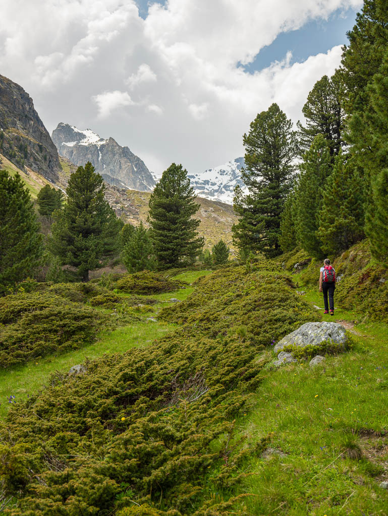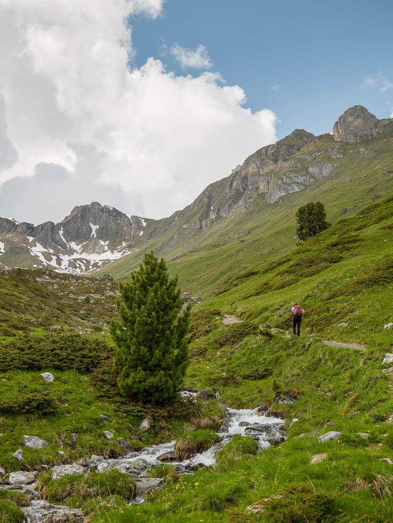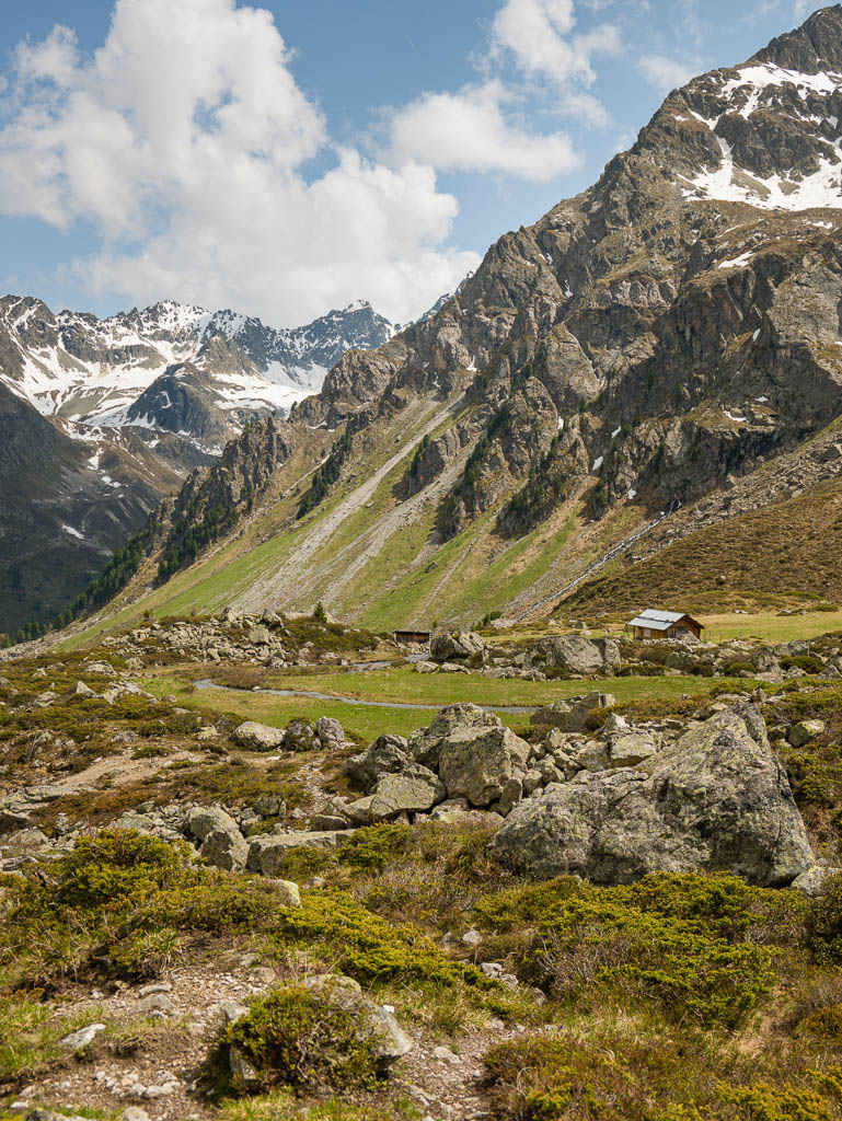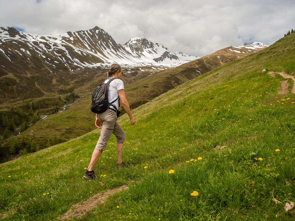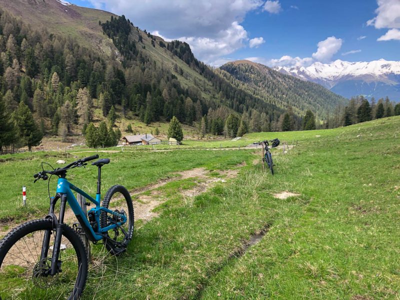 Hier ist immer noch keine Spur von Guido bzw. seinem Rad zu sehen, also schiebe ich weiter. Kurz hinter den Hütten von Pradatsch treffe ich dann endlich auf Guidos Rad. Wie schön, jetzt geht es zu Fuß ohne das Rad weiter.