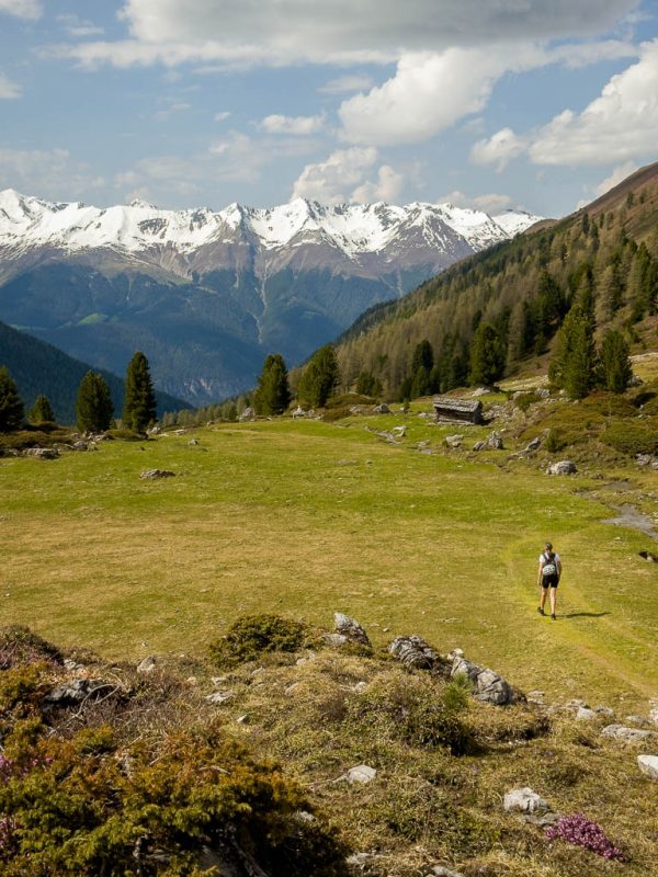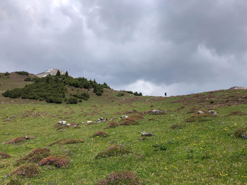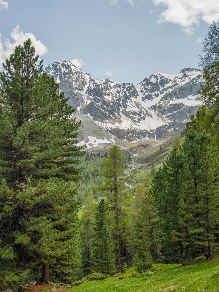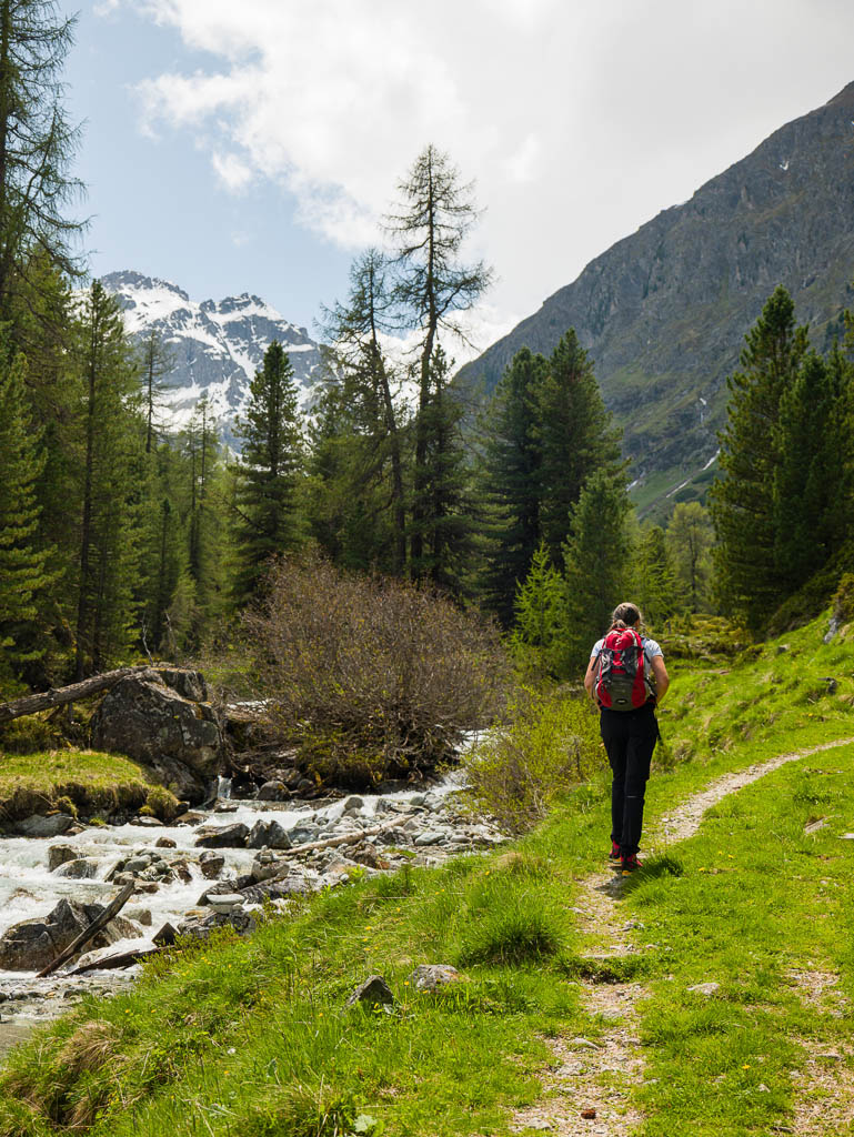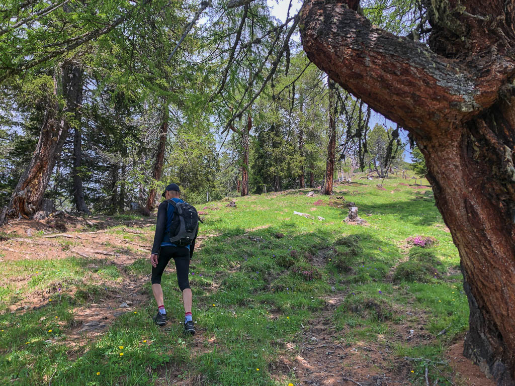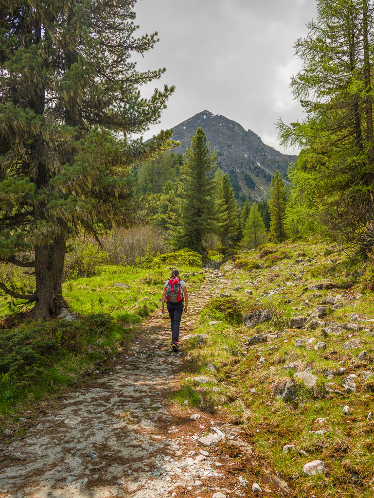 Hier ist immer noch keine Spur von Guido bzw. seinem Rad zu sehen, also schiebe ich weiter. Kurz hinter den Hütten von Pradatsch treffe ich dann endlich auf Guidos Rad. Wie schön, jetzt geht es zu Fuß ohne das Rad weiter.