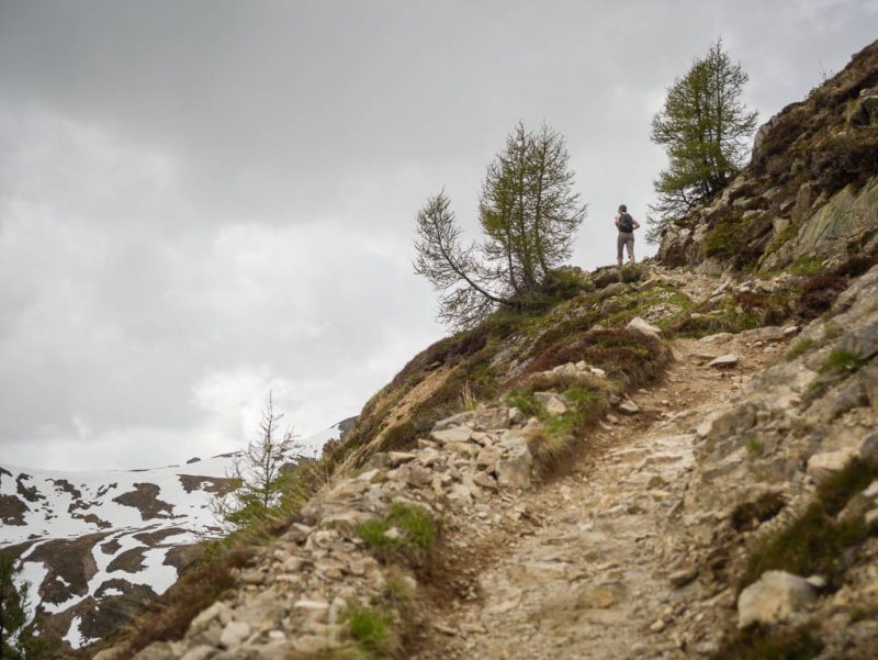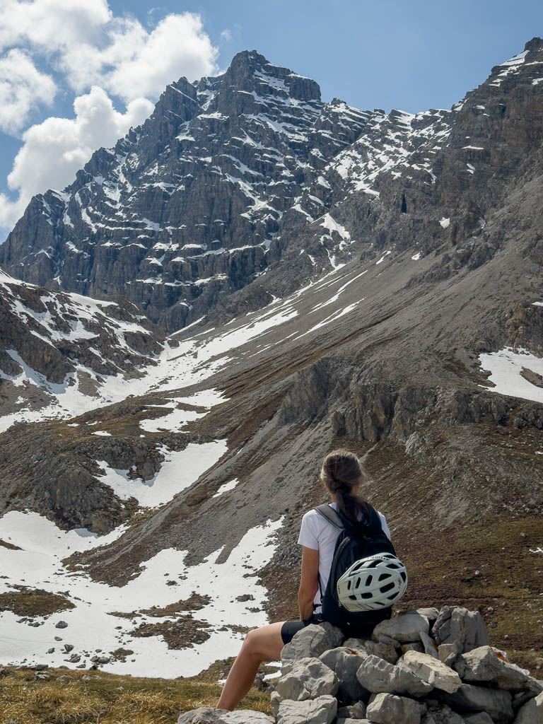 Da Guido nicht zu sehen ist, nehme ich an, dass er weiter zur Ela-Hütte aufgestiegen ist. Ein kurzer Blick zurück auf unsere Räder, dann folge auch ich dem zur Hütte führenden Wanderweg: