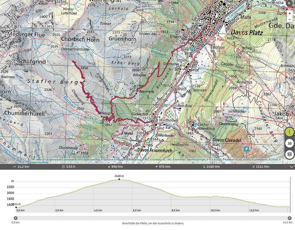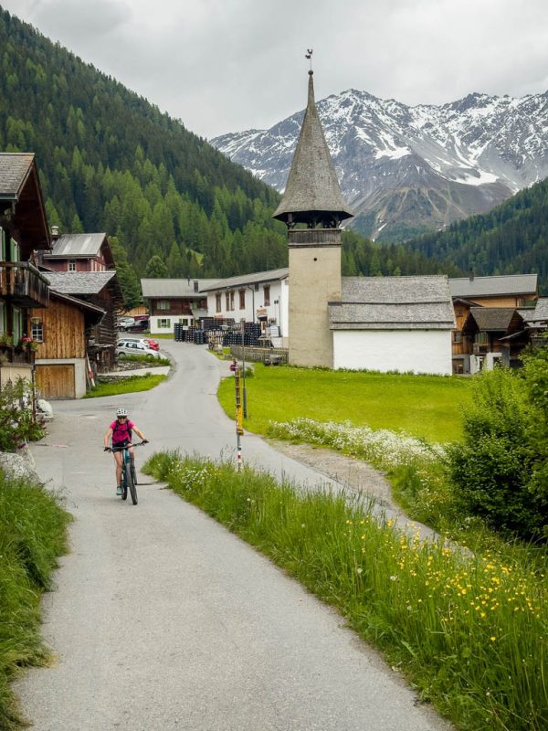 Das ist hier noch ein harmloseres Stück des Weges, teilweise sind große Stufen zu überwinden. Die letzten Meter hinauf nach Schmitten können wir dann aber wieder im Sattel sitzend zurücklegen. Ja, sogar ich schaffe es erstmals, die zwei Kilometer von Zalaint nach Schmitten hinaufzuradeln. Insgesamt lege ich heute über 35 Kilometer und fast 1800 Höhenmeter zurück: