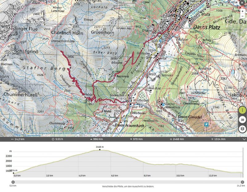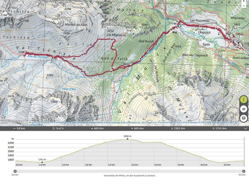 Vom Tal bis zur Hütte sind auf einer Strecke von etwa 10 Kilometern über 1200 Höhenmeter zu überwinden. Damit ist klar, dass ich mein Rad wieder einmal über weite Strecken schieben muss. Die ersten 500 Höhenmeter hinauf bis zu den Hütten von Sela kann ich aber sogar in Sattel sitzend zurücklegen. Darauf bin ich richtig stolz! Danach geht es mal schiebend, mal radelnd für mich weiter. Guido ist derweil schon weit voraus und außer Sichtweite. Irgendwann bin ich so k.o., dass ich noch nicht einmal mehr relativ flache Streckenabschnitte radeln kann. Aber laufen kann ich noch und so geht es Schritt für Schritt weiter nach oben. Bei den Hütten von Prosot Pitschen teilt sich der Weg, man kann entweder über die Alp Prosot gehen oder aber an ihr vorbei. Nach rund einem Kilometer treffen die beiden Wege dann wieder zusammen. Ich wähle den Weg über die Alpe, da dieser mir von unserer Wanderung auf Chavagl Grond und Chavagl Pitschen in Erinnerung geblieben ist: Von Filisur auf Chavagl Grond und Chavagl Pitschen. Bald darauf erreiche ich Pradatsch: