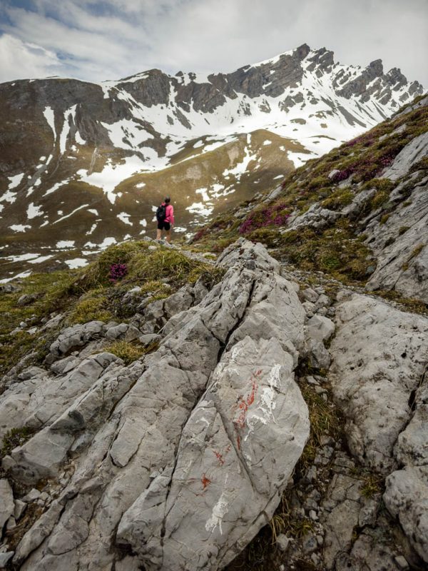 Bei diesem Steinmann mitten im Gelände rasten wir und lassen das Tinzenhorn auf uns wirken: