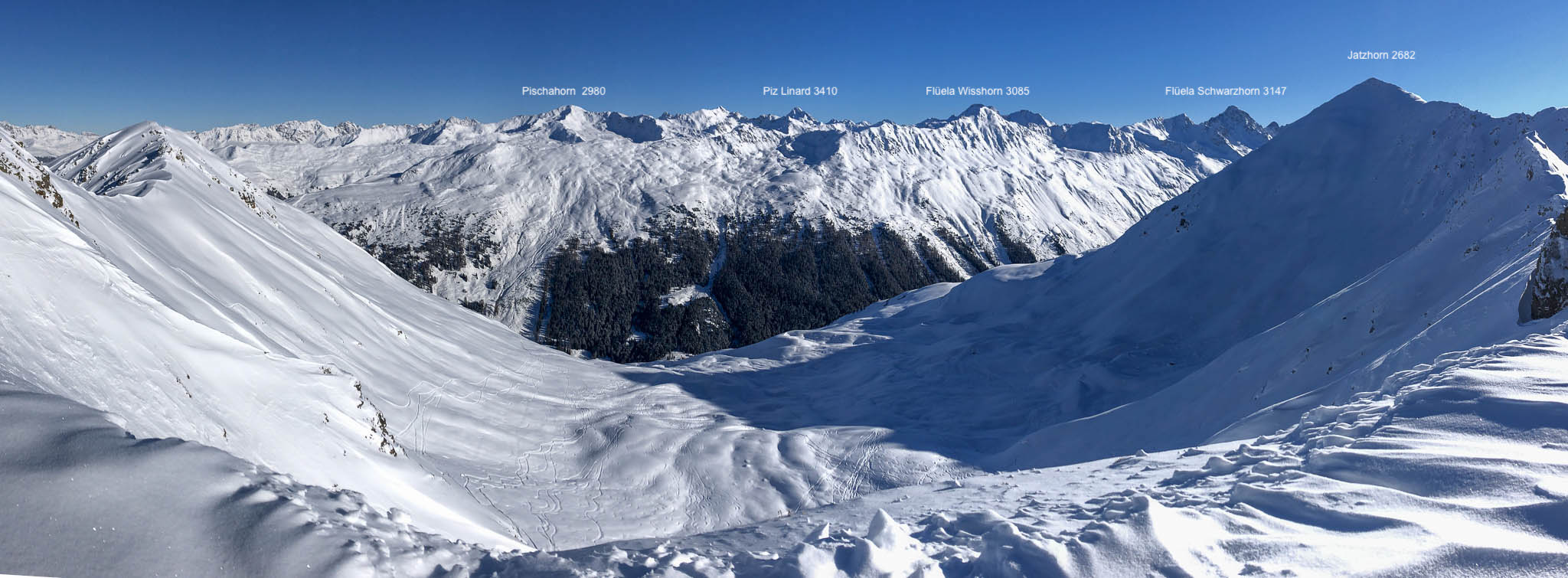 Vom Jakobshorn hinunter nach Teufi führt „nur“ eine markierte Offpiste, die Route „Jakobshorn – Teufi“. Hier ein Bild vom Winter, das einen Teil dieser Piste zeigt: