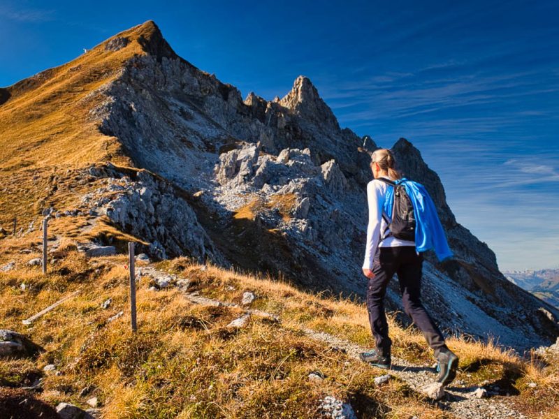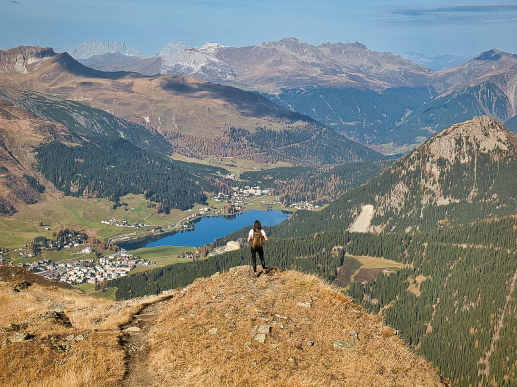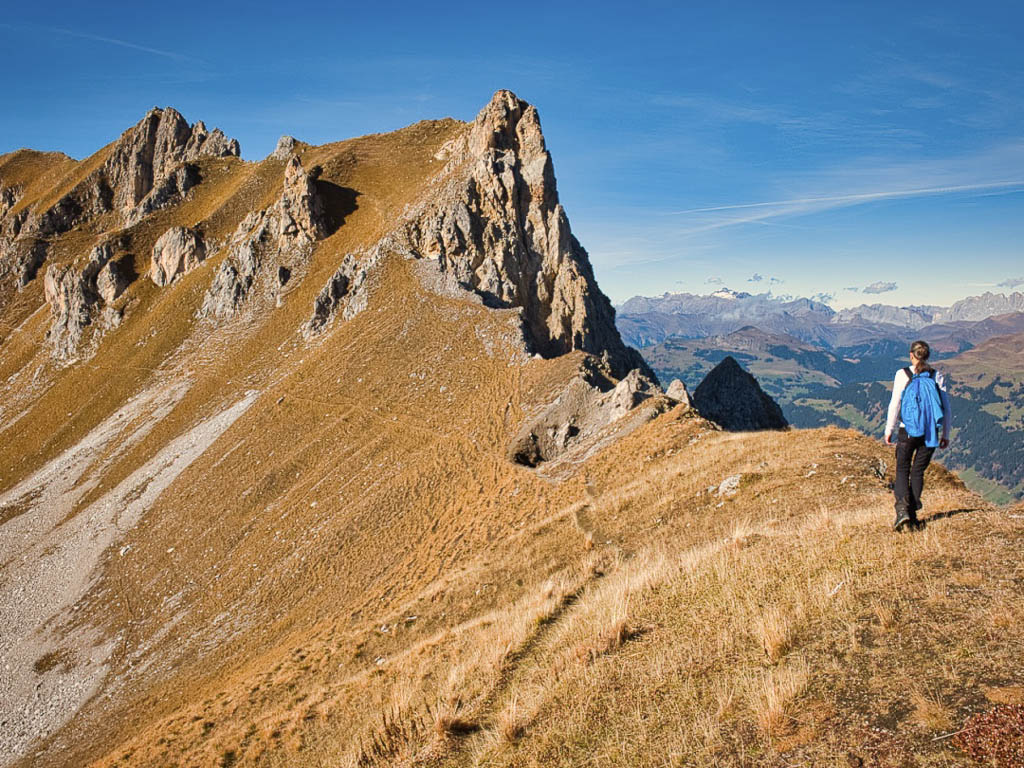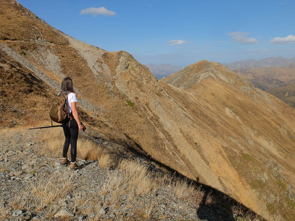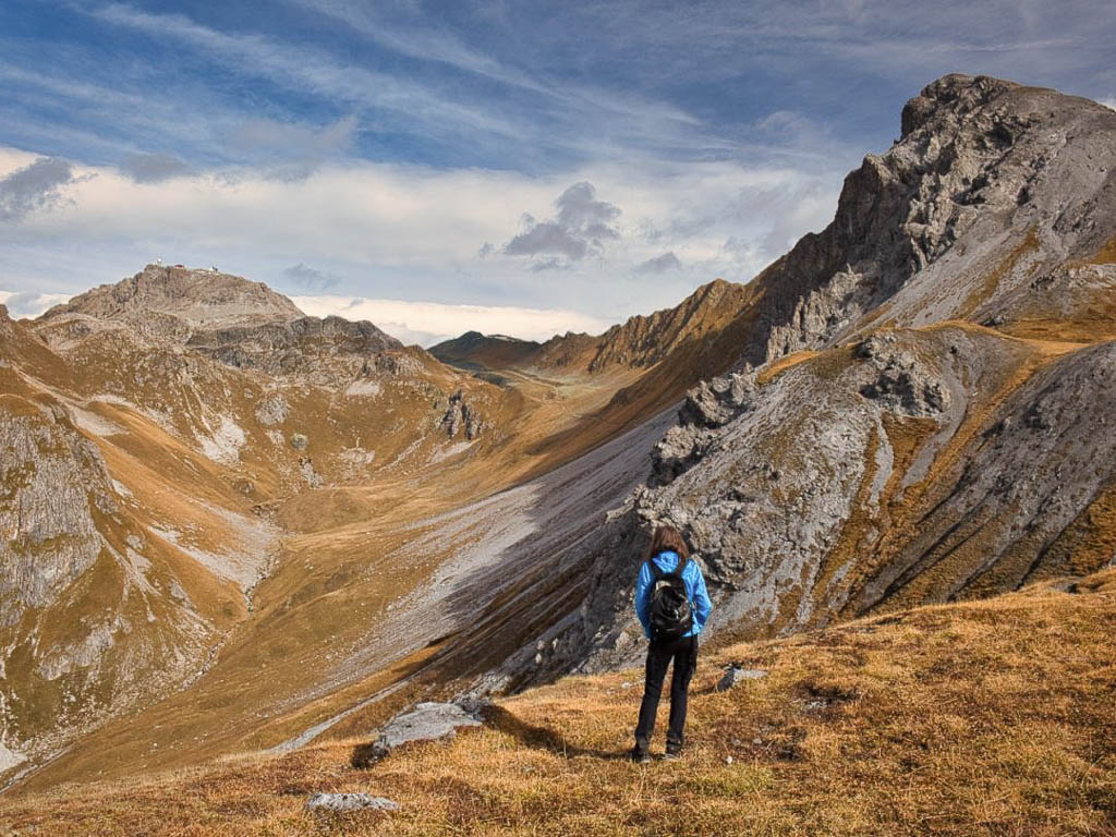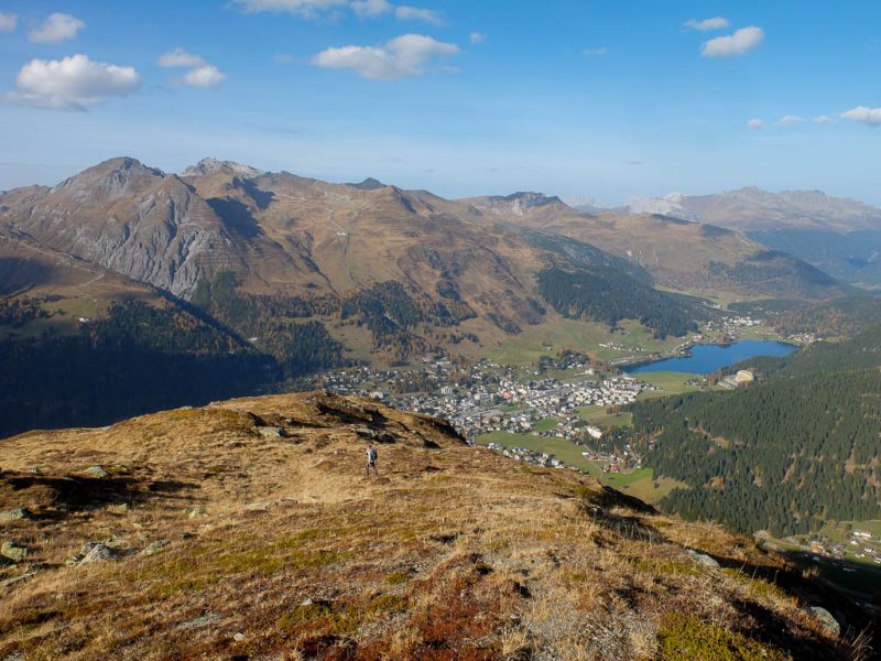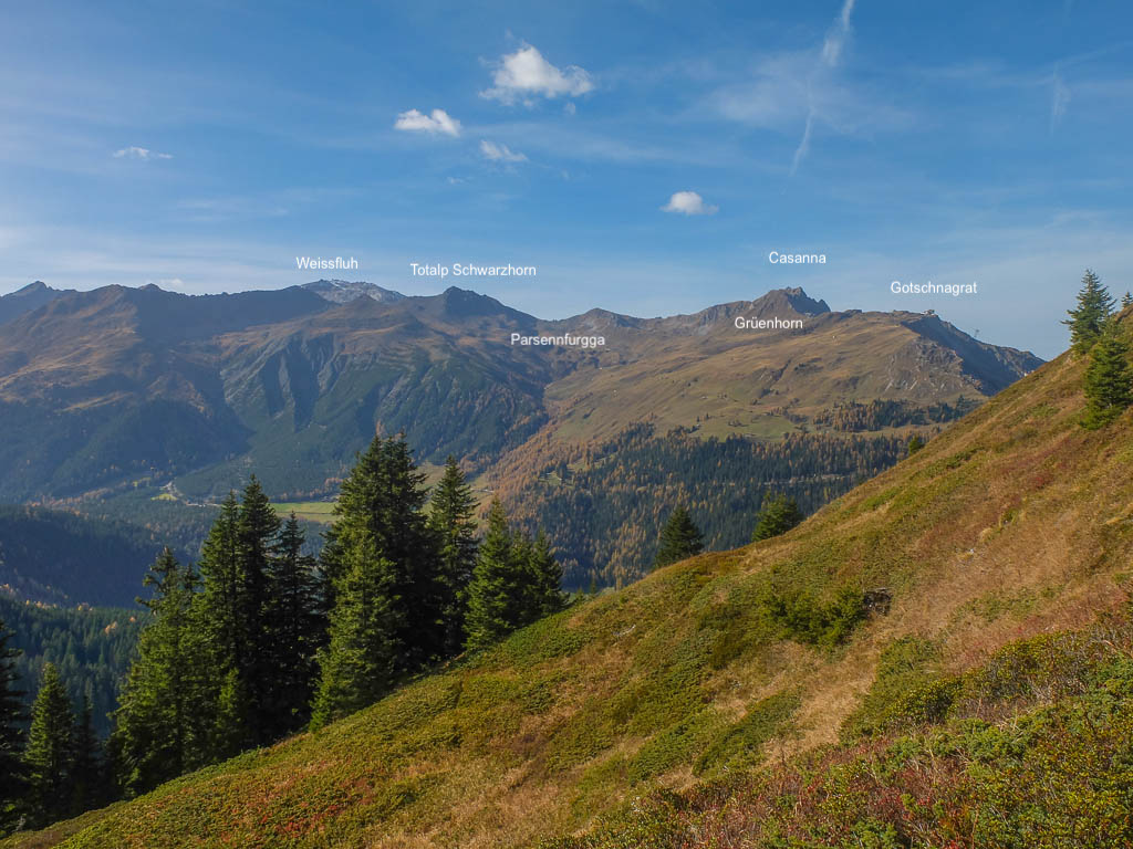 Schon unterhalb vom Hohliecht können wir beim Blick Richtung Nordwesten die Aussicht auf Gotschnagrat, Grüenhorn und Parsennfurgga und damit Zwischenziele unserer Wanderung vom 25. Oktober, Eine Herbstwanderung über Gotschnagrat, Grüenhorn, Weissfluhjoch und Strelapass, bewundern: