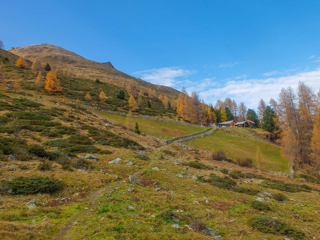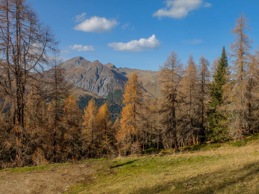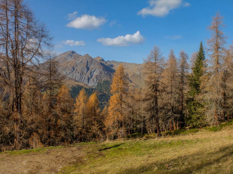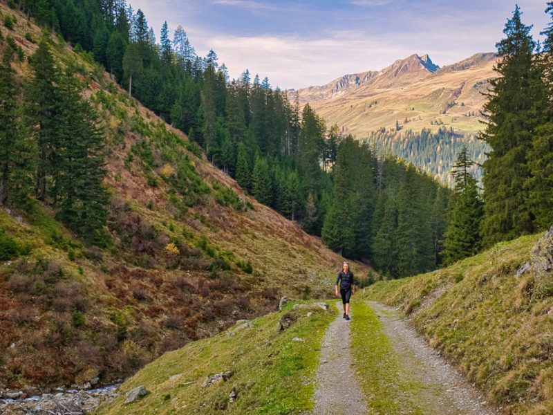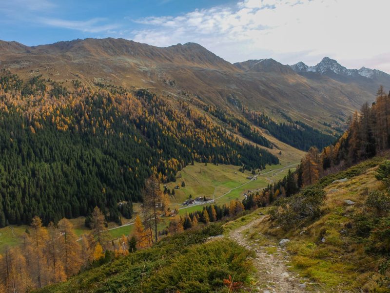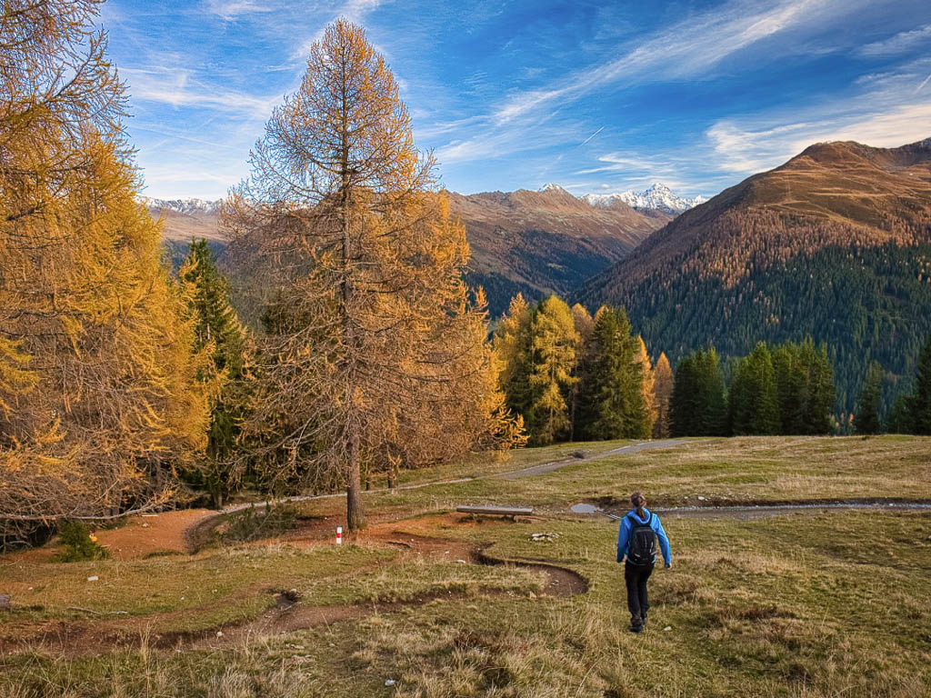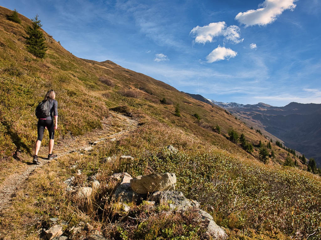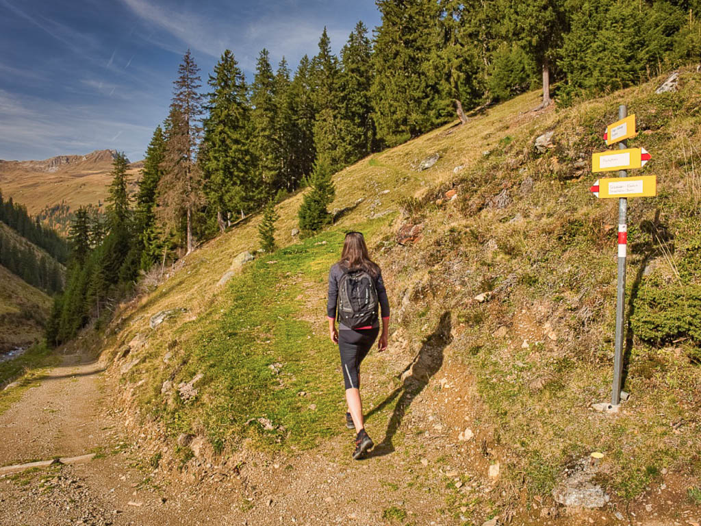 Stöcke wären hier sehr hilfreich, aber die liegen zu Hause! Unterhalb der Baumgrenze ist der Weg dann aber recht angenehm zu begehen und so liegen wir zeitmäßig schon bald wieder im grünen Bereich. Auf dem Wanderweg, der von Selfranga nach Laret führt: