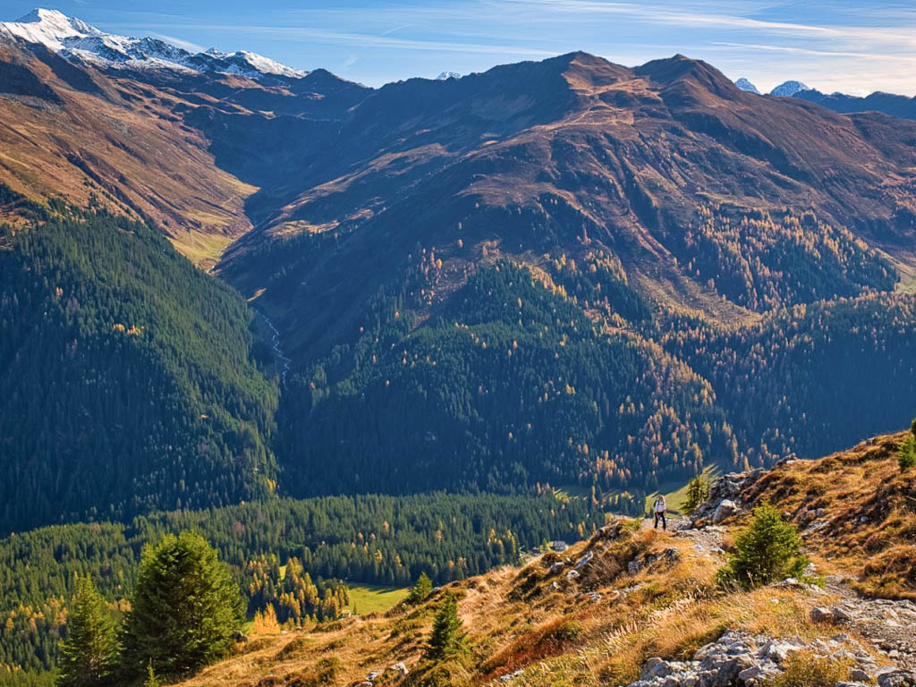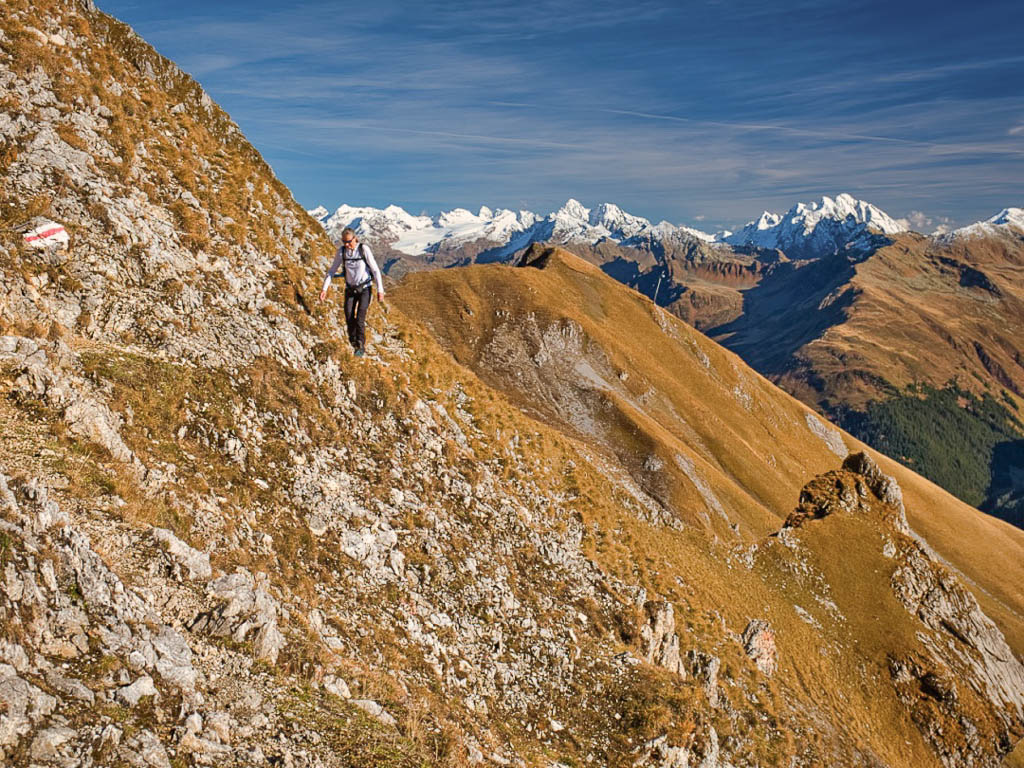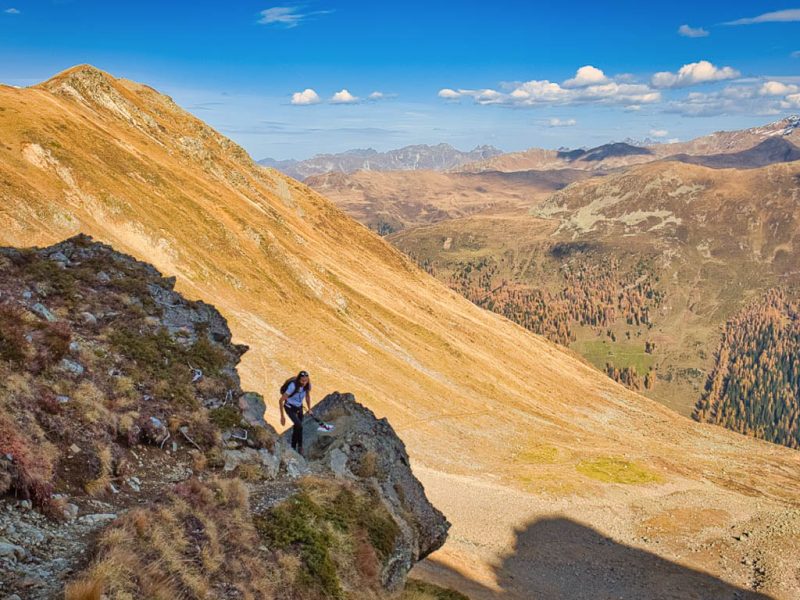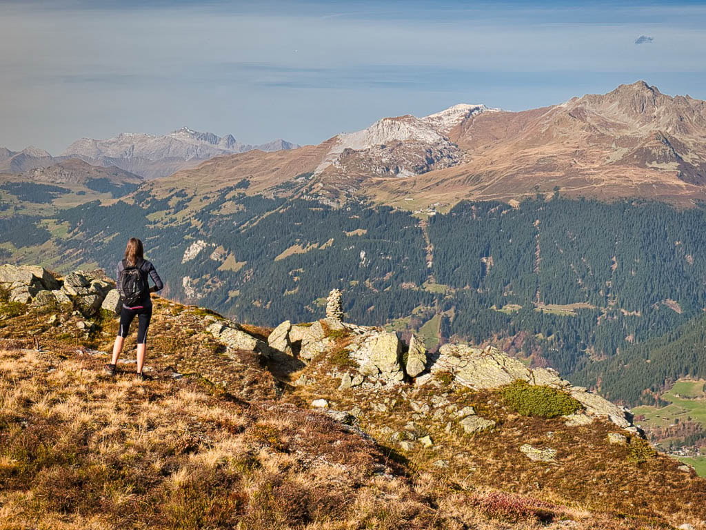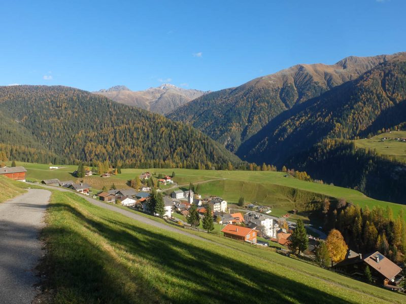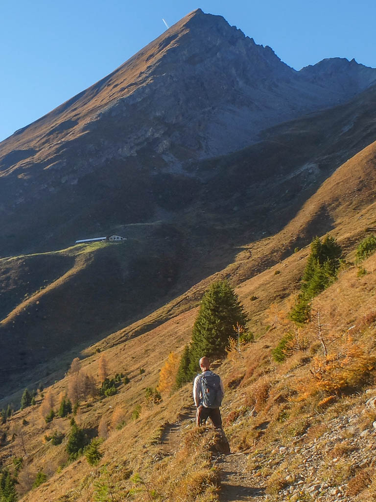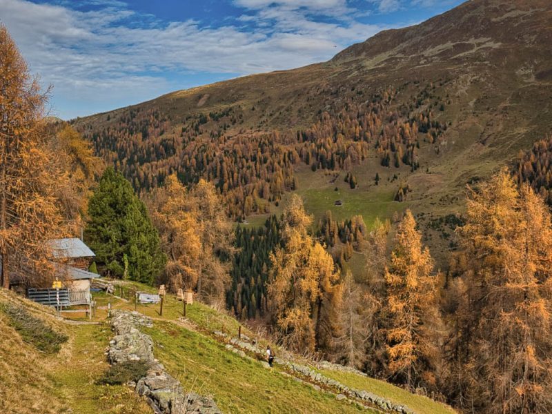 Stöcke wären hier sehr hilfreich, aber die liegen zu Hause! Unterhalb der Baumgrenze ist der Weg dann aber recht angenehm zu begehen und so liegen wir zeitmäßig schon bald wieder im grünen Bereich. Auf dem Wanderweg, der von Selfranga nach Laret führt: