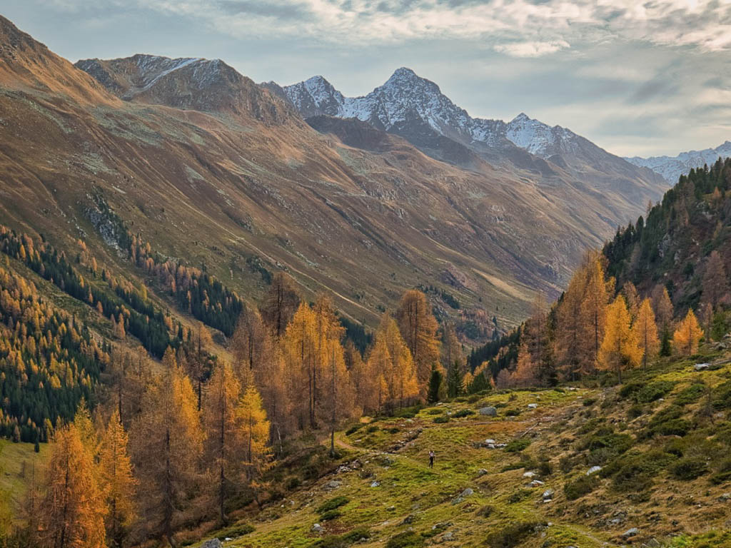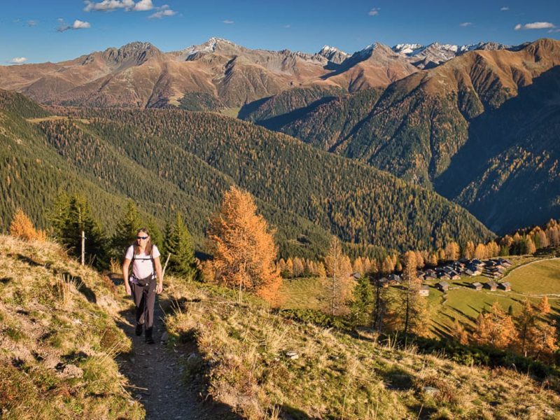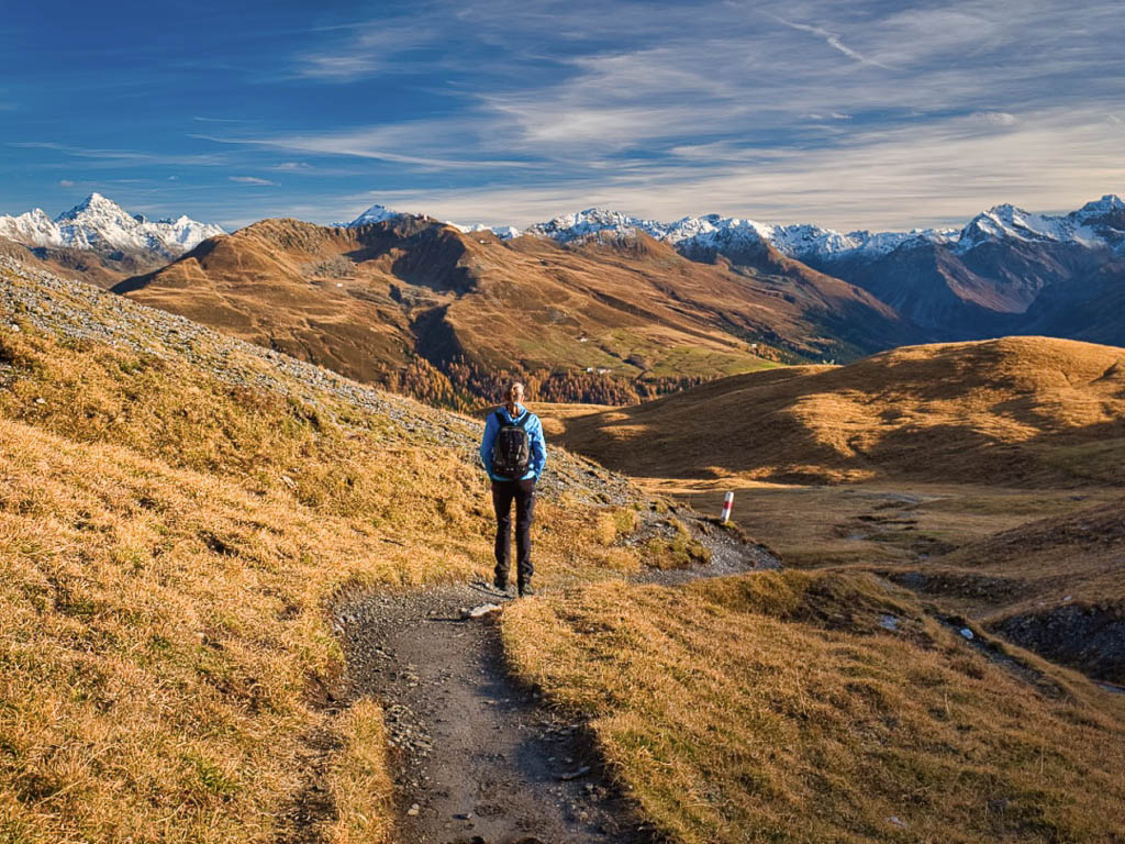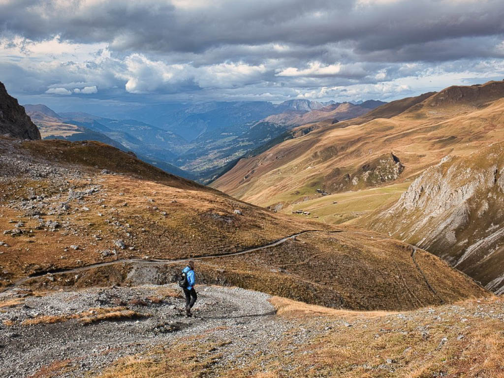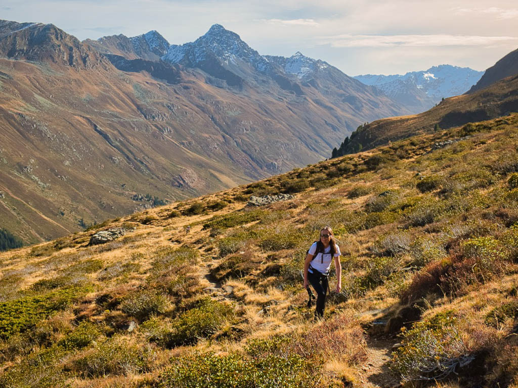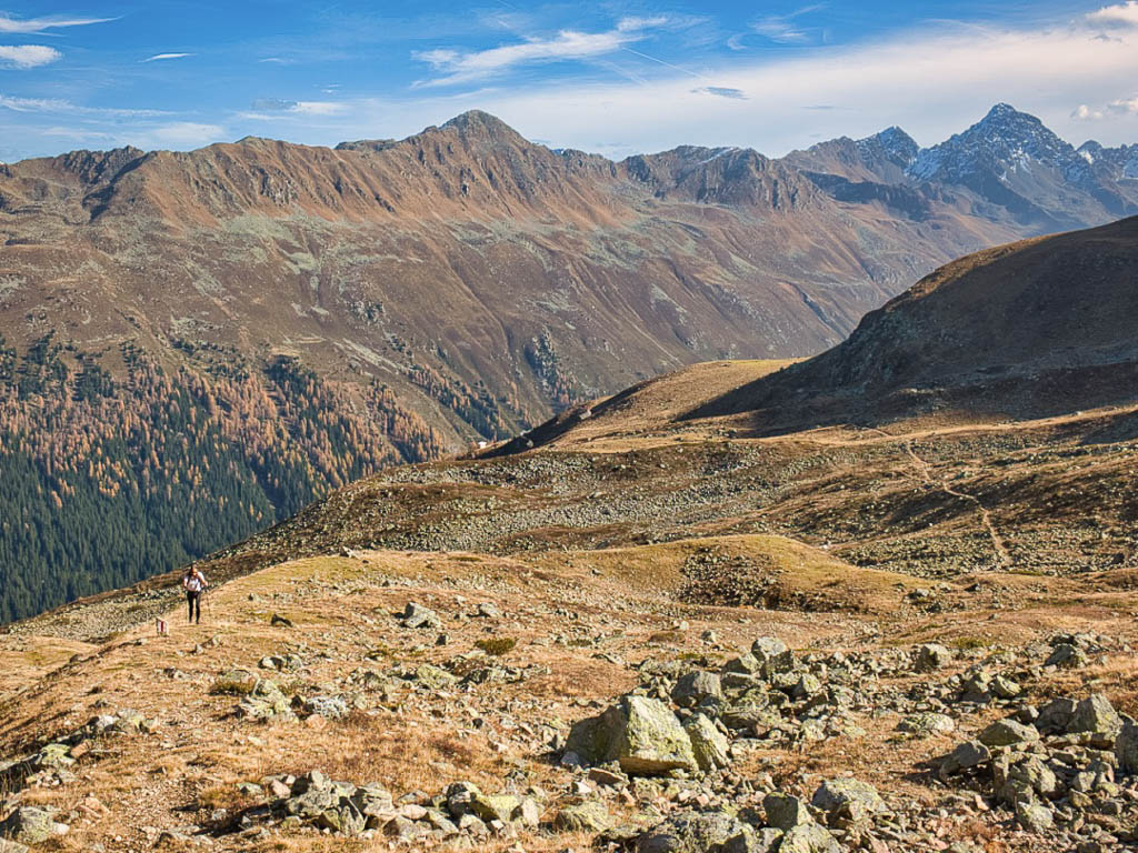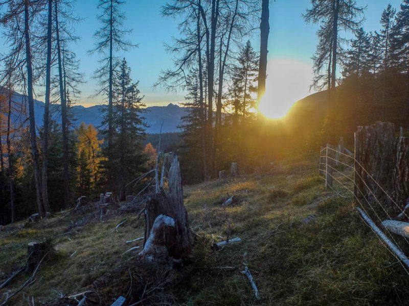 Stöcke wären hier sehr hilfreich, aber die liegen zu Hause! Unterhalb der Baumgrenze ist der Weg dann aber recht angenehm zu begehen und so liegen wir zeitmäßig schon bald wieder im grünen Bereich. Auf dem Wanderweg, der von Selfranga nach Laret führt: