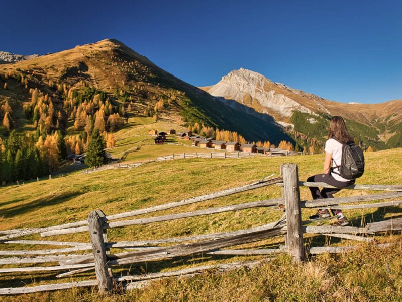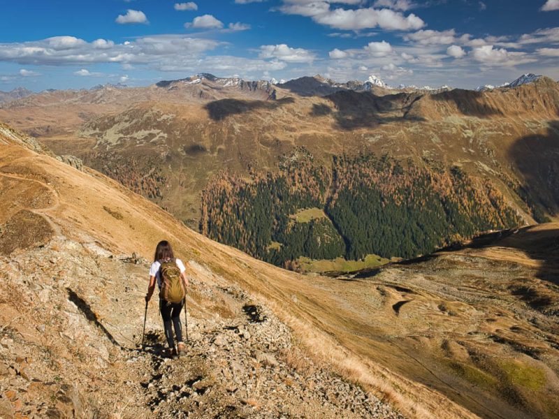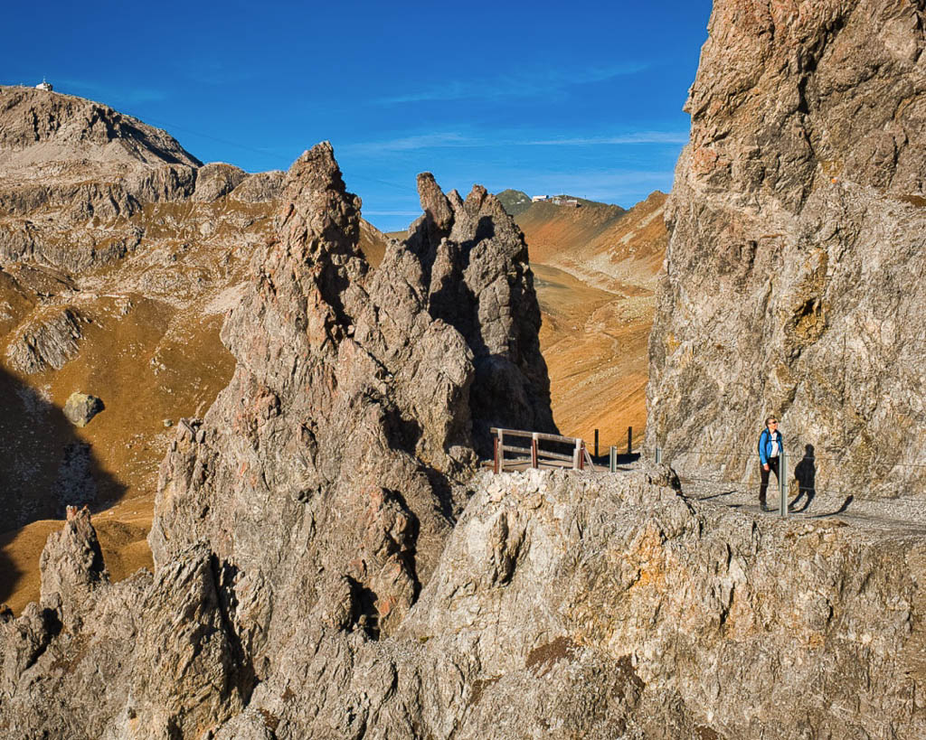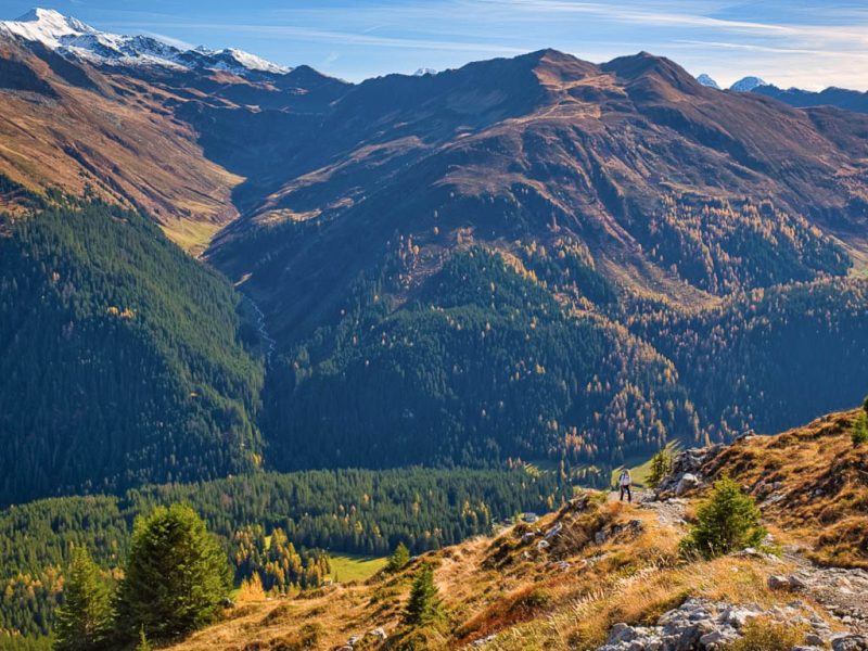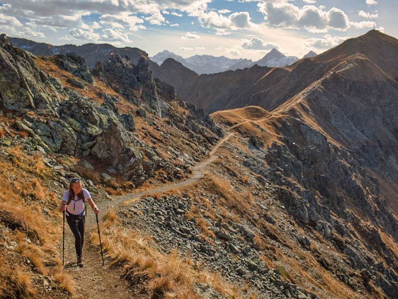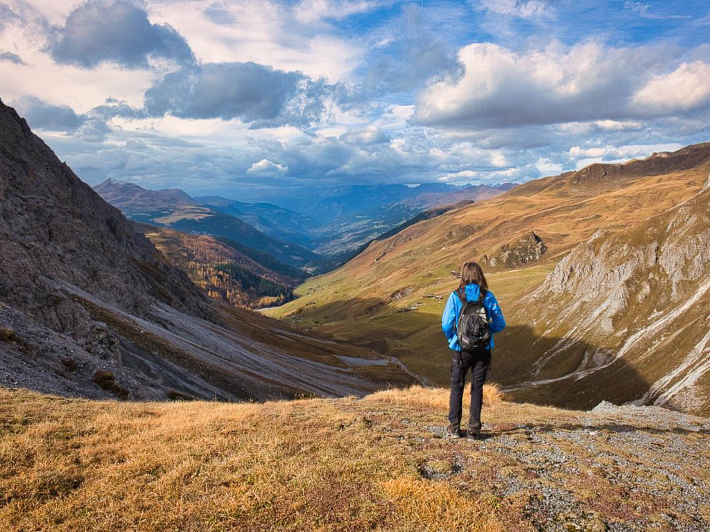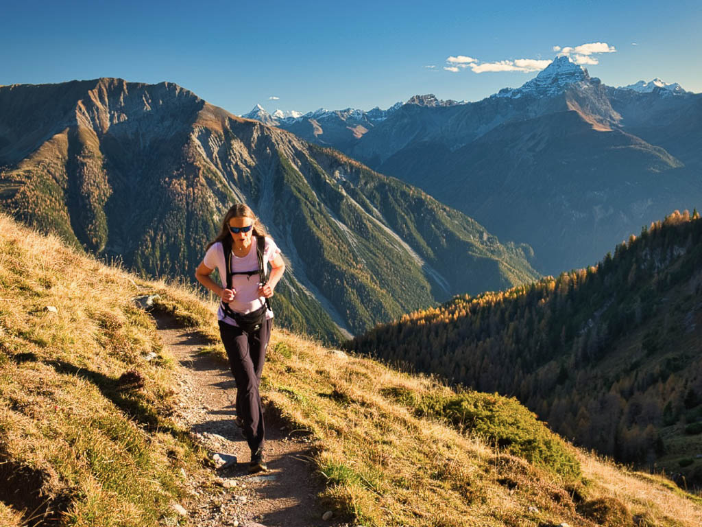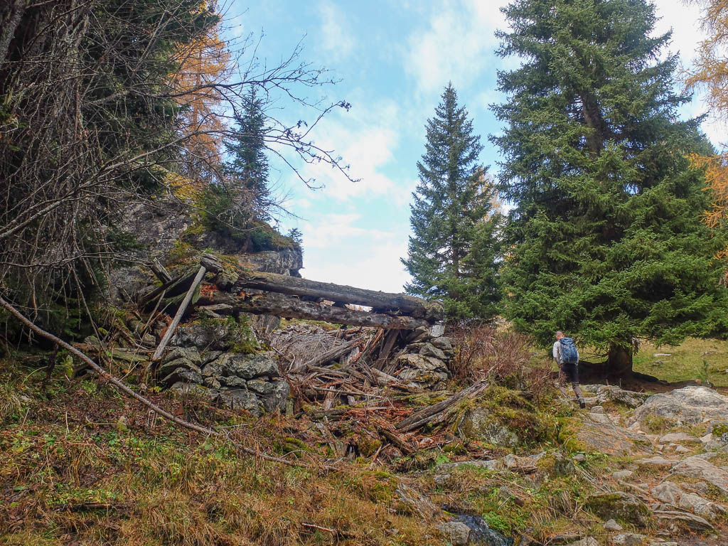 Stöcke wären hier sehr hilfreich, aber die liegen zu Hause! Unterhalb der Baumgrenze ist der Weg dann aber recht angenehm zu begehen und so liegen wir zeitmäßig schon bald wieder im grünen Bereich. Auf dem Wanderweg, der von Selfranga nach Laret führt: