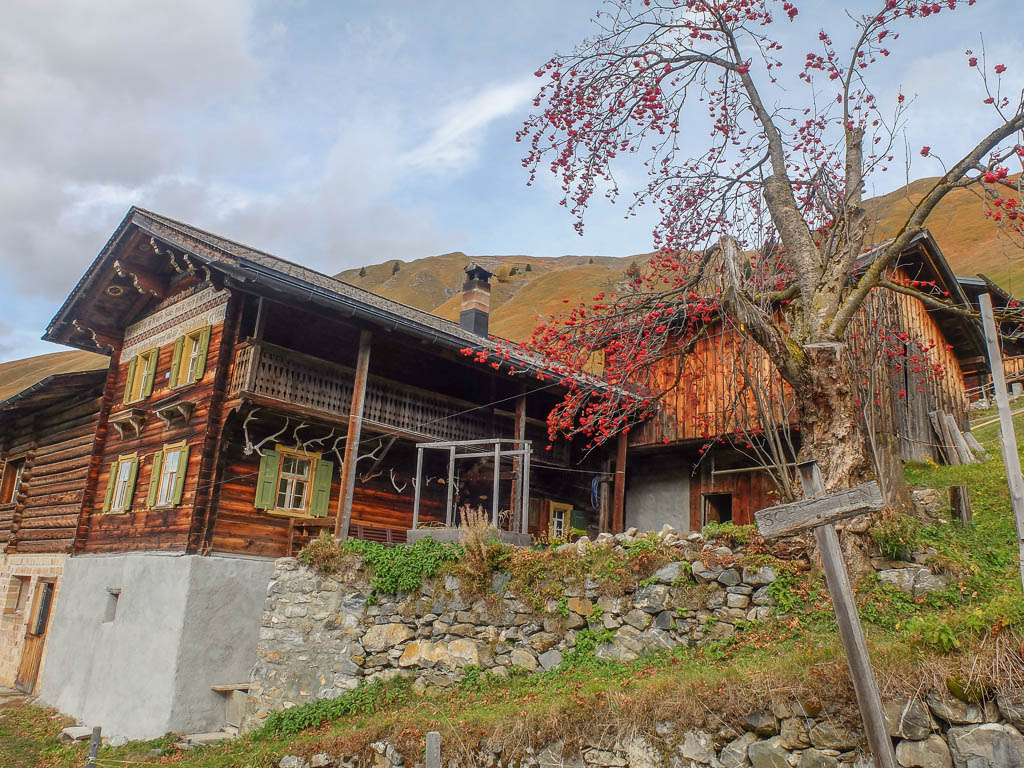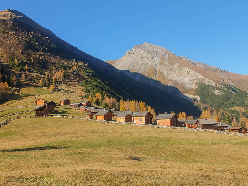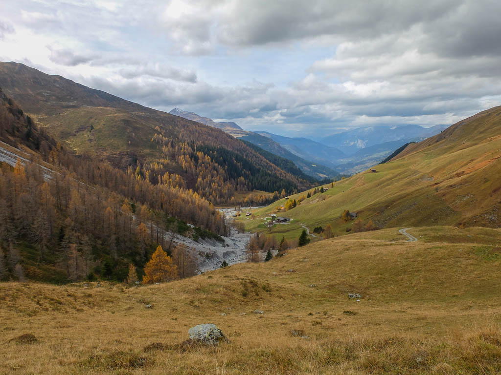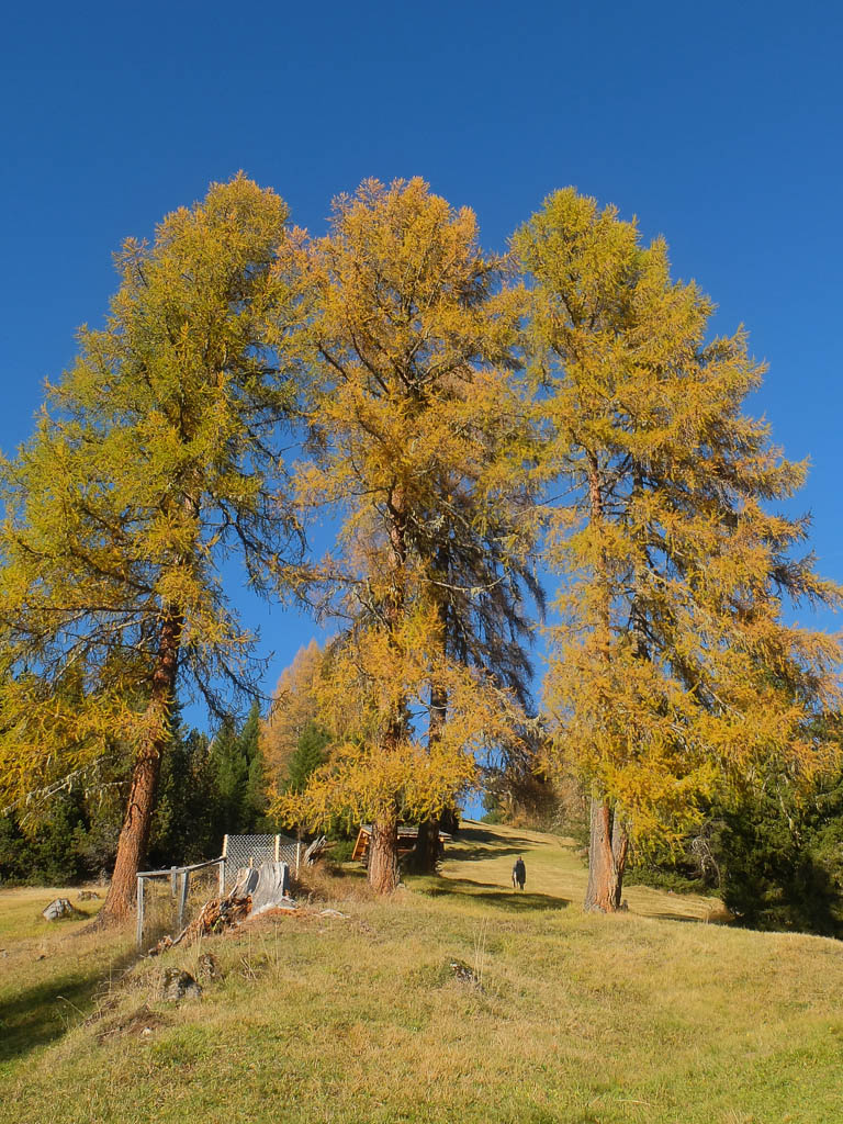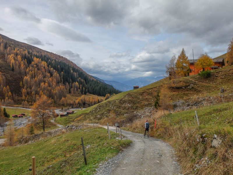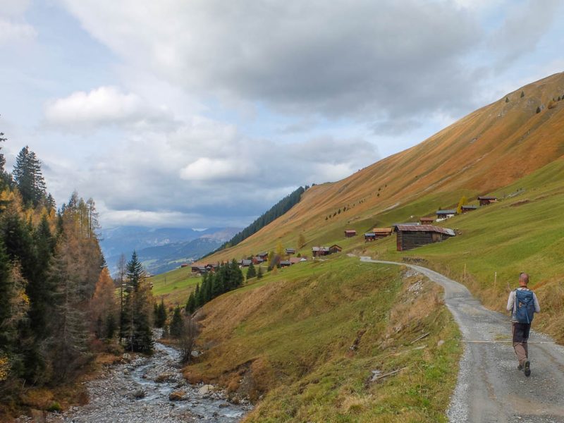 Und daher starten wir um 11.30 Uhr zu unserer nächsten Herbstwanderung: Mit dem Bus fahren wir nach Laret, einer Gemeinde, die zwischen Davos und Klosters liegt. Von Laret aus wollen wir entlang weiß-rot-weiß markierter Wanderwege über den Gotschnagrat und das 2500 Meter hohe Grüenhorn zur Parsennfurgga wandern. Dort entscheidet sich je nach Lust, Laune und Uhrzeit, wie es weitergeht. Nach dem Passieren des Ortskern von Laret geht es erst einmal über einen steilen, nicht markierten, schmalen Pfad aufwärts. Der Pfad ist kein offizieller Wanderweg und wird wohl nicht sehr häufig benutzt. Er ist nämlich nicht nur schmal, sondern teilweise kaum zu erkennen und zudem äußerst feucht! Aber egal, es ist der kürzeste Weg zur Schwarseealp, unserem ersten Zwischenziel: