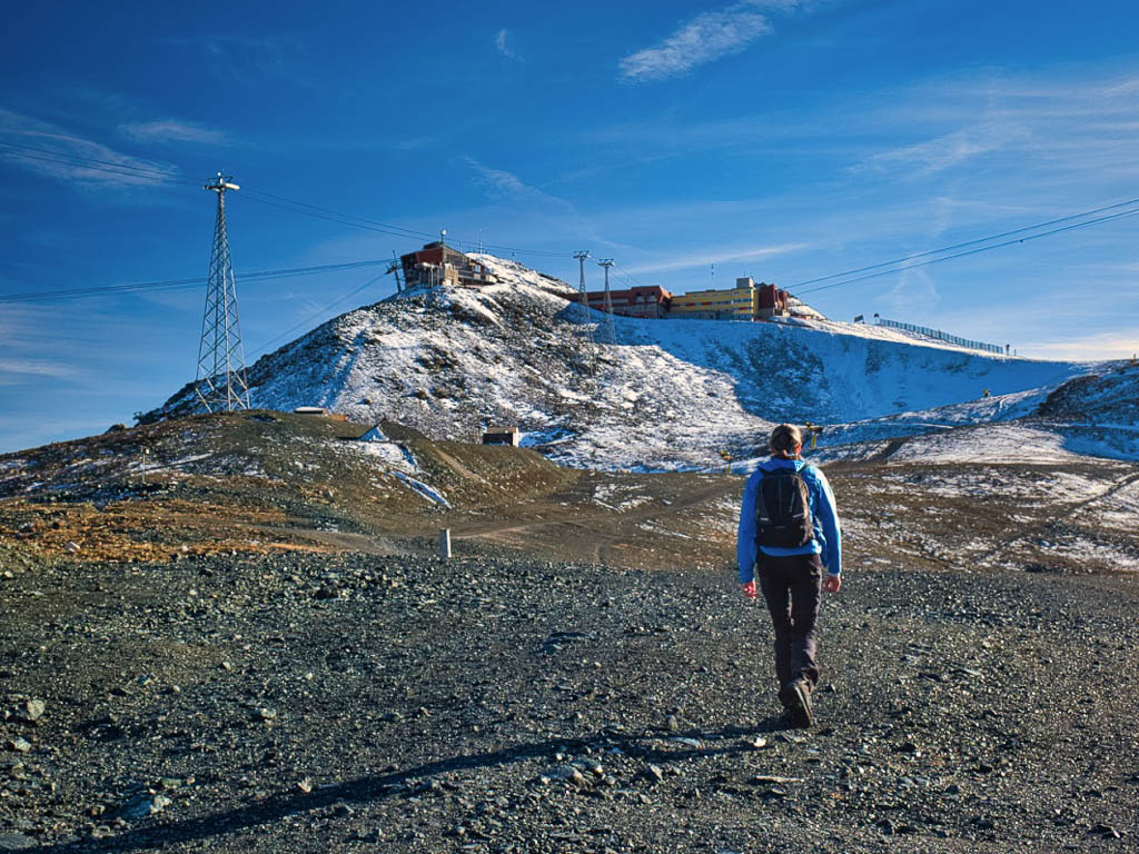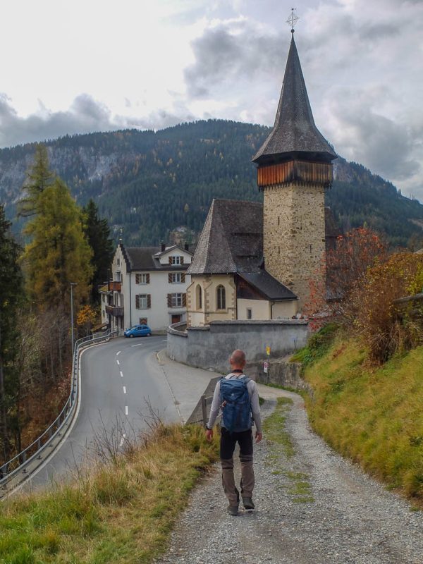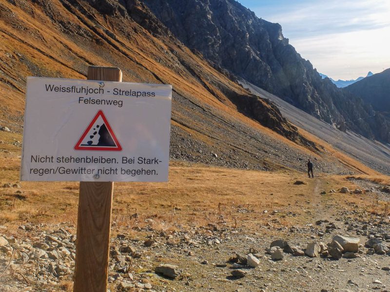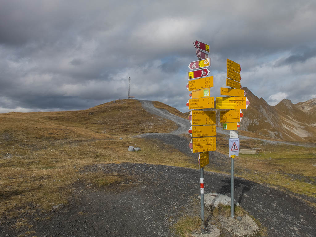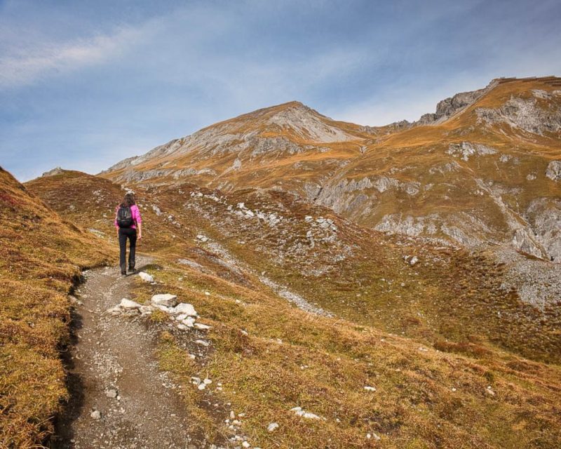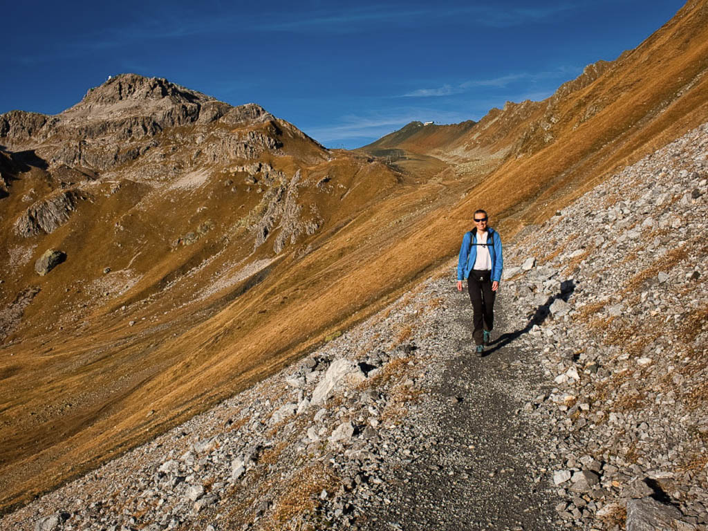 Und daher starten wir um 11.30 Uhr zu unserer nächsten Herbstwanderung: Mit dem Bus fahren wir nach Laret, einer Gemeinde, die zwischen Davos und Klosters liegt. Von Laret aus wollen wir entlang weiß-rot-weiß markierter Wanderwege über den Gotschnagrat und das 2500 Meter hohe Grüenhorn zur Parsennfurgga wandern. Dort entscheidet sich je nach Lust, Laune und Uhrzeit, wie es weitergeht. Nach dem Passieren des Ortskern von Laret geht es erst einmal über einen steilen, nicht markierten, schmalen Pfad aufwärts. Der Pfad ist kein offizieller Wanderweg und wird wohl nicht sehr häufig benutzt. Er ist nämlich nicht nur schmal, sondern teilweise kaum zu erkennen und zudem äußerst feucht! Aber egal, es ist der kürzeste Weg zur Schwarseealp, unserem ersten Zwischenziel: