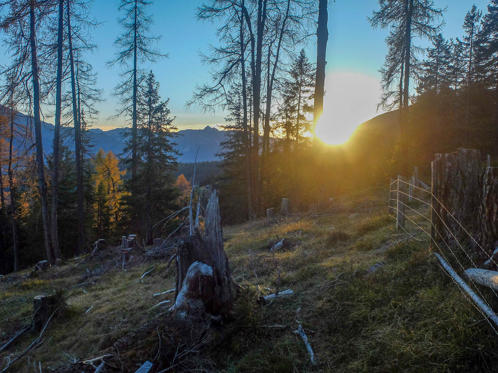 Wir lassen uns sehr viel Zeit hier oben, so viel Zeit, dass wir Gefahr laufen, unseren Bus zu verpassen, wenn wir wie geplant nicht auf gleichem Weg, sondern über Klosters Selfranga absteigen. Trotzdem wählen wir diesen Weg, in der Hoffnung, im unteren Teil des Abstiegs Zeit gut machen können. Zu Beginn ist dies kaum möglich, der Weg ist extrem steil, feucht und somit rutschig: