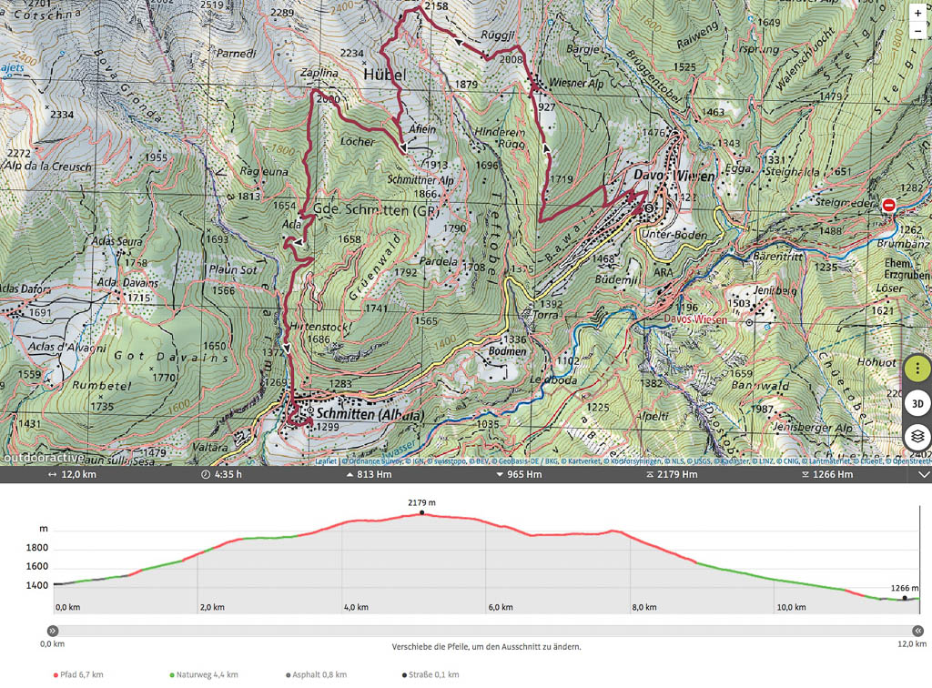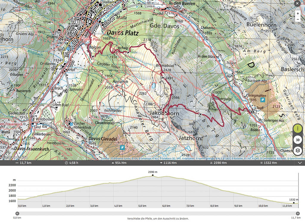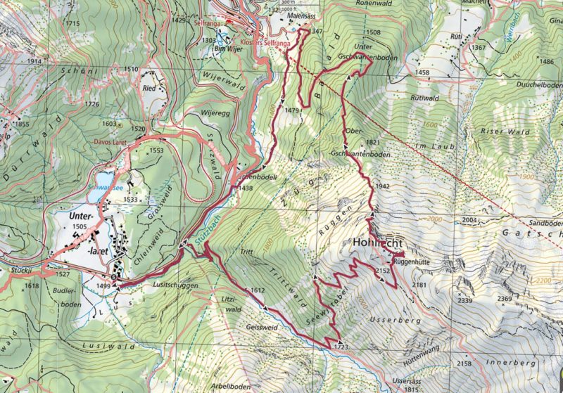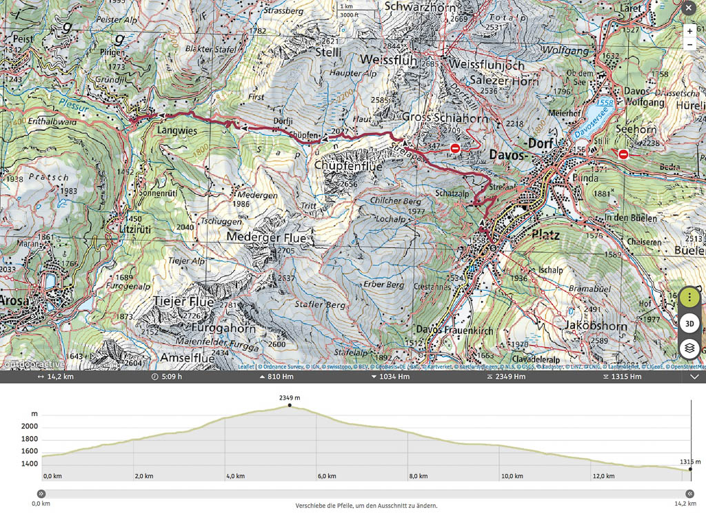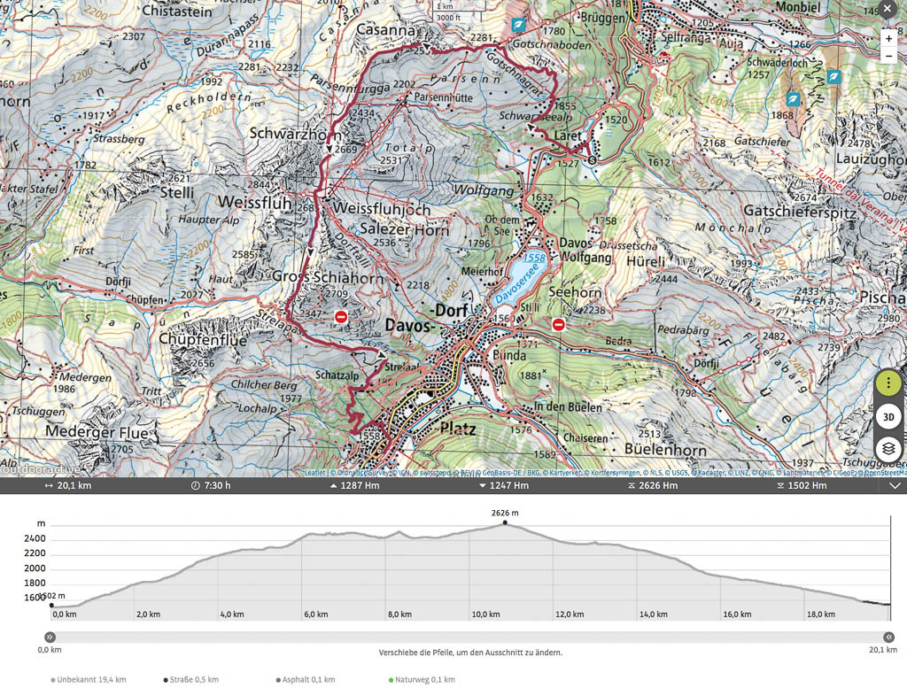 Hier kommen uns zahlreiche Biker entgegen, so dass wir ab und zu zur Seite springen müssen! Dreieinhalb Stunden nach Beginn unserer Wanderung erreichen wir rechtzeitig vor Abfahrt des Busses die Haltestelle von Davos Laret, Landhaus. Die Tour in der Übersicht: