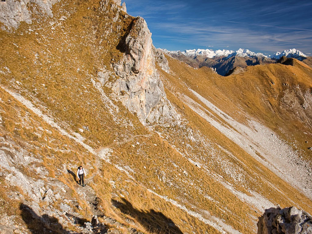 Der Wanderweg führt über die Rüggenhütte, wir verlassen allerdings den Weg vor der Hütte und steigen ein paar Meter weglos auf. Hier stehen wir oberhalb des Hohliechts und blicken Richtung Gatschieferspitz hinauf: