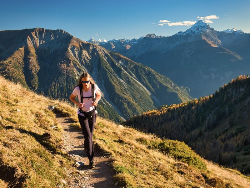 Ab hier schlängelt sich der Weg im Sonnenlicht zwischen Heidelbeersträuchern und Alpenrosen empor: