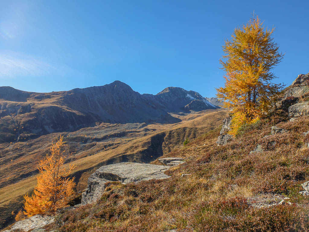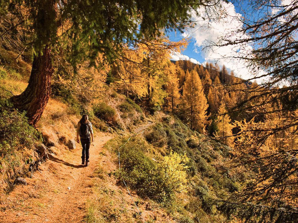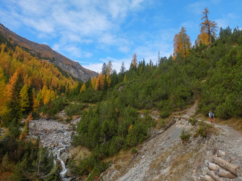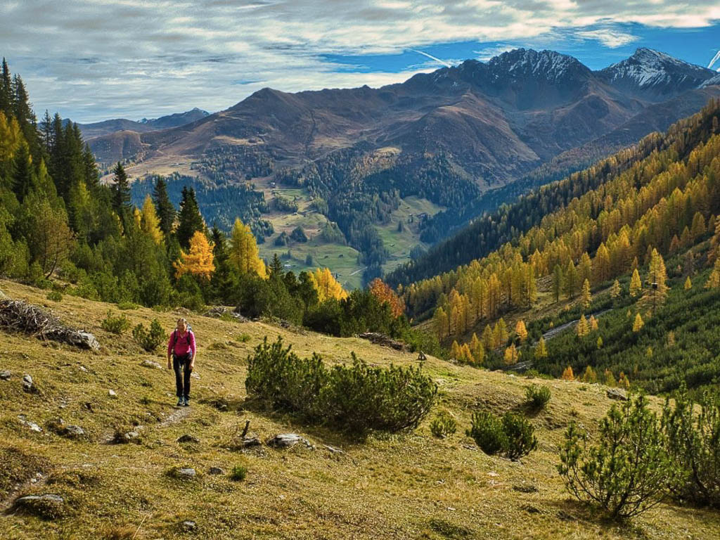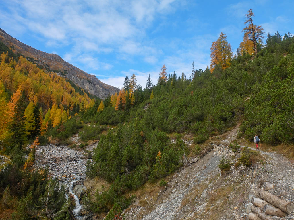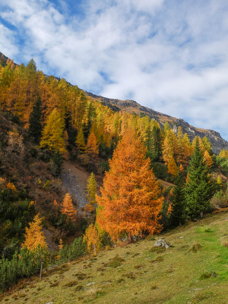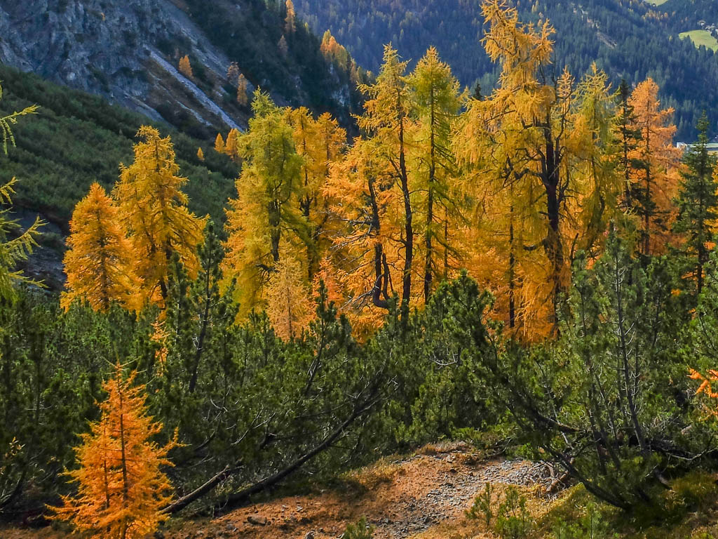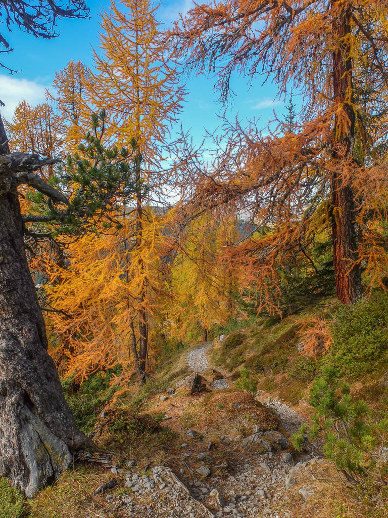 Der Weg ist nicht sonderlich steil, so dass man die Landschaft und vor allem die herbstlich gefärbten Lärchen intensiv genießen kann: