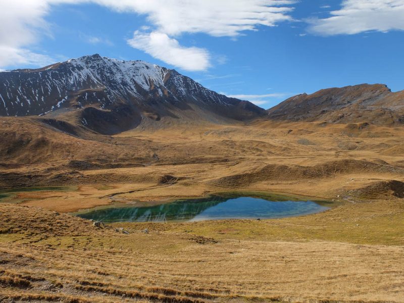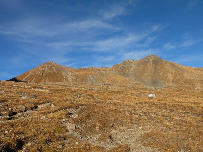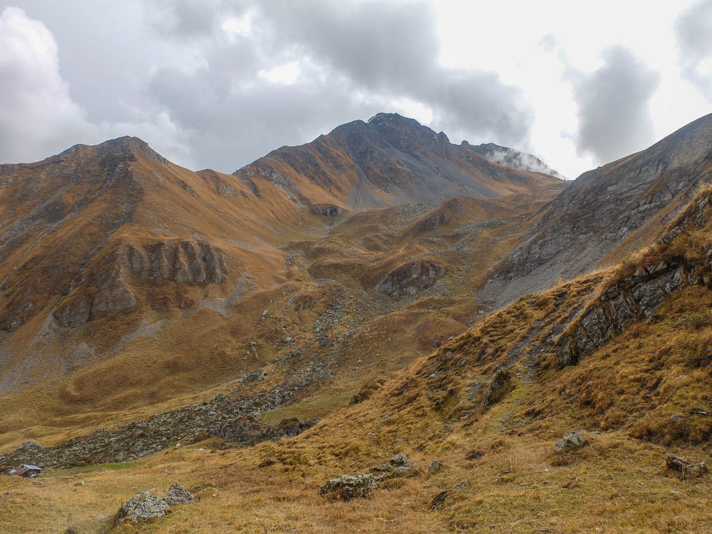 Der direkte Weg nach Arosa führt vom See aus über die Alteiner Wasserfälle hinunter. Wir wollen unsere Wanderung allerdings mit einer Gipfelbesteigung würzen und wenden uns Richtung Schiesshorn, das hier in der rechten Bildhälfte zu sehen ist: