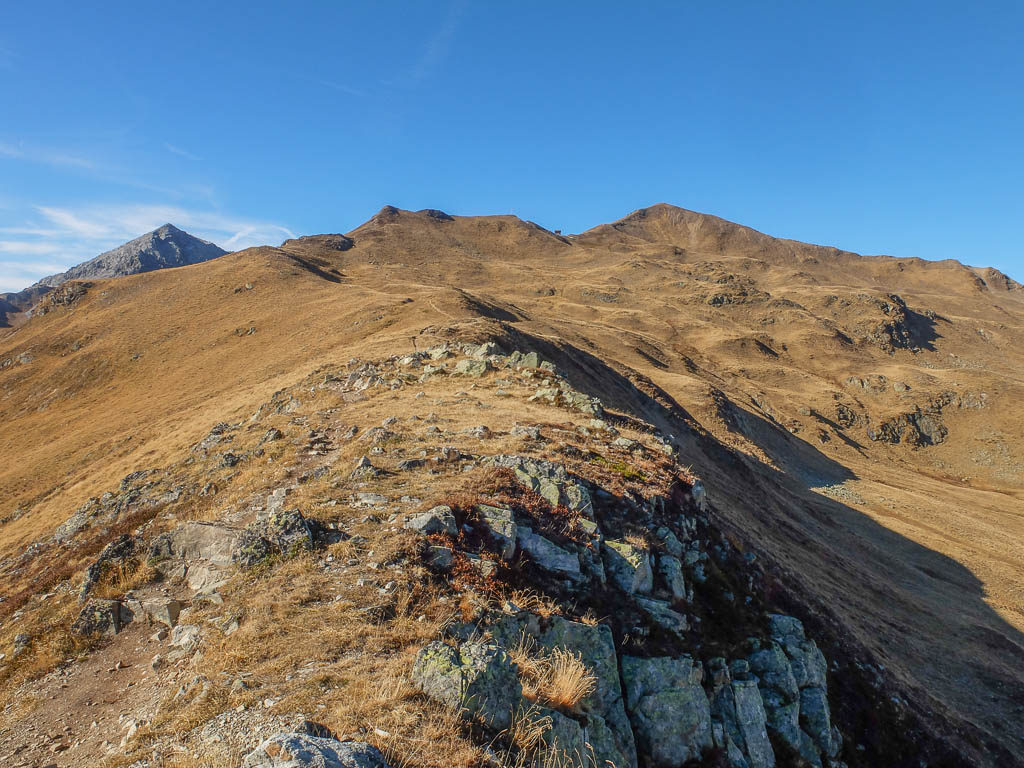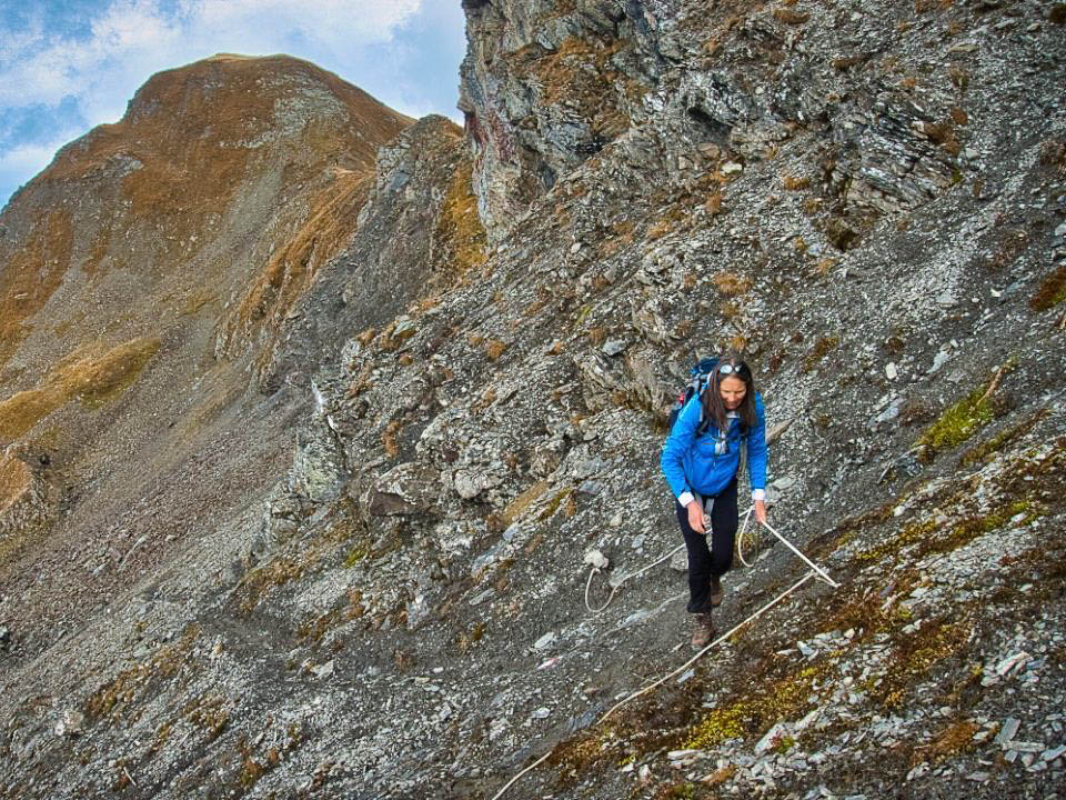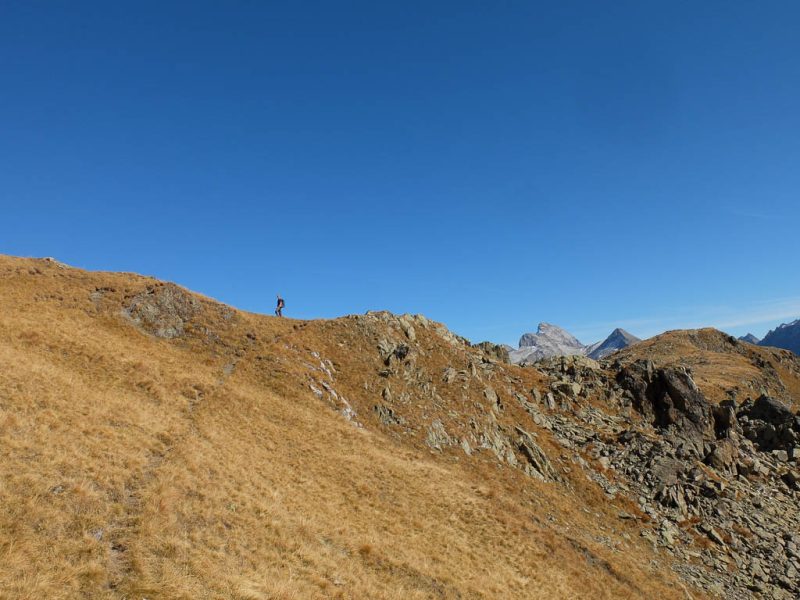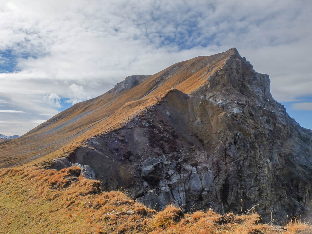An der Schiesshorn Furgga treffen wir erstmals am heutigen Tag auf andere Wanderer. Der Aufstieg von der Furgga über die begrasten Rasenhänge des Südgrats: