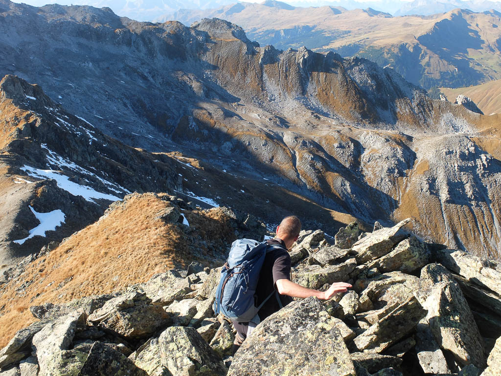 Der Blick vom Grat hinunter in die 700 Meter hohe, extrem steile Nordwand ist sehr beeindruckend. Ich halte daher einen gebührenden Abstand von der Gratkante! Teilweise geht es ziemlich steil über feines Geröll hinunter, aber solches Gelände ist uns ja vertraut:
