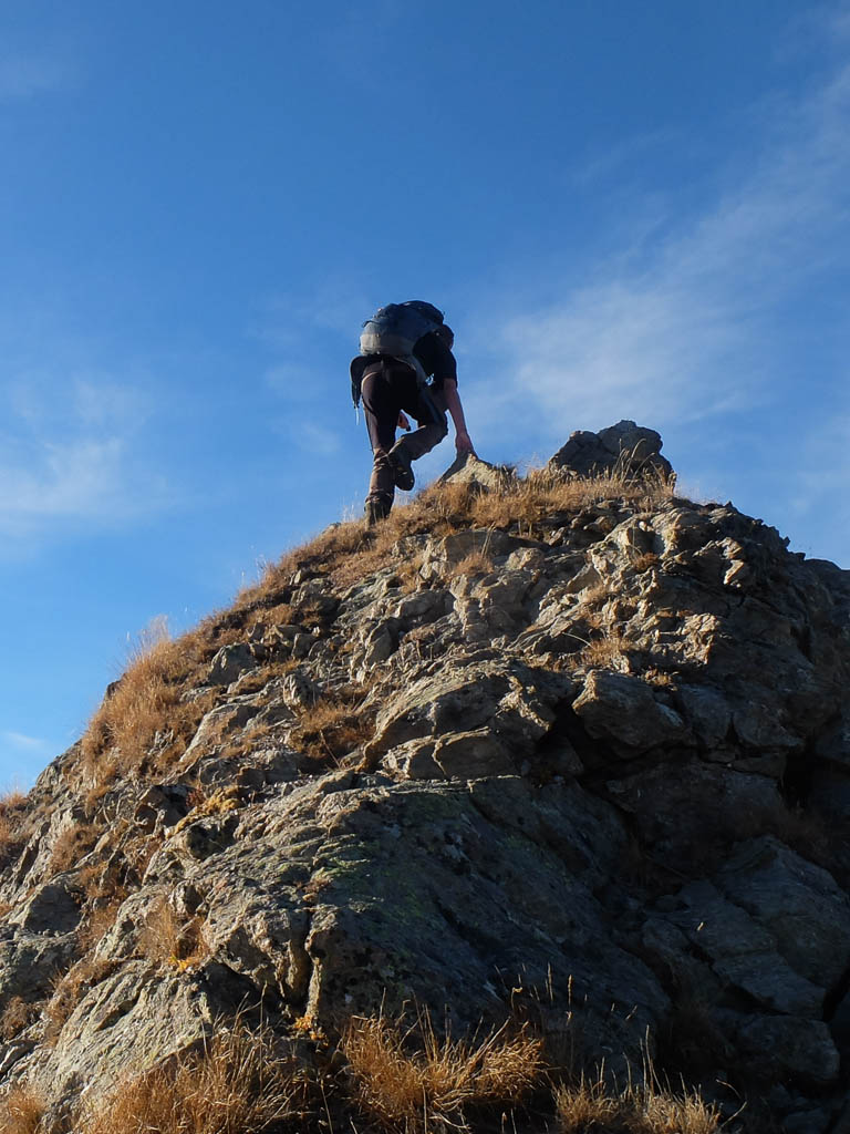 Vom eigentlichen Gipfel führt eine schmale Pfadspur die steile, mit Geröll durchsetzte Ostflanke hinunter: