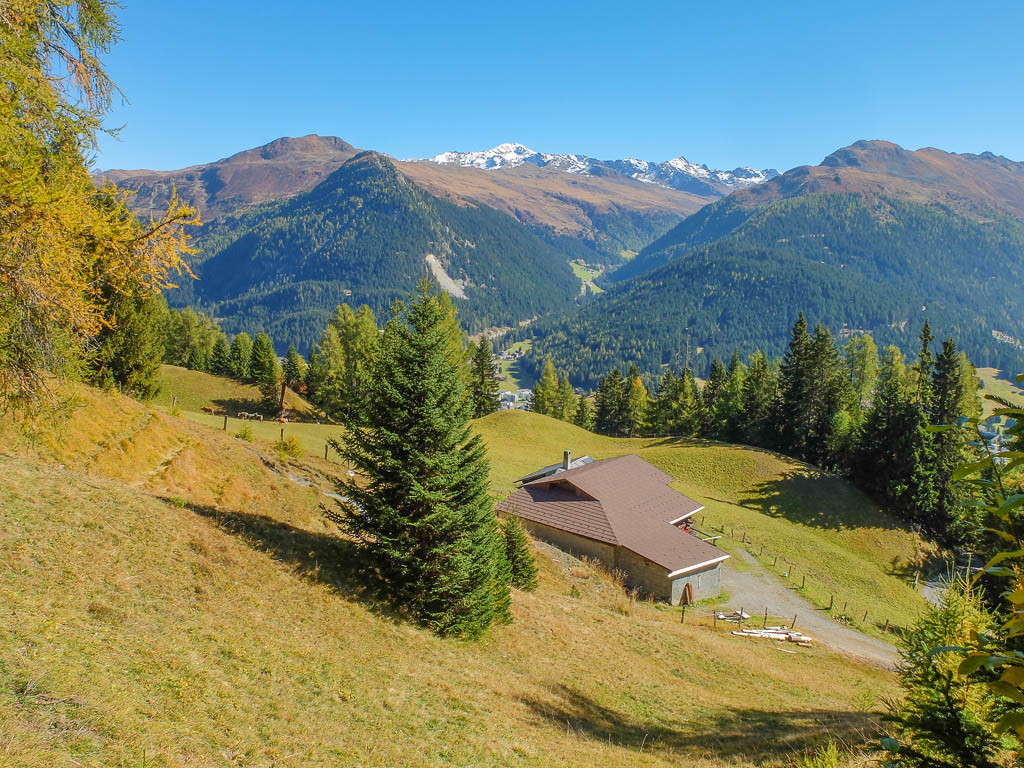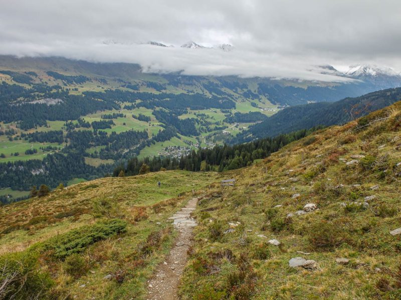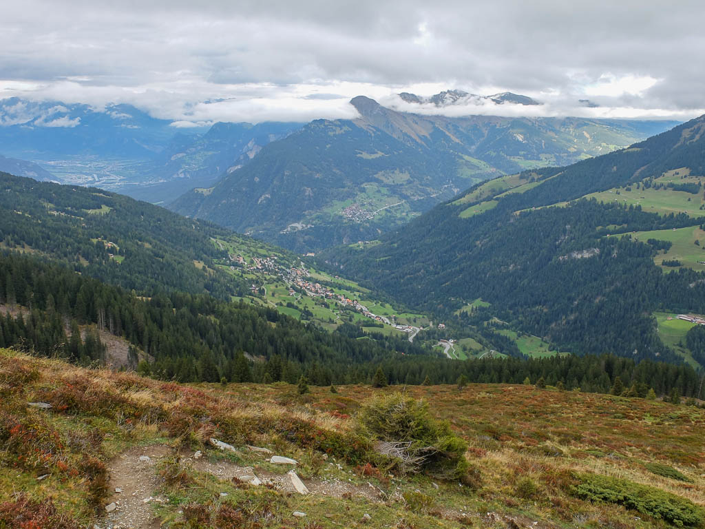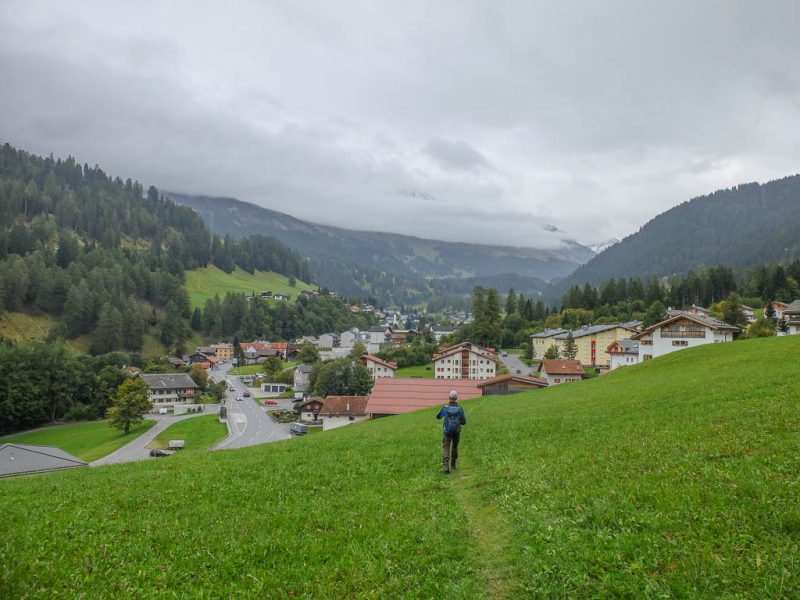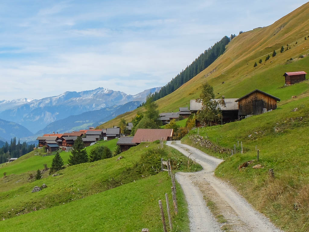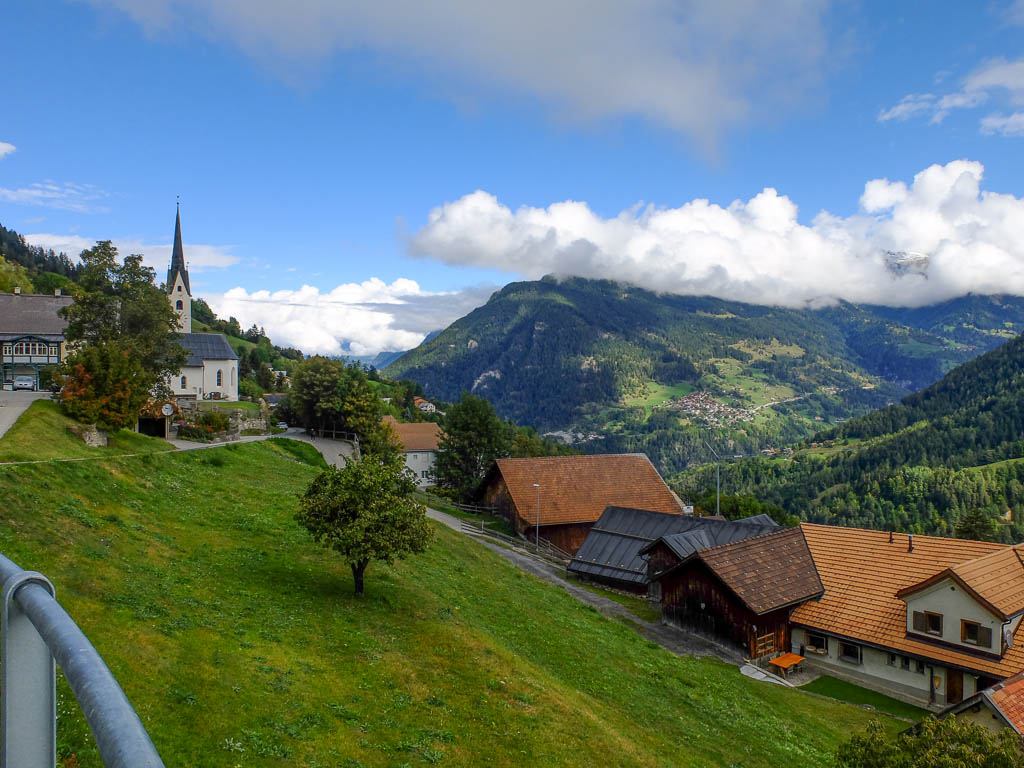 Um die Mittagszeit fahren wir dann mit dem Postbus über Lenzerheide nach Malix, um von dort aus hinauf zum Dreibündenstein zu wandern. Die Drei Bünde waren ein Freistaat im Gebiet des heutigen Kantons Graubünden, bestehend aus dem Gotteshausbund, dem Oberen oder Grauen Bund und dem Zehngerichtebund. Am Dreibündenstein war einziger, dreifacher Grenzpunkt des ehemaligen Freistaats. Der Blick über die Dächer von Malix kurz nach Beginn der Wanderung: