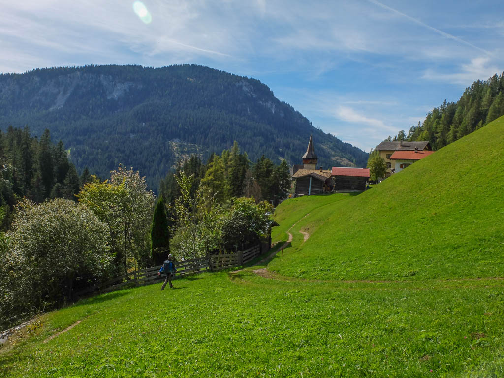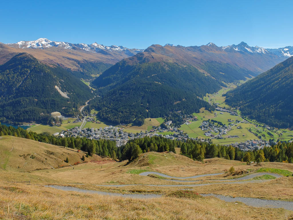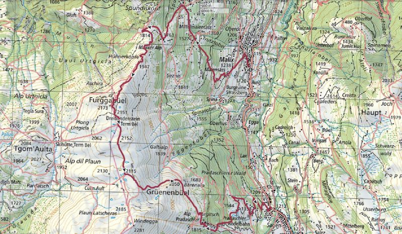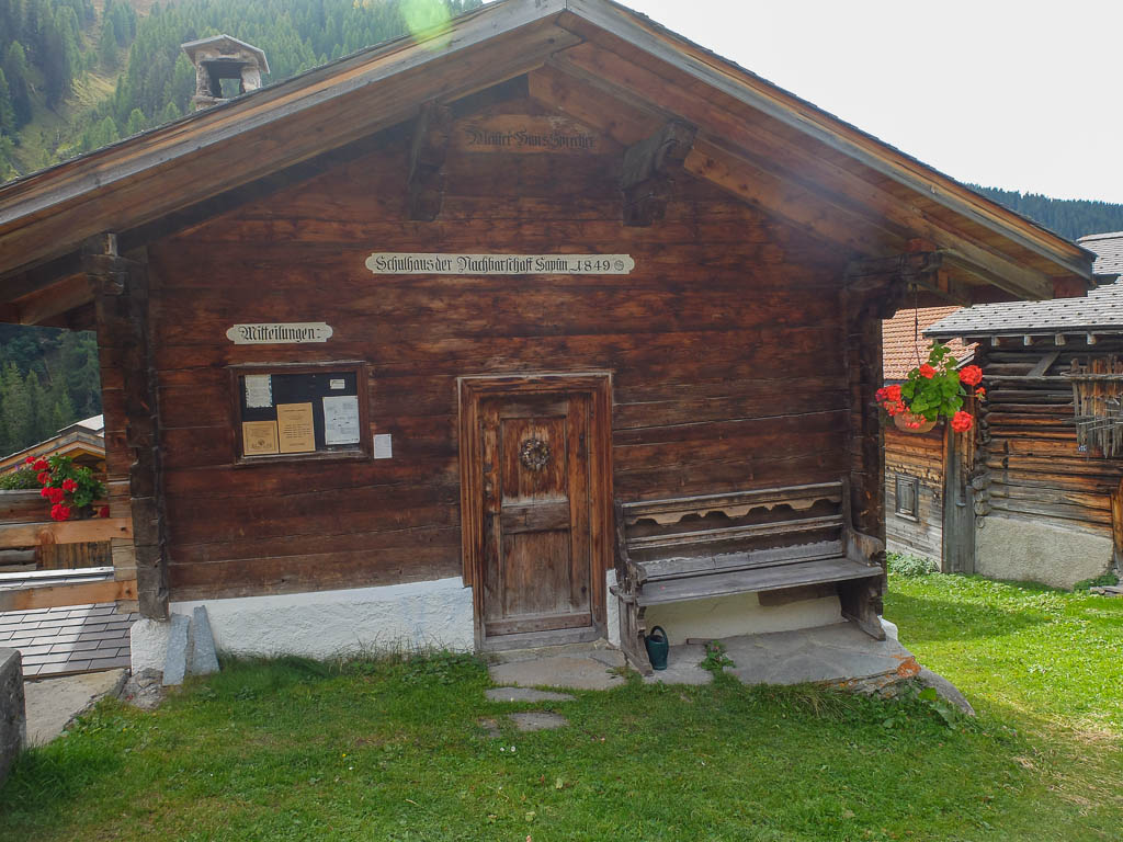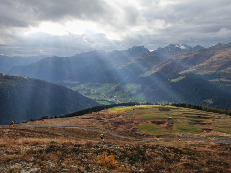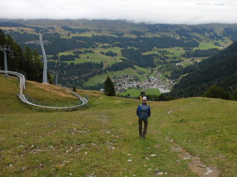 Um die Mittagszeit fahren wir dann mit dem Postbus über Lenzerheide nach Malix, um von dort aus hinauf zum Dreibündenstein zu wandern. Die Drei Bünde waren ein Freistaat im Gebiet des heutigen Kantons Graubünden, bestehend aus dem Gotteshausbund, dem Oberen oder Grauen Bund und dem Zehngerichtebund. Am Dreibündenstein war einziger, dreifacher Grenzpunkt des ehemaligen Freistaats. Der Blick über die Dächer von Malix kurz nach Beginn der Wanderung: