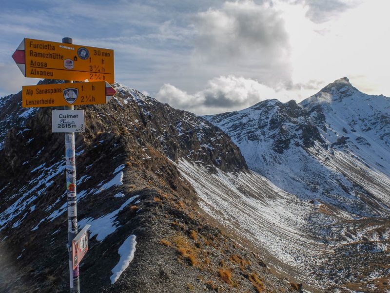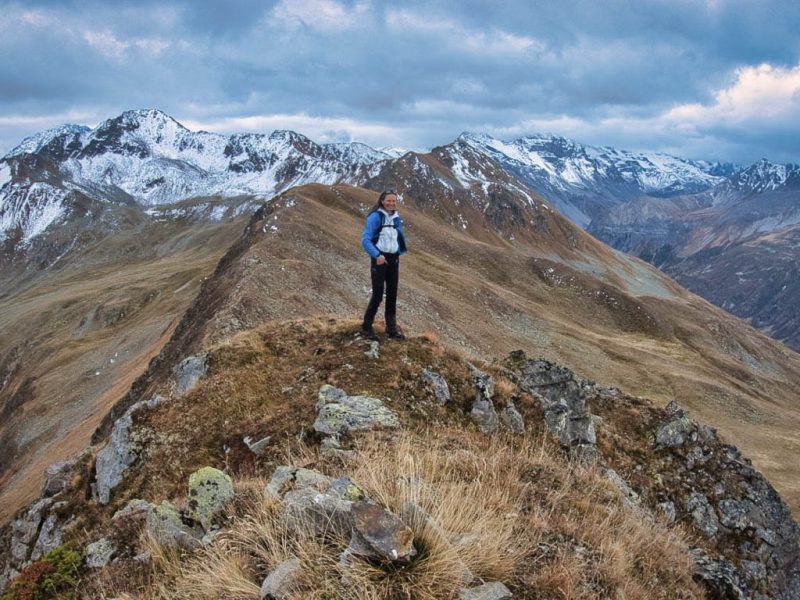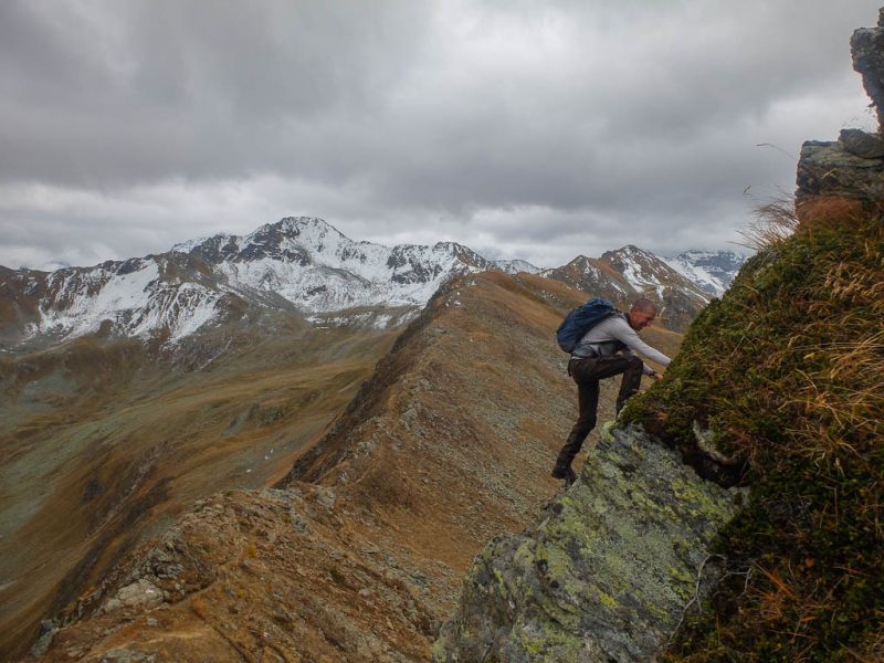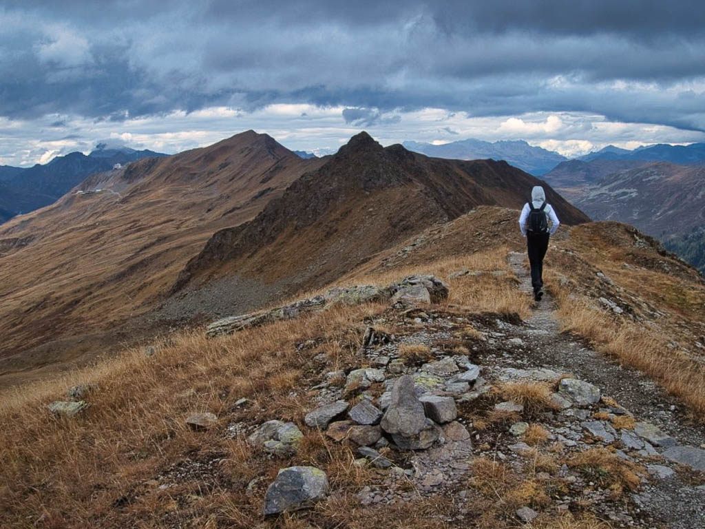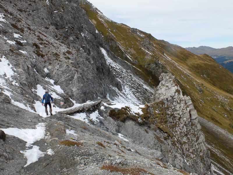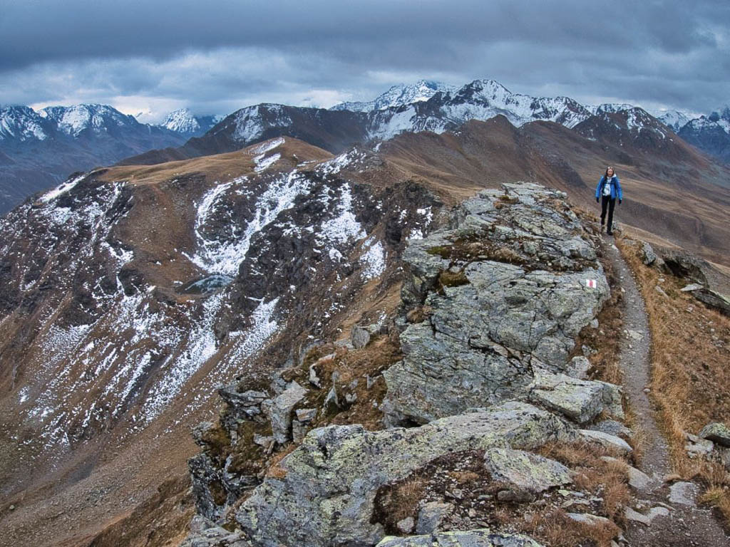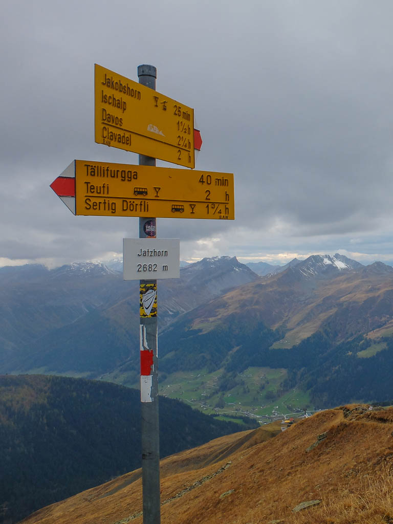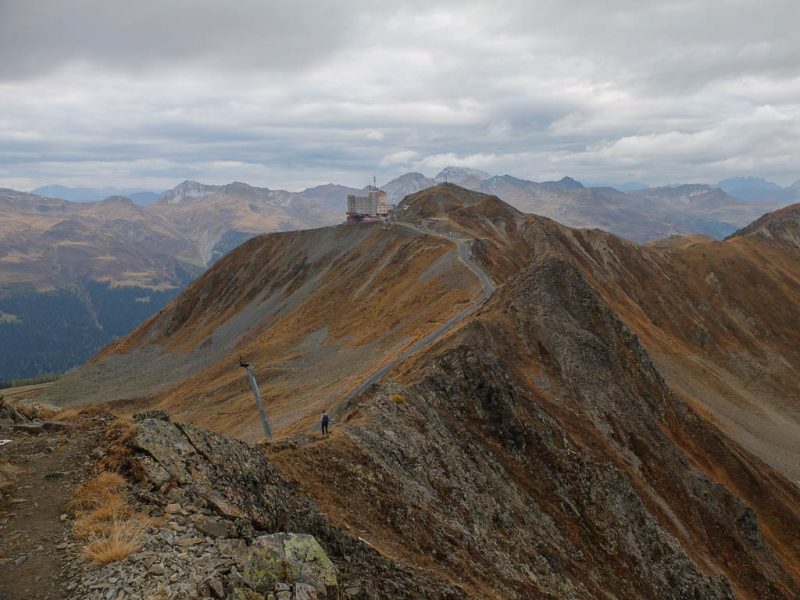 Hier standen wir schon einmal in strömendem Regen: Eine kurze Gratwanderung vom Jakobshorn zum Jatzhorn. Der weitere, zum Jakobshorn führende Weg: