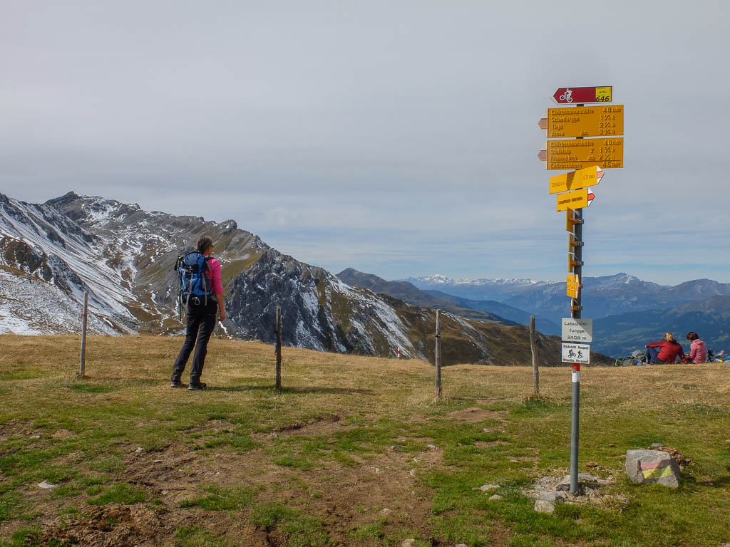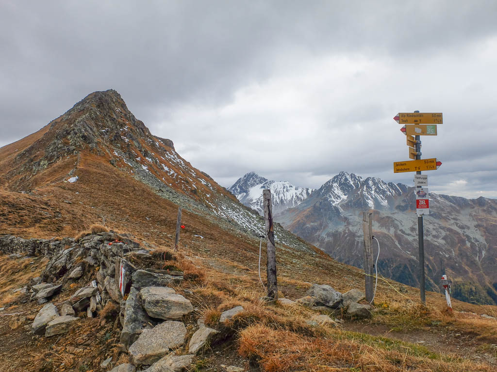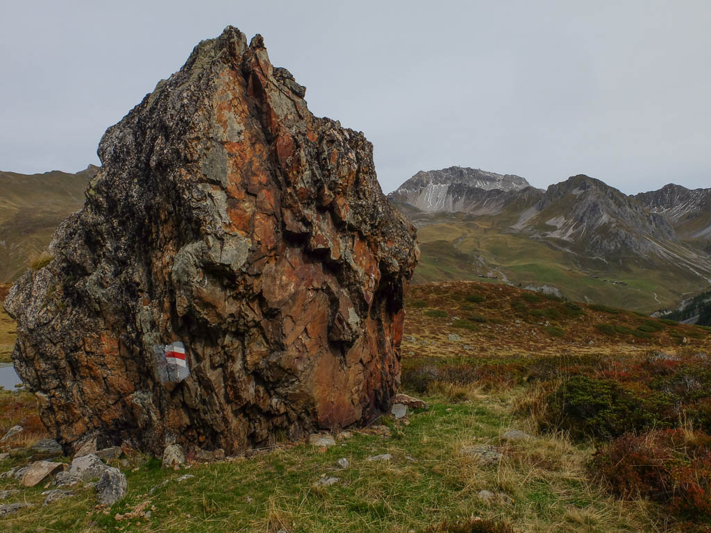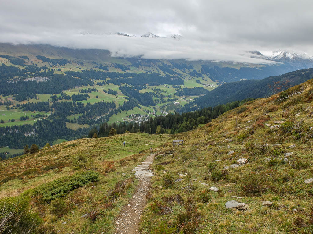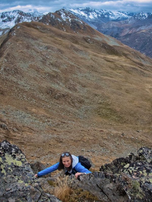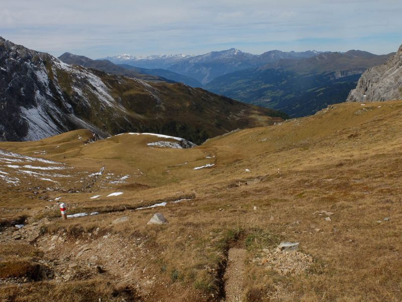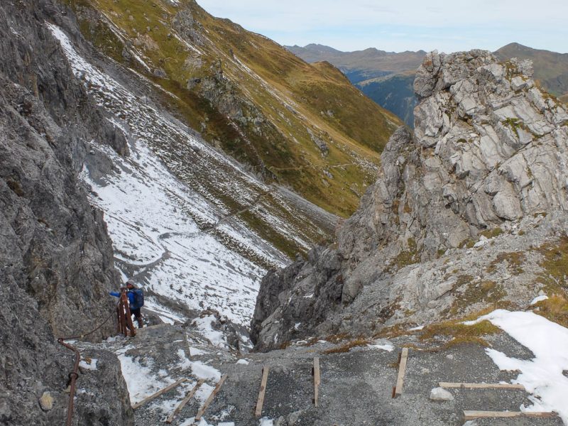 Hier standen wir schon einmal in strömendem Regen: Eine kurze Gratwanderung vom Jakobshorn zum Jatzhorn. Der weitere, zum Jakobshorn führende Weg: