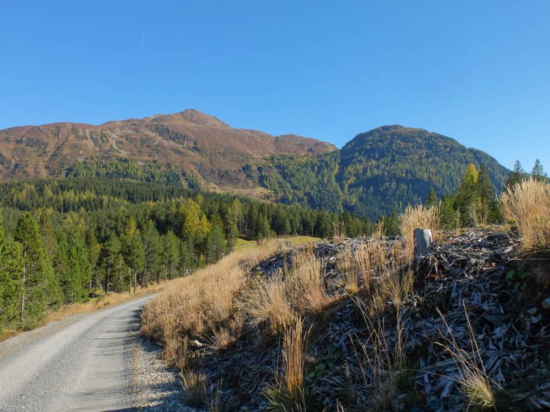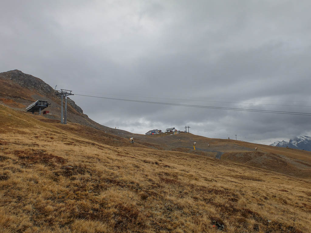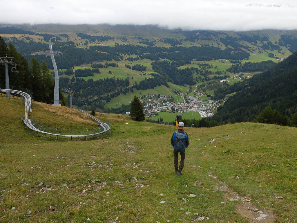 Kurz unterhalb der Bergstation verlassen wir diesen Weg und steigen direkt über die Skipisten ab. Ohne Schnee sieht das Gebiet sehr ungewohnt für mich aus, Jatzhütte und Jatzpark sind fast nicht wiederzuerkennen: