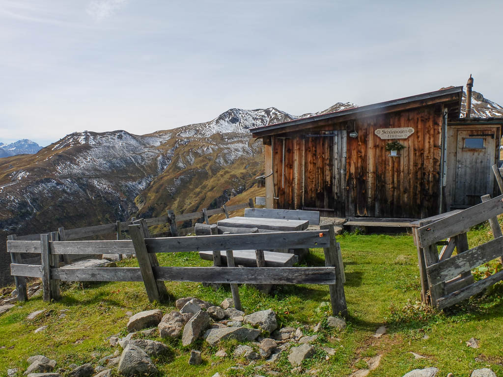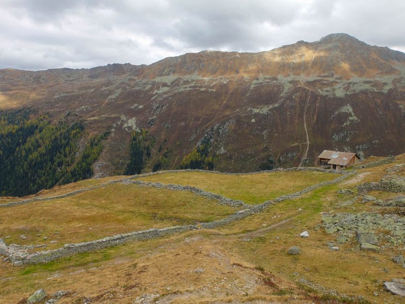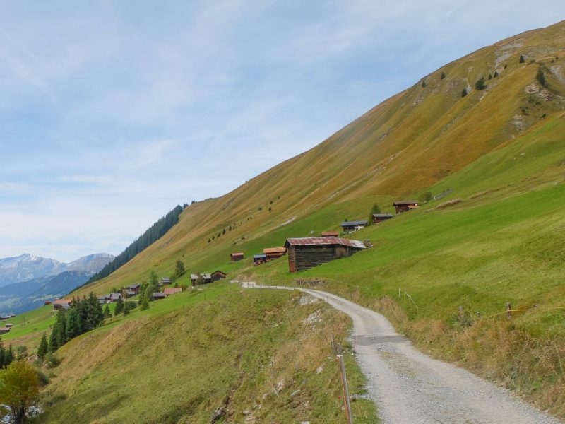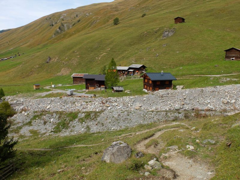 Hier endet der Fahrweg und über den Wanderweg geht es dann deutlich weniger steil weiter Richtung Tällifurgga. Ein Blick zurück auf die Alp: